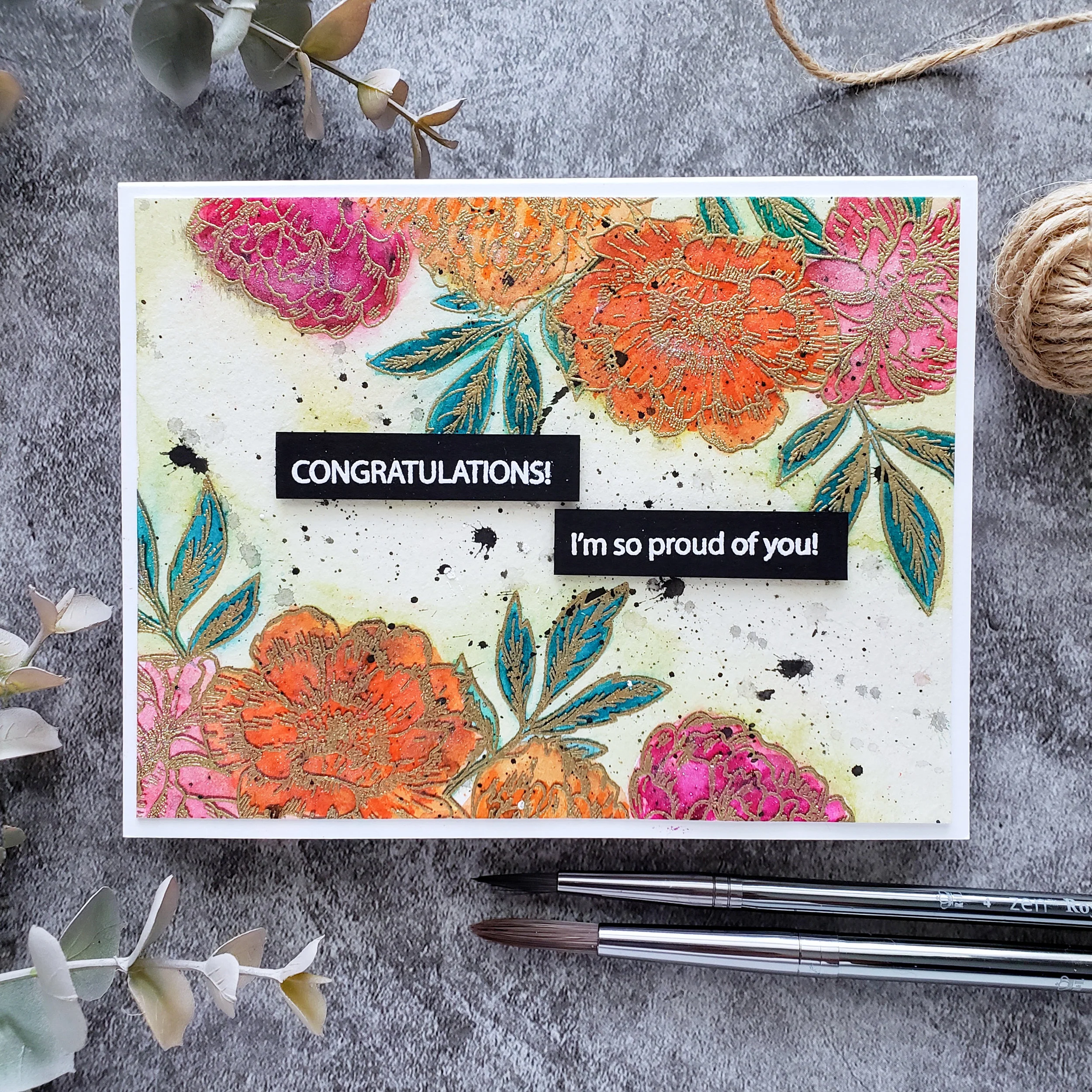 For my third and last example, I created a type of Messy Abstract watercolor painting as the card panel. And, for that I started by gold heat embossing with Detail Gold embossing powder the largest floral image from the stamp set in a piece of Canson watercolor paper. I heat embossed it twice, one on top and one on the bottom of the card panel. Then, I water colored with a mix of the Prima Marketing Confection in Odyssey, Decadent and Complexion watercolor sets + Zig color brush pens. The watercolors that I used for the card panel were #33, #34 from the Decadent set. For the flowers I used a mix of #76 Maui, #82 Inca, #74 Rome, #83 Budapest, #80 Jamaica, #81 London. Plus, Scarlet Red, Pink, Dark Pink by Zig color brush pens. And, for the splatters I used #12 Black.