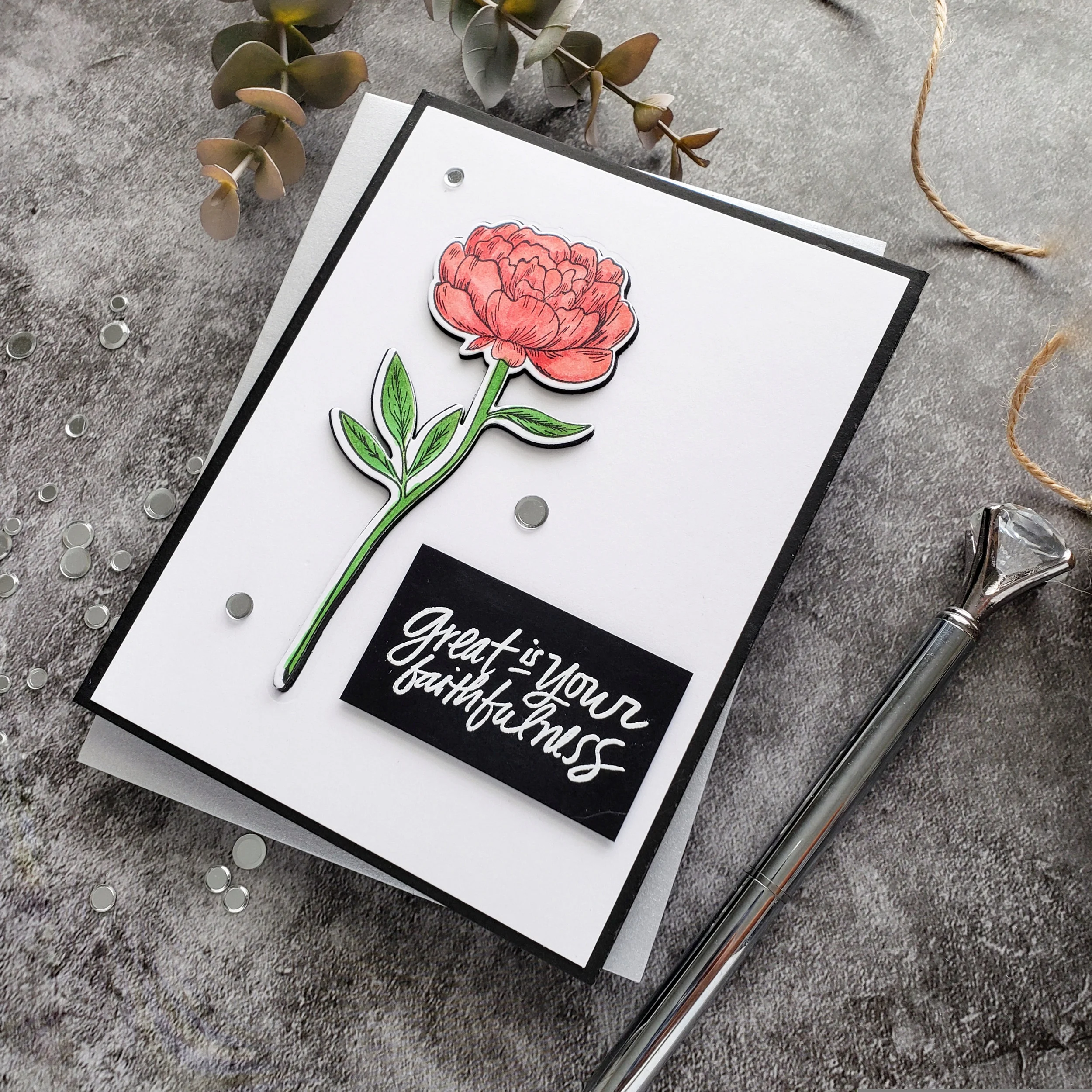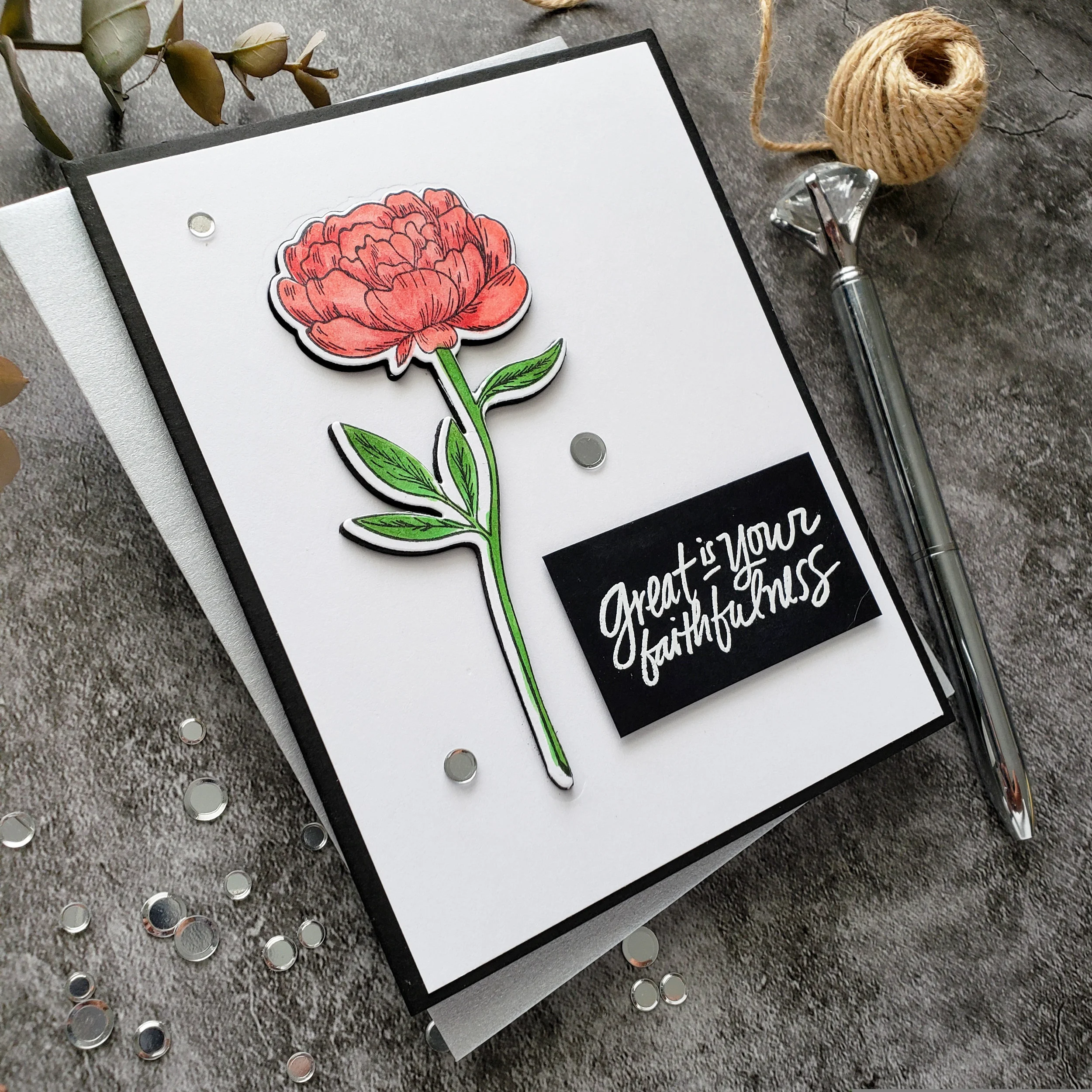 After the coloring, I used the coordinated die once again. To die cut a dimensional piece out of black foam fun and I adhered to the backed of the flower with liquid glue layering it on top of the card base. Last but not least, I white heat embossed one of the sentiments from the Spiritual Sentiments stamp set with Detail White embossing powder in a piece of black cardstock. And to finish it up I added a little bit of shimmer with the Nuvo Aqua Shimmer Pen and I added Silver Lining sequins as embellishments.