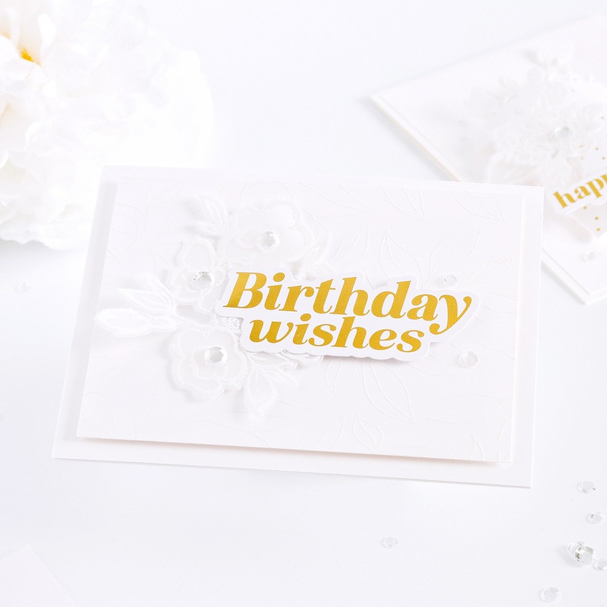 Happy Saturday, Friends! In today’s blog, I’d like to share with you a clean and simple inspirational set of birthday cards with a white-on-white “Textured, Dimensional & Glimmering” look using the following stamps and dies sets; Beautiful Birthday Bouquets Stamp, Beautiful Birthday Bouquets Dies, Scalloped Layered cake Dies, and Confetti Dots Hot Foil by The Stamp Market. Also, I used some of the foiled phrases from the Foiled Phrases Gold ephemera pack for the cards sentiments. So, without further ado, let’s jump right into the step-by-step for how I made them ↓