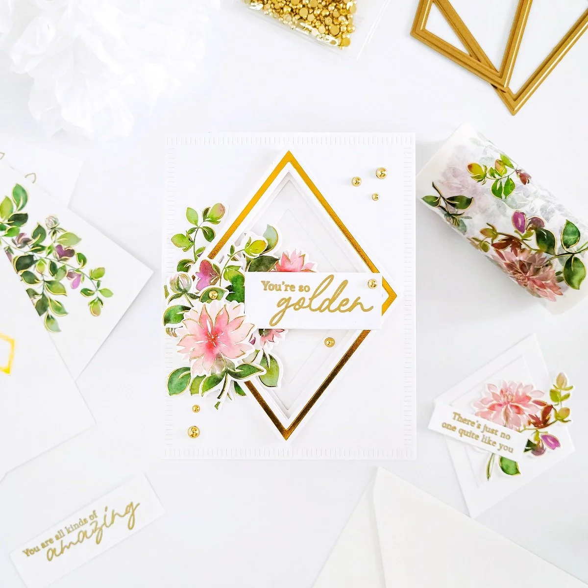 Having that said, as soon as, I’ve had finished die-cutting the floral shape images out from the cardstock panel, I went ahead to glue down with liquid glue the largest floral shape from all to the left side of the diamond shape over the card. Then, to add the last dimensional layer to it, I went ahead to do some hot foil stamping over a large piece of white cardstock using the largest hot foil plate included in Nested Diamonds Hot Foil along with a piece of Glimmer Hot Foil Roll - Polished Brass and the Glimmer Hot Foil System Platform for the hot foil stamping process.