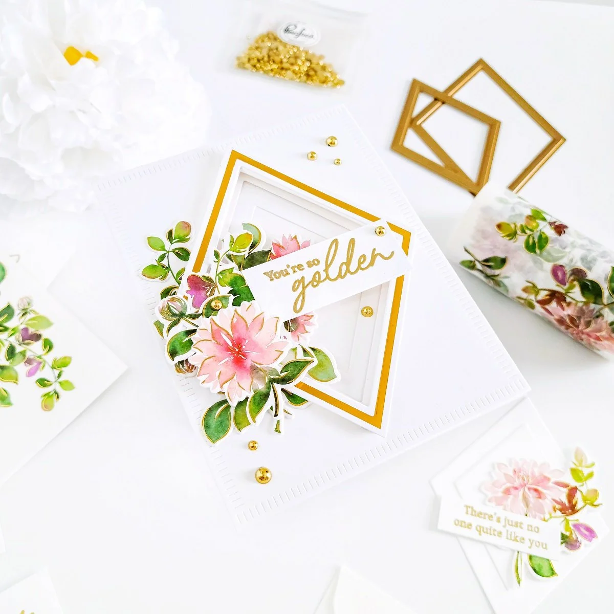 Happy Wednesday, Friends! On today’s blog, I’d like to share with you an extra glimmering “Geometric & Floral” inspiration card made using: Nested Diamonds Hot Foil, Nested Diamonds Die, Dahlia Washi, Dahlia Washi Die, and Dahlia Washi Stamp from March-2022 Washi, Stamp, Die, Stencil & Hot Foil Release by Pinkfresh Studio. Along with these sets, I’ve also used Blanket Stitched Rectangles Die Set to add the decorative stitching details to the card front panel and Metallic Pearls -Gold to add an extra pop of sparkle to the card. So, without further ado let’s jump right into the step-by-step for how I made it ↓