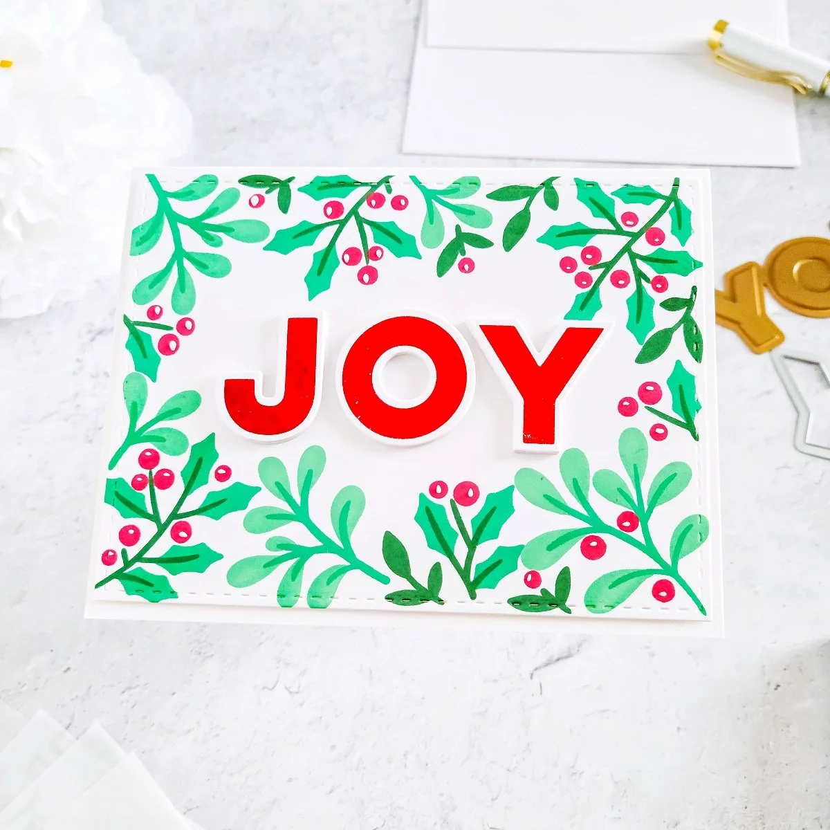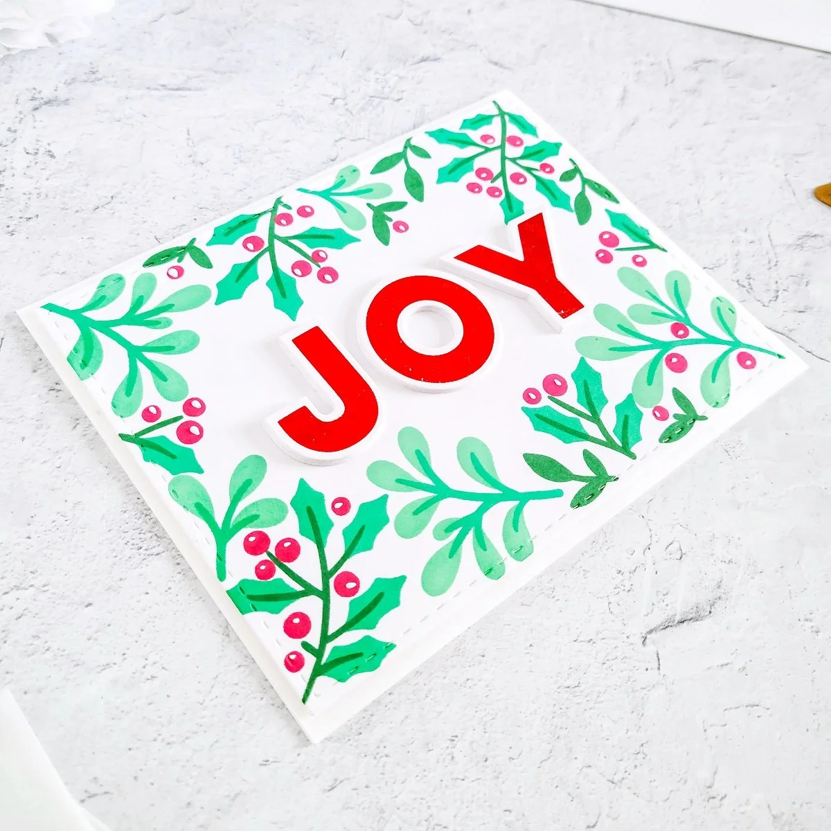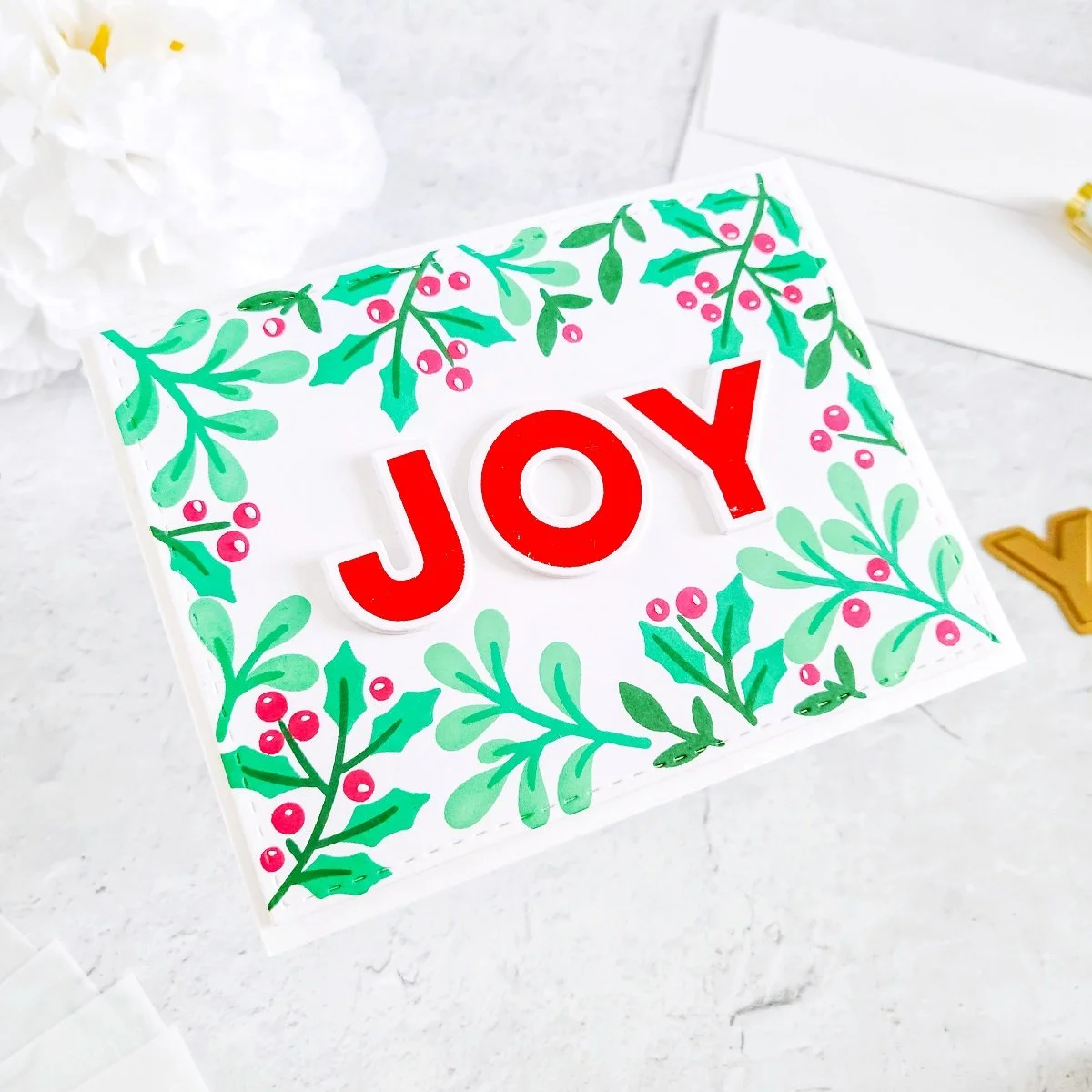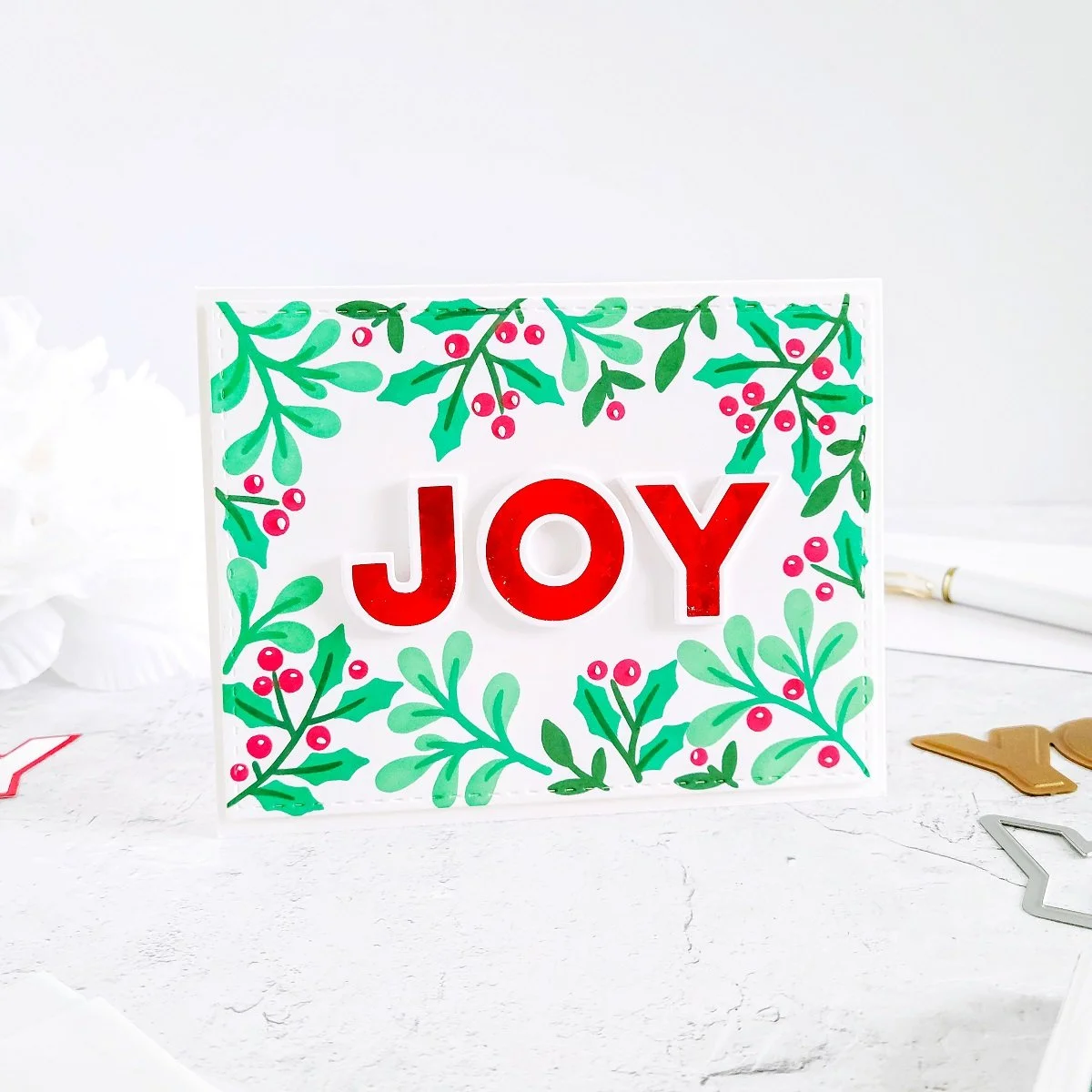 Happy Wednesday, Friends! On today’s blog, I’m back with another holiday card so, I’d like to share with you a very quick and simple inspiration card made with a “Botanical & Foiled” look using: Joy Hot Foil and Joy Die for the card sentiment. Along with them, I used Holiday Botanical Background Stencil to add the botanical look. And lastly, PFS- Inks to add the pops of colors to the card background. So, without further ado let’s jump right into the step-by-step for how I made it ↓