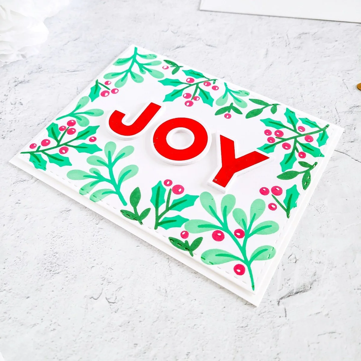 Nevertheless, after getting the reverse hot foil stamping step completed, I went ahead to put that off aside to start the card assembling. Thus, for the card assembling, I went ahead to use the large die included in Essentials: Stitched Rectangles Die Set to cut out and add the stitching details to the edge of the card background. Next, I went ahead to get the backing of the card background mounted with Double Sided Adhesive Foam over an A2 size side folding white card base in a landscaping form. Then, after getting the card background adhered to it, I proceeded to glue down the dimensional Joy word in the center of the front card panel. And, last but not least, I decided not to add extra embellishments to let the foil stand out but, I did add up some details to the berries by using a Handmade Glass Dip Pen along Dr. Ph. Martin's Bleedproof White Fine Art Paint.