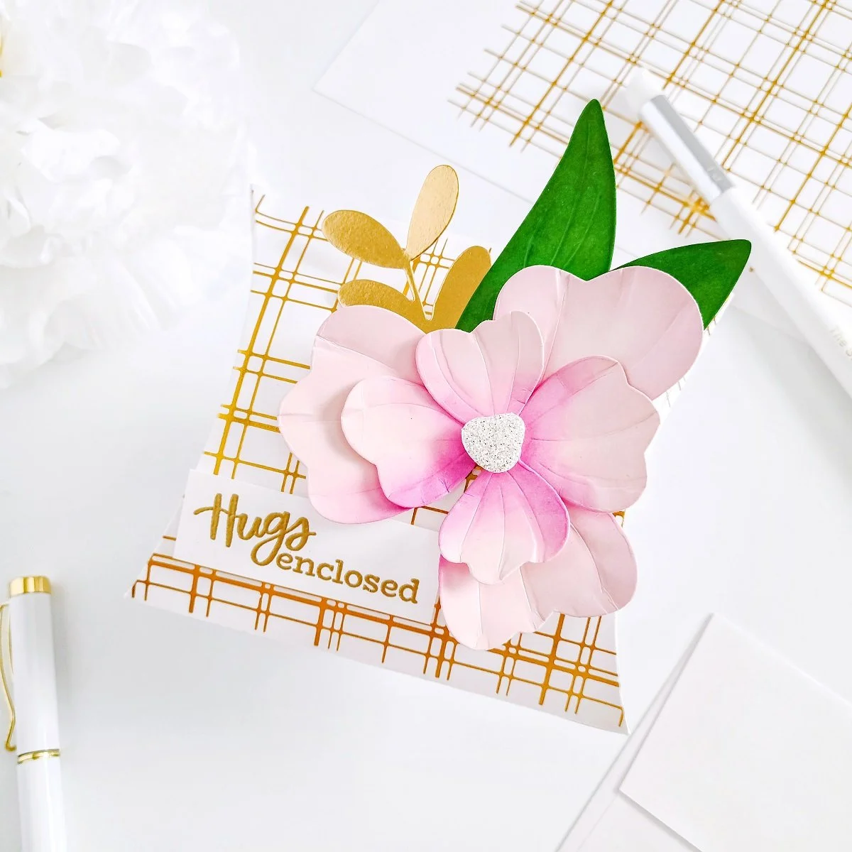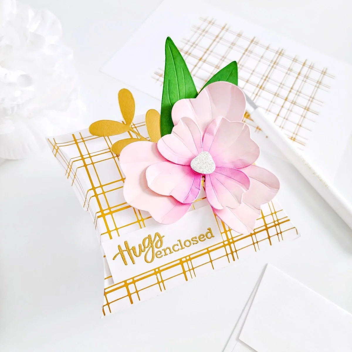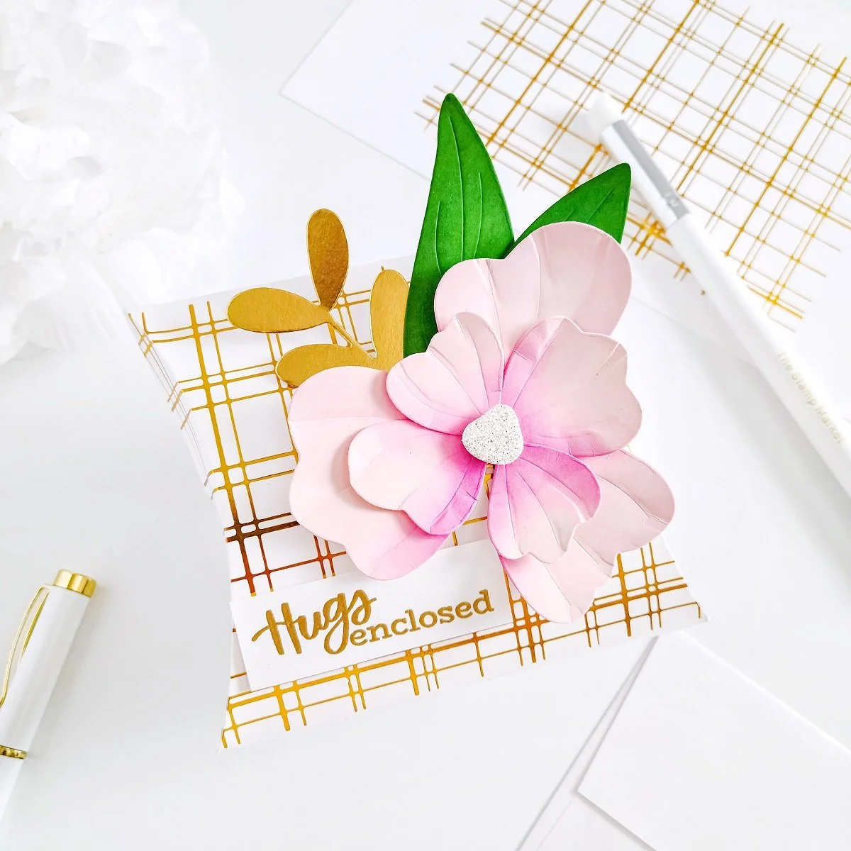 Moving on, after getting the petals and leaves cut out from the plain white cardstock, I proceeded to line them up over my Stamp N Scratch Pad to add pop of colors to them using a few ink blending brushes and Detail Blending Brushes to ink up their centers. The hues used to ink them up were Cotton Candy Ink, Fresh Pink Ink, and Orchid Ink for the petals + Cactus Ink and Forest Ink for the leaves. Having that being said, as soon as I had finished adding the pops of colors to them, I went ahead to put together the 3-Dimensional flower and then, I created a cluster using the leaves along with a gold die-cutting greenery which I’ve had created using the large die including in Holiday Greenery. Lastly, I went ahead to mount the 3D floral cluster over the right side of the mini gift and then, I finish it off by adding a stamped and gold heat embossing greeting on the lower left side of the gift. A sentiment made using one of the sentiments including in Sending Paper Hugs Stamp.