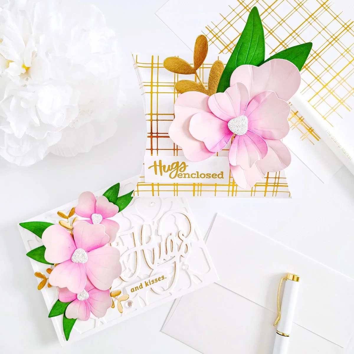 Happy Sunday, Friends! On today’s blog, I’d like to share with you a cute “Valentine’s Day” mini gift and matching inspiration card made with a dimensional floral and glimmering look using: Posie Perfection Cover Die, 3D Large Perfect Posy Die, 3D Perfect Posy Dies, Heart N Hugs Stamp, Heart N Hugs Die, Heart N Hugs Foil Plate, and Simply Plaid Foil Plate from the newest release by The Stamp Market. Along with this set, I used Pillow Box Die to create the mini gift and Holiday Greenery to add the gold greenery for the card. So, without further ado let’s jump right into the step-by-step for how I made them ↓