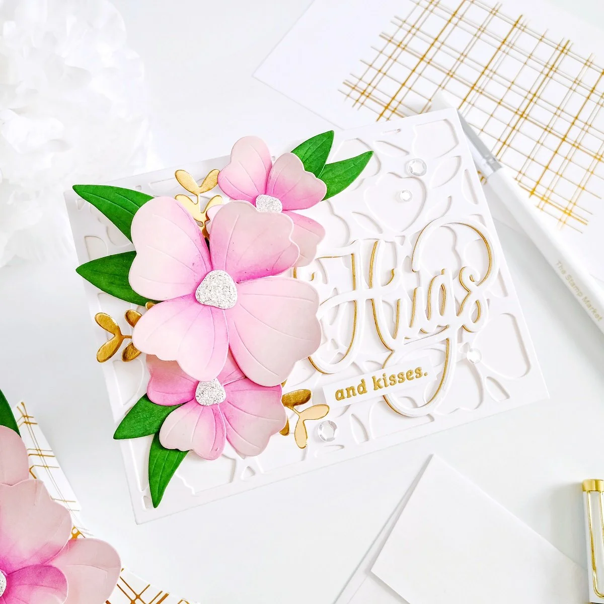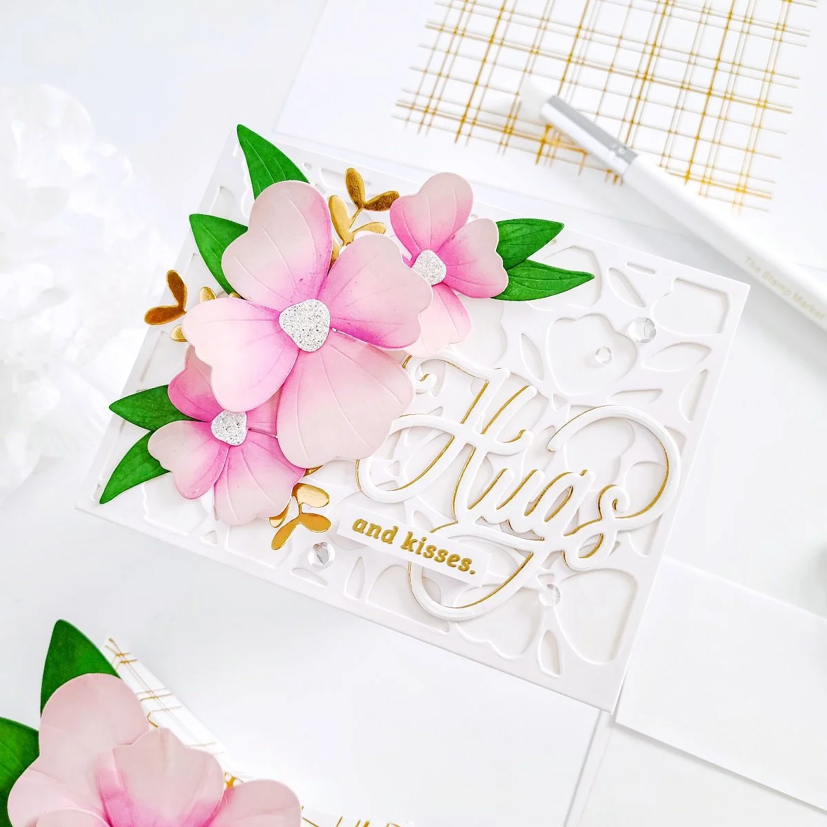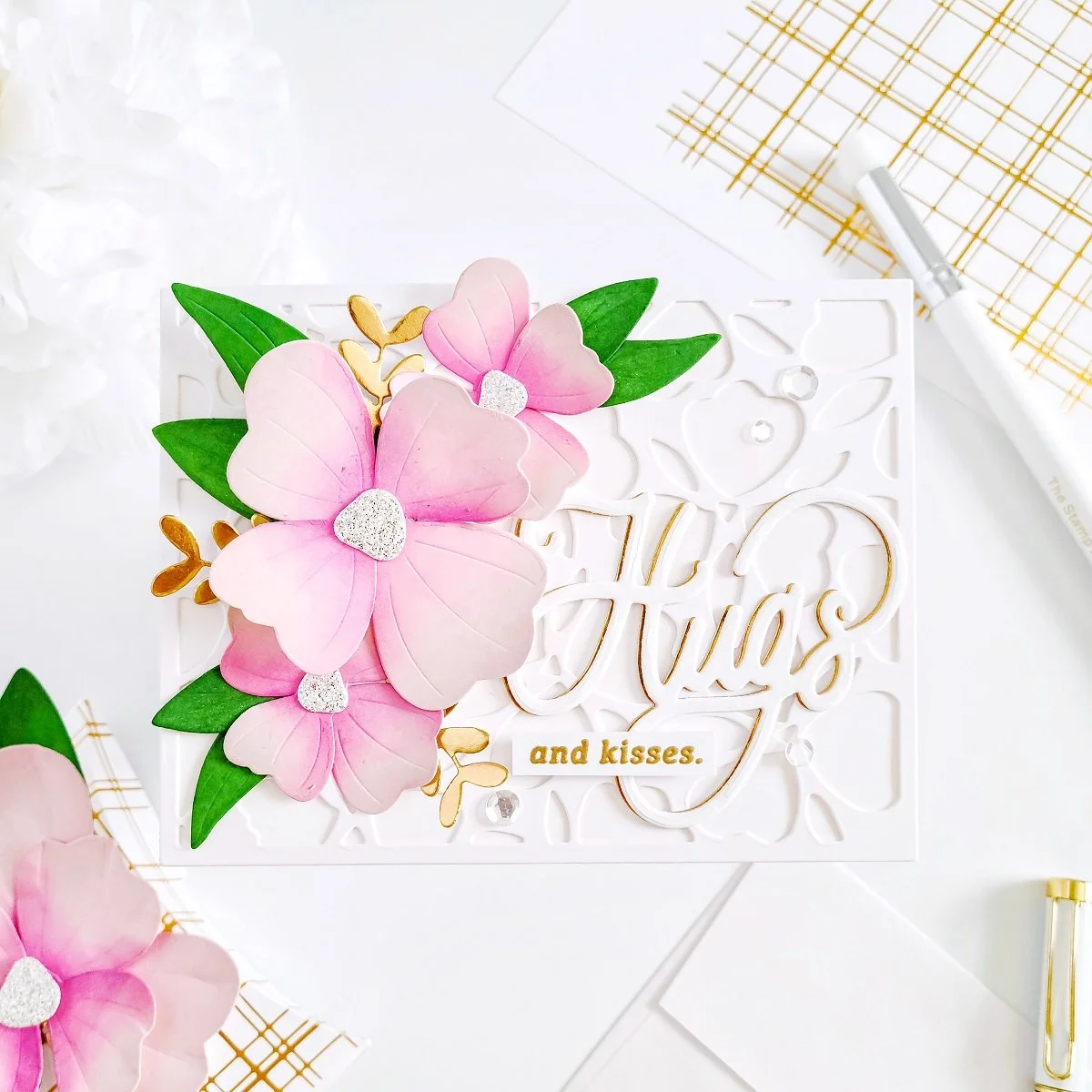 Lastly, to create the die-cutting Hugs sentiment, I went ahead to use the hugs die including in Heart N Hugs Die to cut it out from white and gold cardstock to create a gold shadow for it. Then, to complete the hugs sentiment, I used a card sentiment including in Heart N Hugs Stamp. By the way, the stamp set includes the coordinating hugs stamp to stamp over the die-cutting hugs. However, I decided to skip that step for a more subtle look as I already had lot of dimension from the flowers. Also, if you’re into hot foil stamping I would like to mention that this set has Heart N Hugs Foil Plate as well.