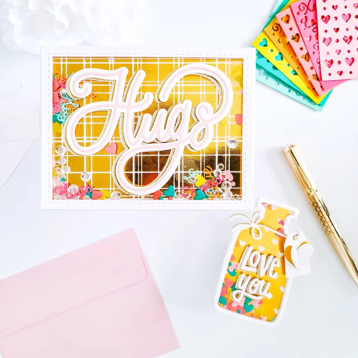 Happy Monday, Friends! On today’s blog, I’d like to share with you a glimmering set of “Shaker” inspiration cards made with a colorful look using: Hugs Layering Die, Love Potion Shaker Die, Love & Confetti Die, and Hugs Layering Die to make the shaker designs. Also, Bold Hearts Hot Foil Plate and Simply Plaid Foil Plate from the newest release by The Stamp Market. Along with this set, I used Solid Hot Foil Plate by Pinkfresh Studio to create the reverse hot foil stamping for the card backgrounds. So, without further ado let’s jump right into the step-by-step for how I made them ↓