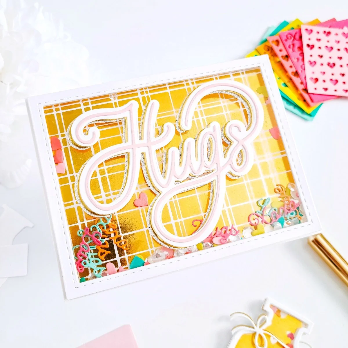 Moving on, after getting the die-cutting process completed, I’ve gone ahead to trim the edges down from the hot foil stamped card panel and then, I created the shaker window over it using the die-cutting frame and die-cutting shaker bits. Next, to add even more shine, I added Crystal Confetti as well. Also, I used acetate and craft foam adhesive to seal the shakers frame. Lastly, I went ahead to finish the card off, so to do that, I layered the large Hugs word by layering all pieces together a little bit offset to the right creating that way a slightly glittery and gold shadow. Having that being said, I went ahead to get mounted layered word over the shaker window and then, I moved on to make the second example.