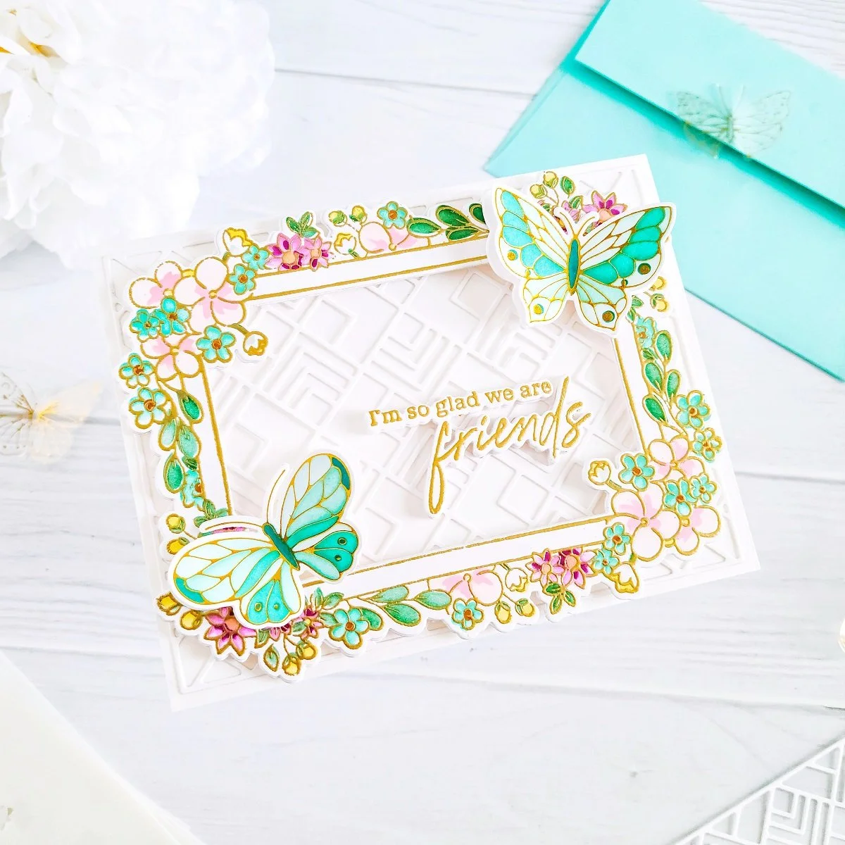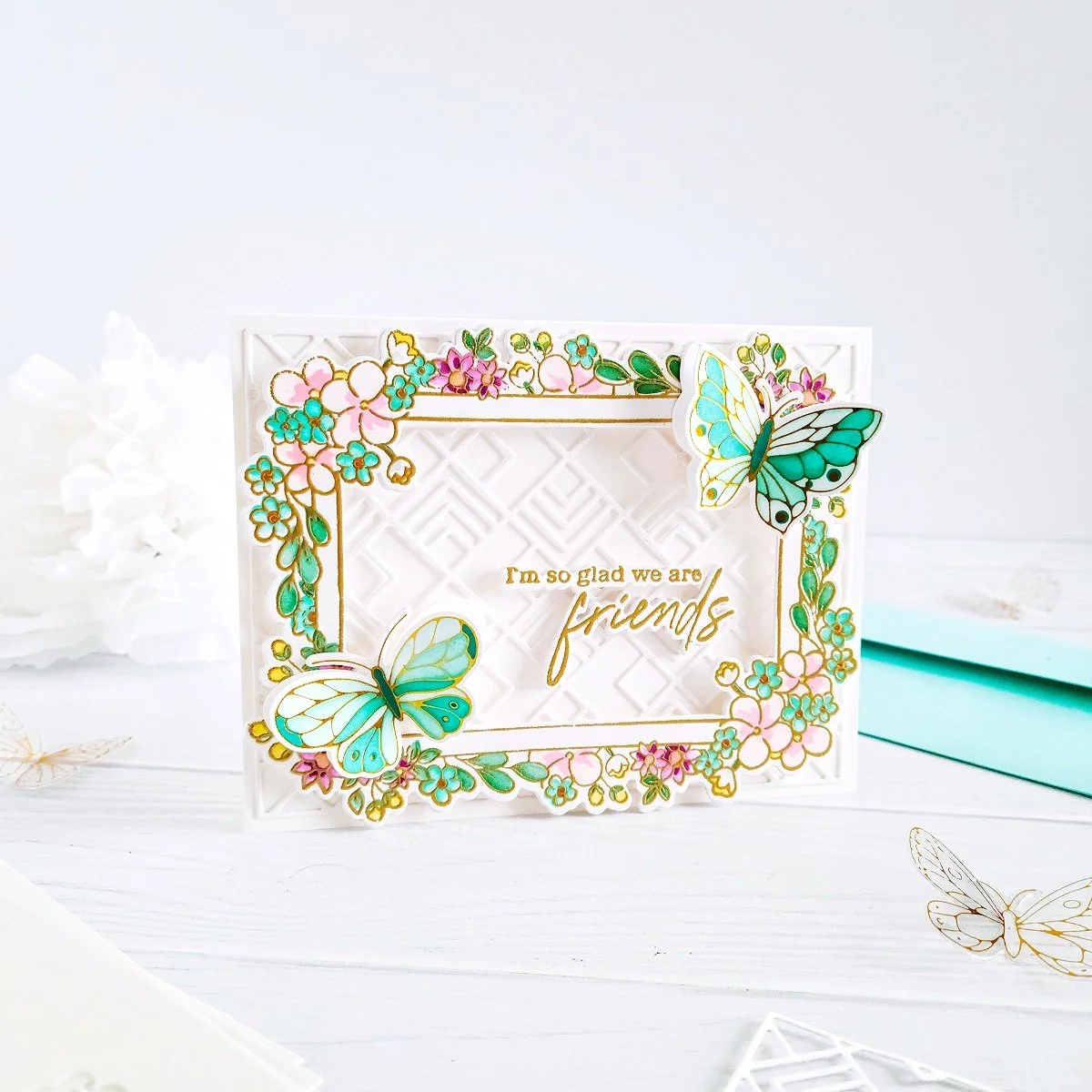 Lastly, after I had finished adding the pops of colors to the floral frame, I went ahead to start the card assembling so, to do that, I went ahead to glue down over an A2 size side folding white card base in a landscaping form and intricate yet delicate card background; a card background which, I had gotten previously cut out from white cardstock using Geo Tiles Cover Plate Die. Next, I’ve got mounted the floral frame over it using square foam adhesives to add a little bit of dimension. Then, I went ahead to glue down the butterflies in the lower left and upper right corners of the floral frame. And last but not least, I went ahead to glue down the card sentiment; a extra dimensional card sentiment which, I created by using one of the card sentiment stamp image and its coordinating die both included in the same set used to create the floral frame.