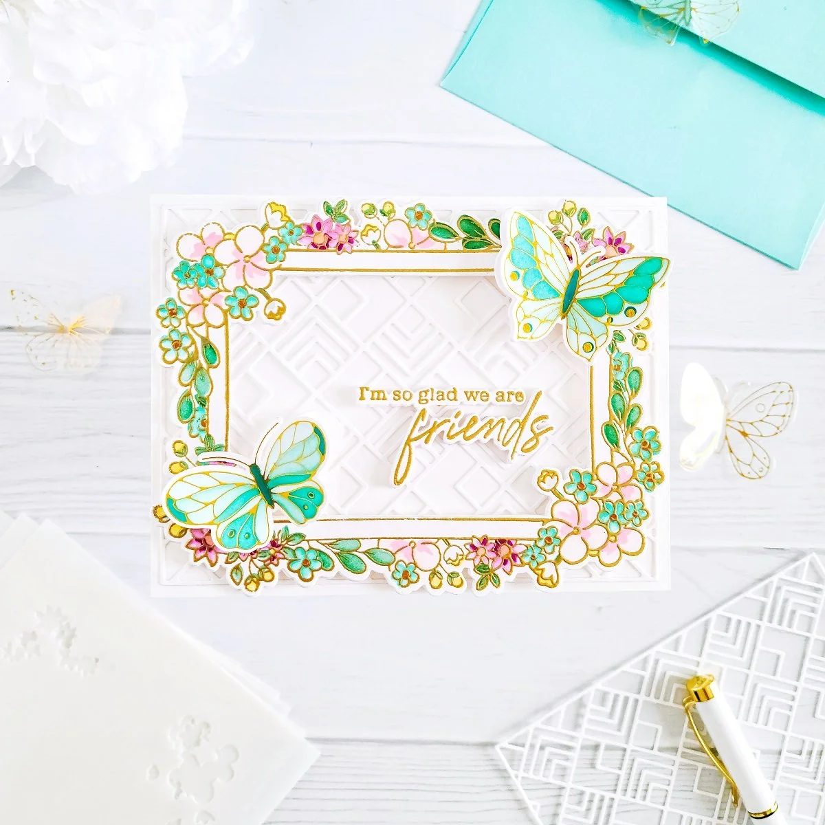 Happy Friday, Friends! On today’s blog, I’m taking a break from holiday cards so, I’d like to share with you a very delicate friendship inspiration card made with a “Floral & Golden” look using: In My Heart Stamp, In My Heart Stencils, and In My Heart Die to create the floral frame. Along with this beautiful set, I used Small Butterflies Hot Foil Plate, Small Butterflies Layering Stencil, and Small Butterflies Die to add the butterfly touch to the floral frame corners. And lastly, Geo Tiles Cover Plate Die to add the intricate background plus, PFS- Inks to add the pops of colors to the card elements. So, without further ado let’s jump right into the step-by-step for how I made it ↓