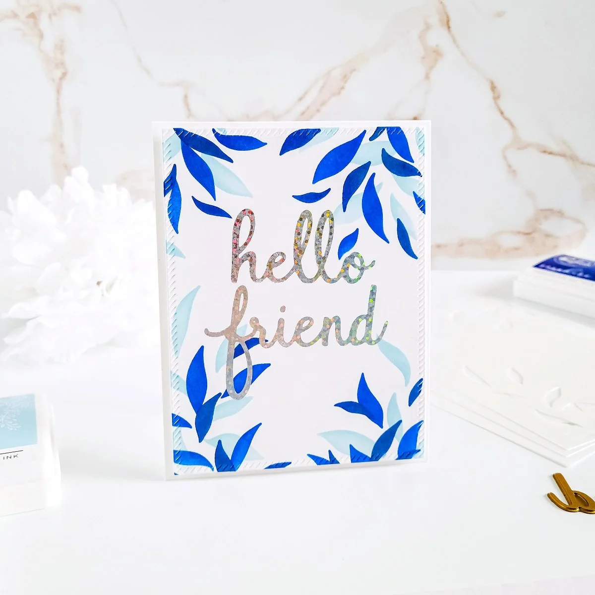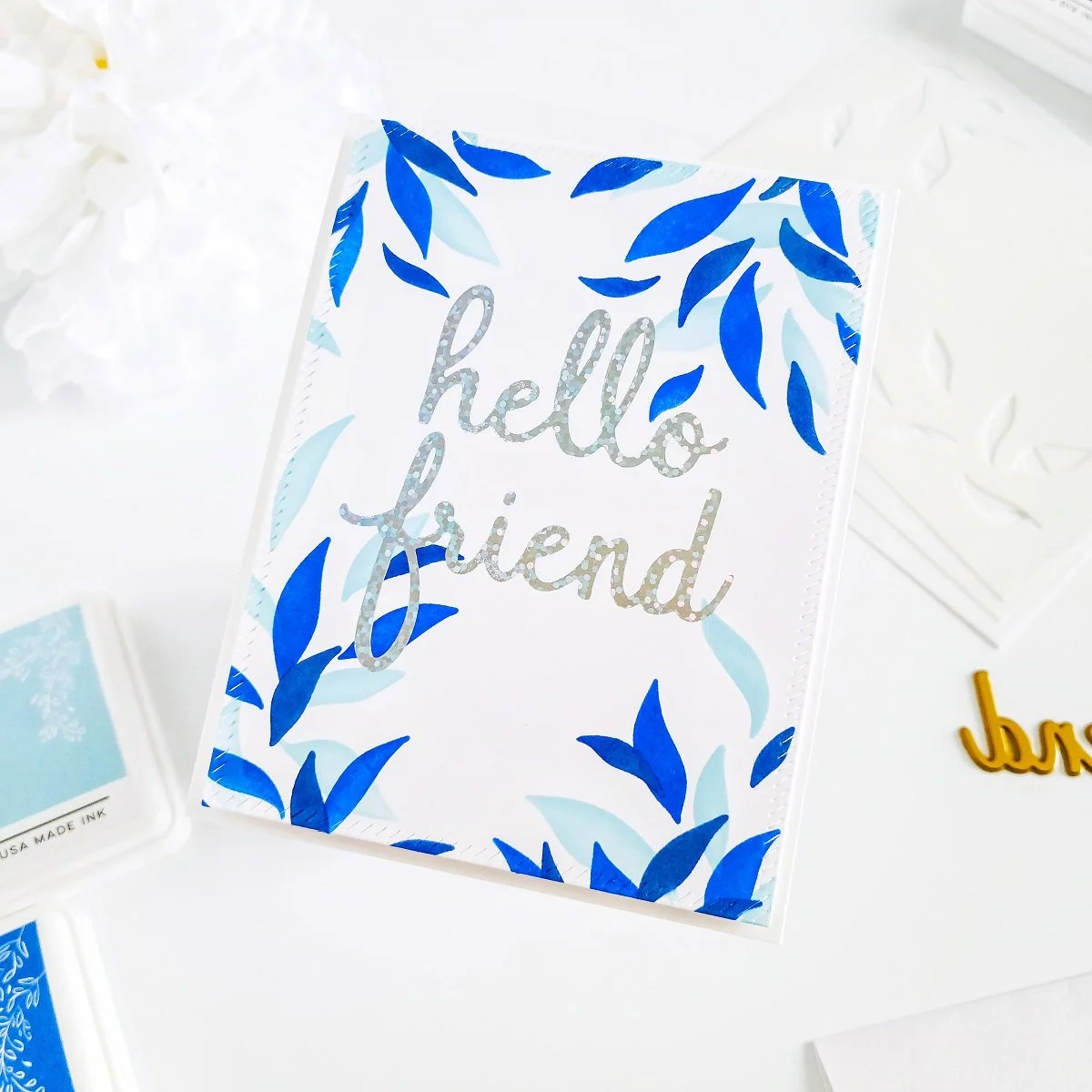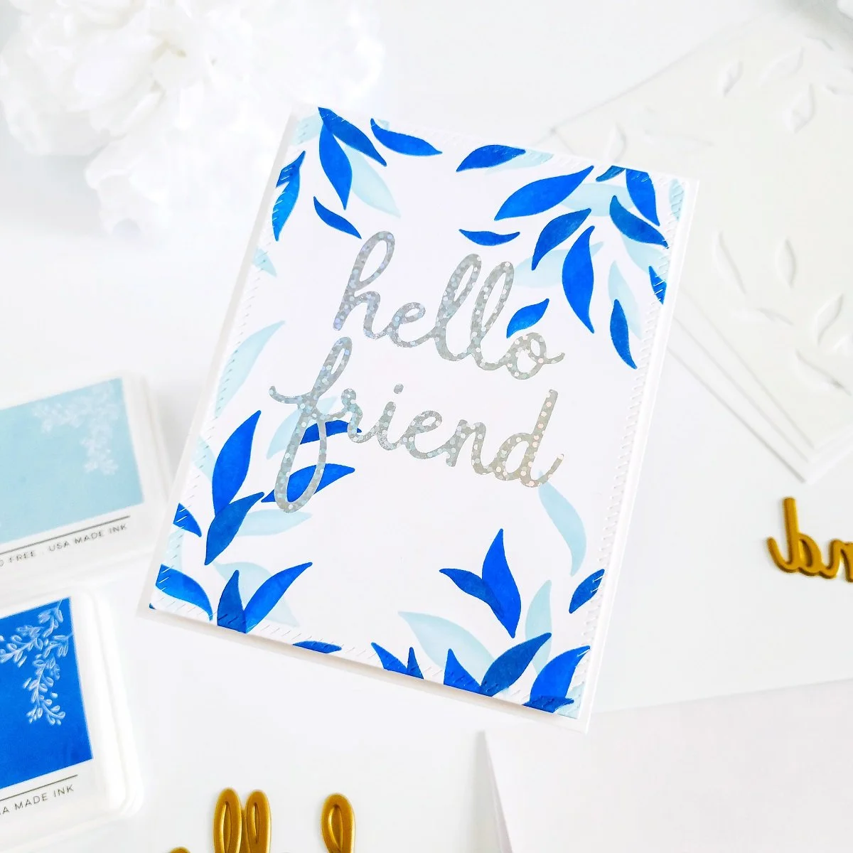 With that being said, today I’d like to share with you a quick and simple friendship inspiration card with a “Leafy & Glimmering” look made using the just released: Phrase Builder: Hello Hot Foil and Leafy Background Stencils. Also, PFS- Inks to add the pops of colors to the leafy background. So, without further ado let me share how I made it ↓