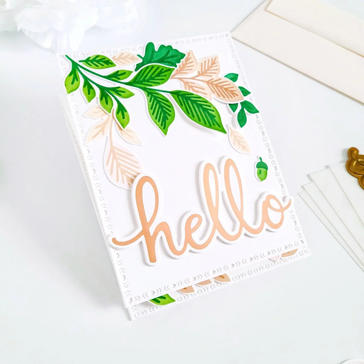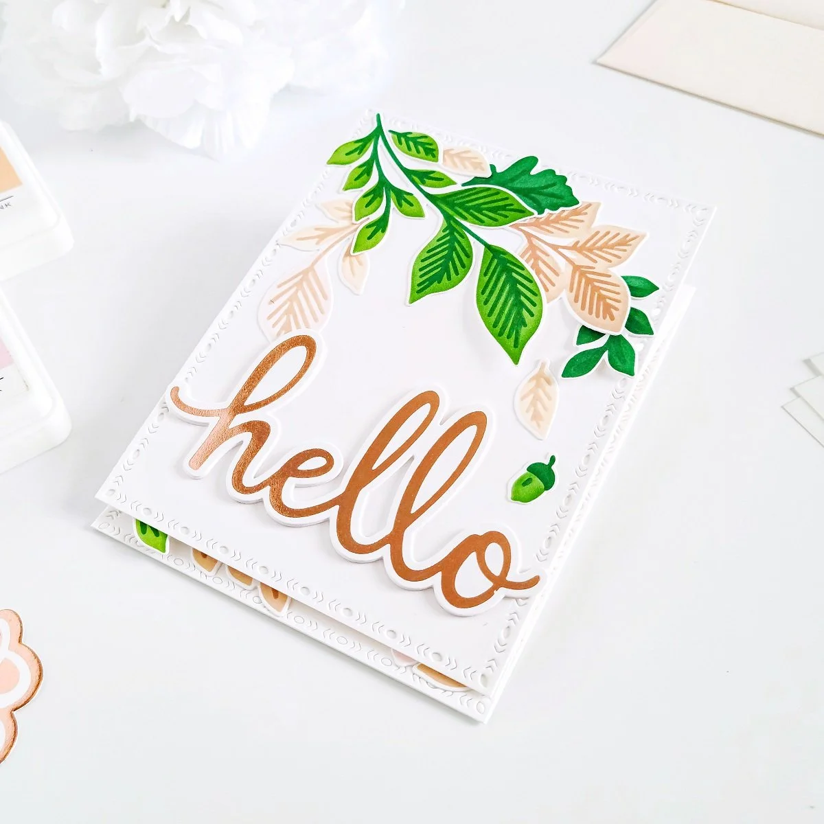 Once, I had that step completed, I proceeded to put the die-cutting hello sentiment aside while, I got the layered stenciling started for the leaves. So, for the leaves, I went ahead to use each stencil including in Fall Foliage Layering Stencils along with some ink blending brushes to ink up the green leaves using: Olive Ink, Evergreen Ink, and Metropolis Ink to add a little more depth to the cool green leaves. Also, Ballet Slipper Ink, Peach Fuzz Ink, Warm Buff Ink, and Doe Ink for the blush color leaves. That being said, as soon as, I had gotten finished inking it up the leaves in both hues, I had gone ahead to use the coordinating Fall Foliage Die to cut out the leaves from the pieces of cardstocks.