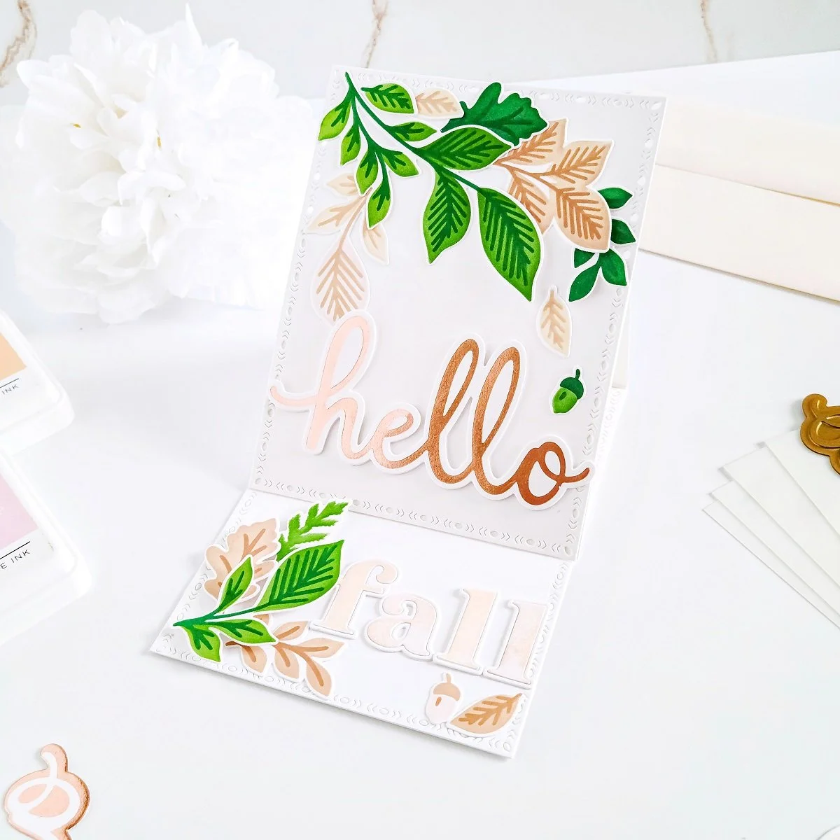 Lastly, once I had gotten the card base with the fun fold effect finished, I proceeded to get it embellished using the combination of the die-cutting leaves just as, you see them in the image above. Also, I added dimension to the foil stamped hello sentiment by stacking over some plain white die-cutting hellos. Last but certainly not least, to finish the card off, I decided to add the complimentary and dimensional die cutting Fall sentiment to the lower inside part of the card. As, I mentioned in the beginning of the post, I used Heather Lowercase Stamp and Heather Lowercase Die Set along with a combination of Ballet Slipper Ink and Peach Fuzz Ink to make the Fall sentiment.