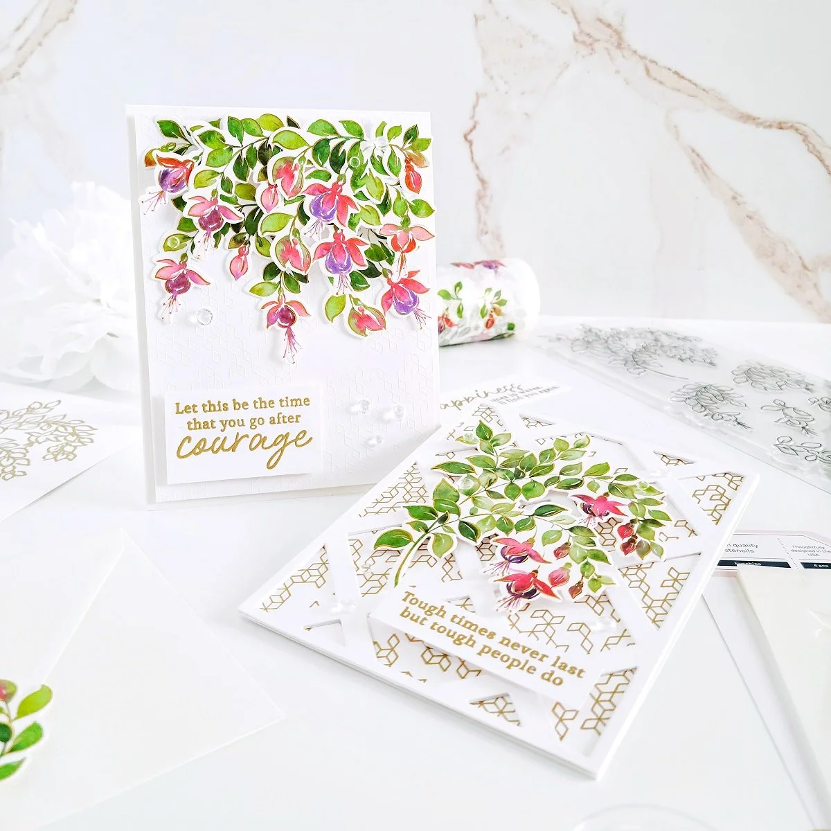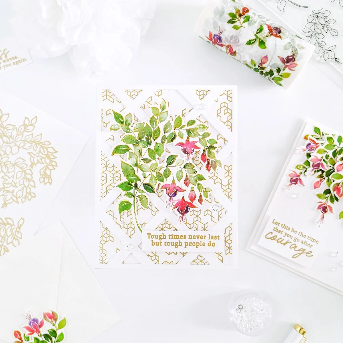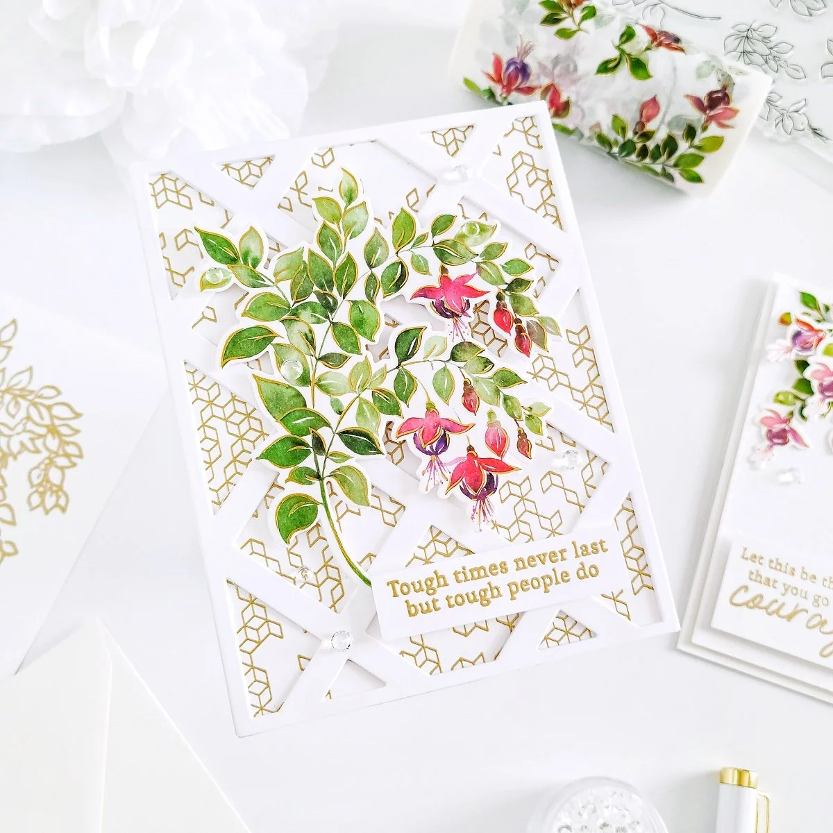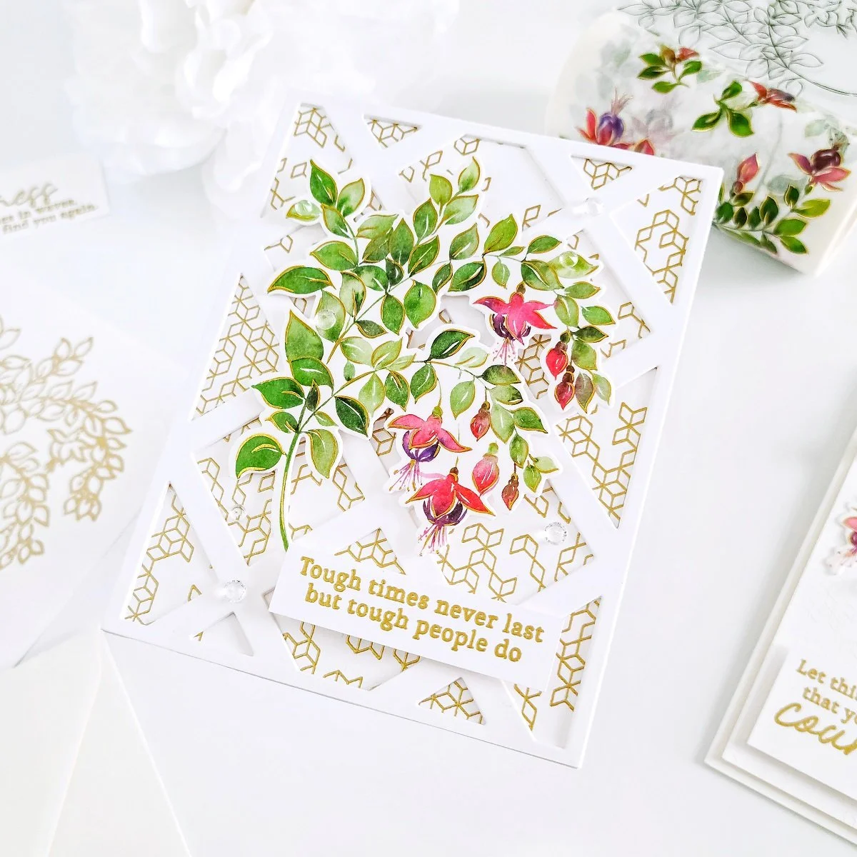 With that being said, today I’d like to share with you this delicate yet detailed set of “Encouragement” inspiration cards made using the just released: Fuschias Washi Tape, Fuschias Washi Die, and Fuschias Washi Stamp which also includes its coordinating Fuschias Washi Layering Stencils set. Along with sets, I used Simply Diamonds Die to add the dimensional die-cutting diamond background + Cling Rubber Stamp: Abstract Cube to compliment the geometrical look. Besides that, I used Essentials: Crystal Mix to add a pop of sparkle as well. So, without further ado let me share how I made it ↓