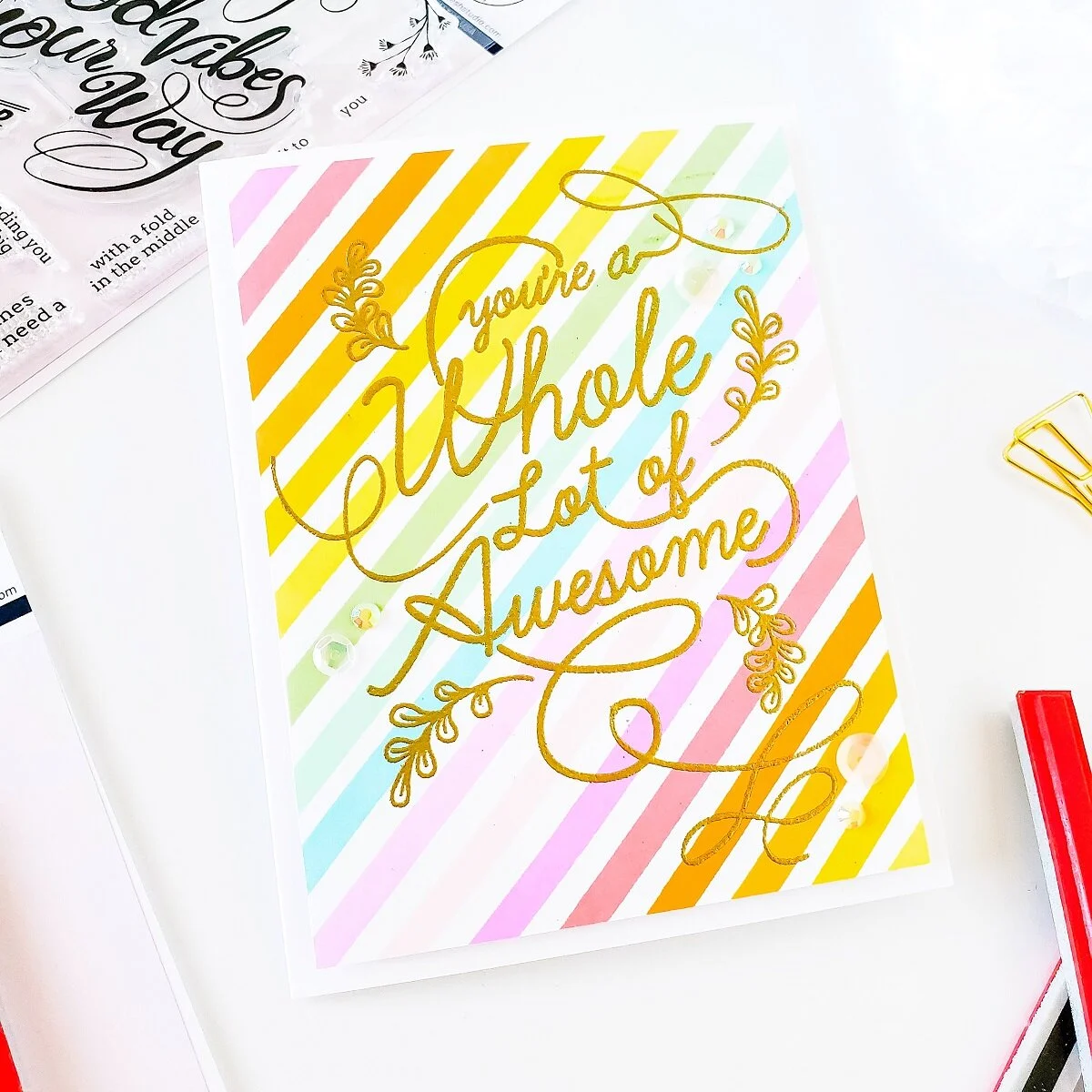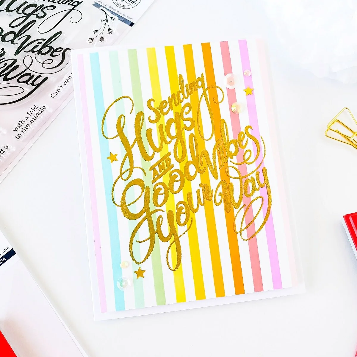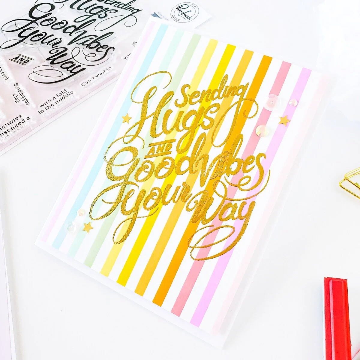 Although, both cards look similar… you definitely can see the difference between them as this was stamped using POP OUT Straight Stripes Background Stamp and the sentiment was stamped and gold heated emboss using Hugs and Good Vibes Stamp Set instead. Other than that, the process was basically the same.