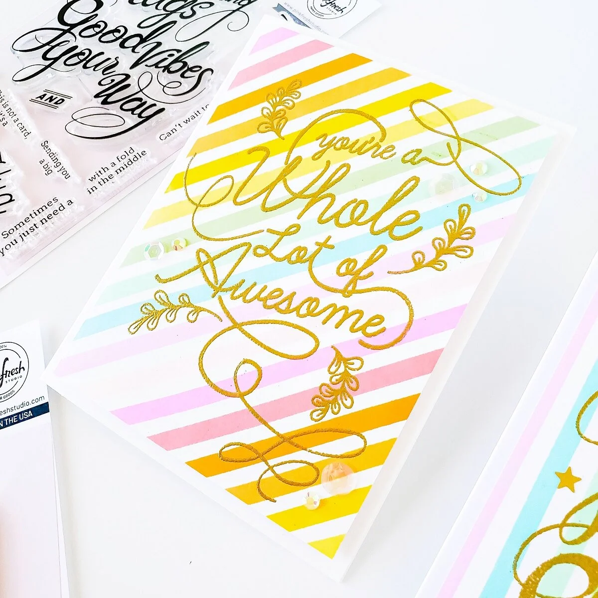 Happy Thursday, crafty friends! Do you love stripes? If so, I hope you like these 2 “Striped” inspiration cards made using POP OUT Diagonal Stripes Background Stamp and POP OUT Straight Stripes Background Stamp by Pinkfresh Studio. So, without further ado let’s jump right into the step by step on how I’ve made them ↓