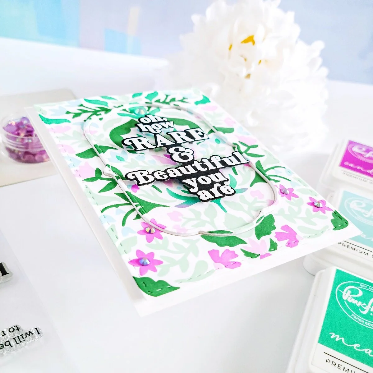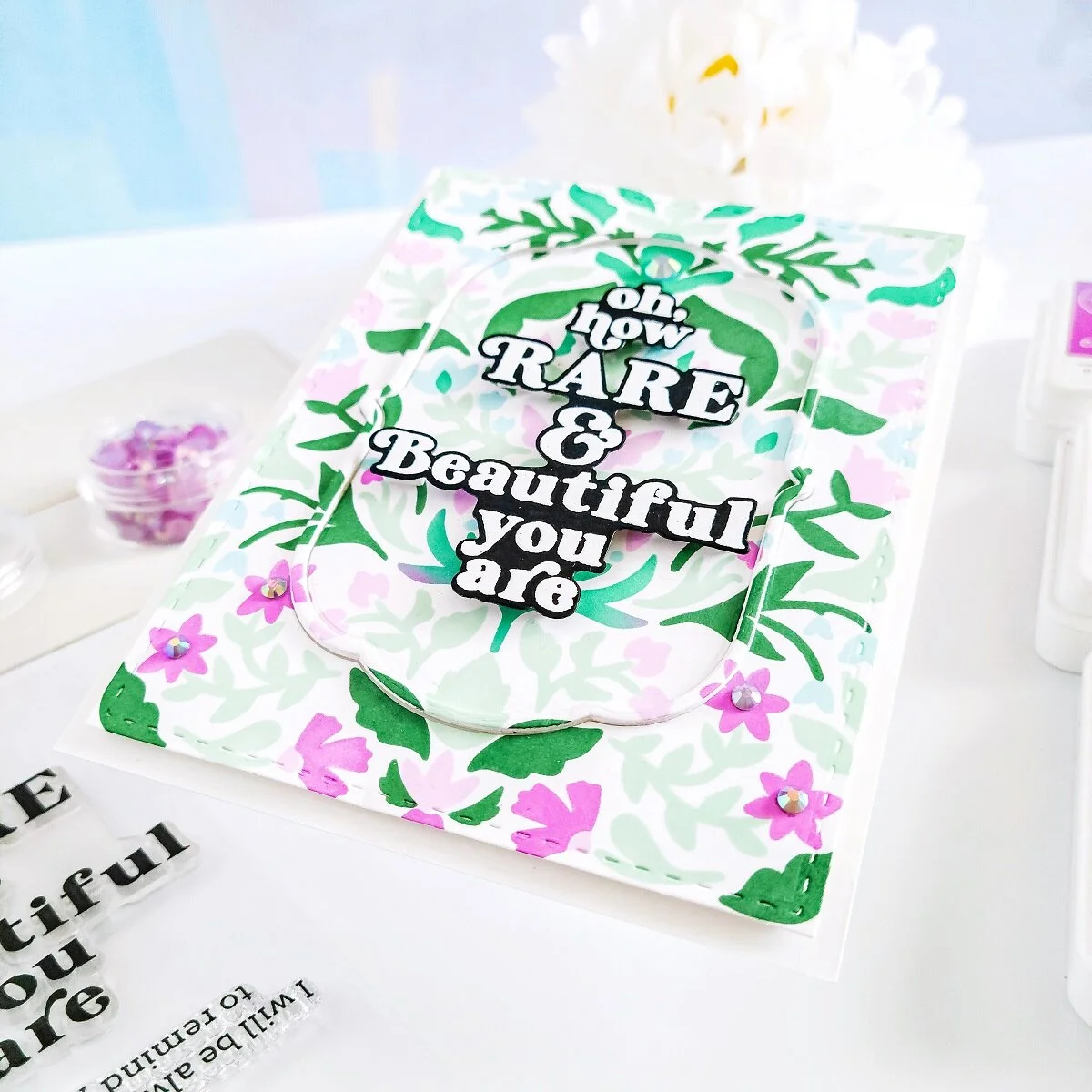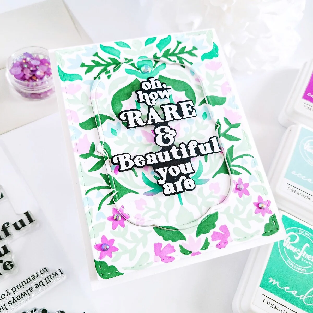 Happy Sunday, Friends! On today’s blog, I’d like to share with you a beautiful “Friendship” folk inspiration card made using Rare & Beautiful Stamp Set and Rare & Beautiful Die. Along with this fabulous floral set, I’ve also used Folk Floral Print Layering Stencil Set to create the folk background + Essentials: Pretty Frames Die Set and Essentials: Stitched Rectangles Die Set to add the stitching and die-cutting details. Also, I’ve used Jewels: Lavender to embellish the card + PFS- Inks to add the pop of color to the card background. So, without further ado let’s jump right into the step-by-step for how I made it ↓