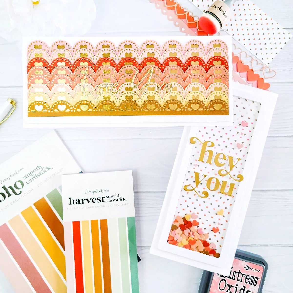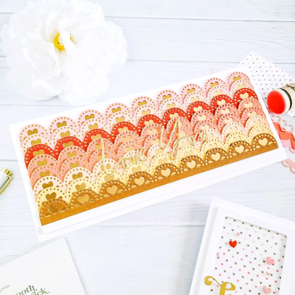Therefore, I started off by creating a few decorative and intricate die-cutting heart edges using one of the dies included in Decorative Die Set - Slimline - Borders 2 along with some of the colors from the following paper pads: Boho - Smooth Cardstock Paper Pad, Floral - Smooth Cardstock Paper Pad, and Harvest - Smooth Cardstock Paper Pad. Thus, to do that, I went ahead to line up the die over each colored cardstock and then, I went ahead to run them through my Sizzix - Big Shot Switch Plus Machine. Next, once I had that step completed, I proceeded to use the coordinating die to cut out the same number of solid edges from gold cardstock. So, as soon as, I had finished cutting them all, I proceeded to glue down the intricate die-cutting edges to the solid die-cutting edges and then, I continued to get each of the layered edges adhered to a slimline size white front card panel just, as shown in the image above. Lastly, to add a decorative edge at the end or underneath the decorative edges, I went ahead to use one of the dies included in Decorative Emboss and Die Set - Stitched Border Strips to cut it out from white cardstock and to get the embossed stitched effect. By the way, to even up the dimension, I got the white strip adhered to the card panel using Double Sided Adhesive Foam 1/4 Roll.