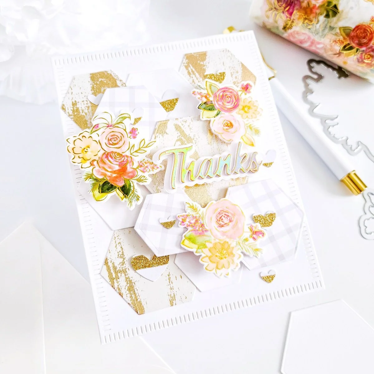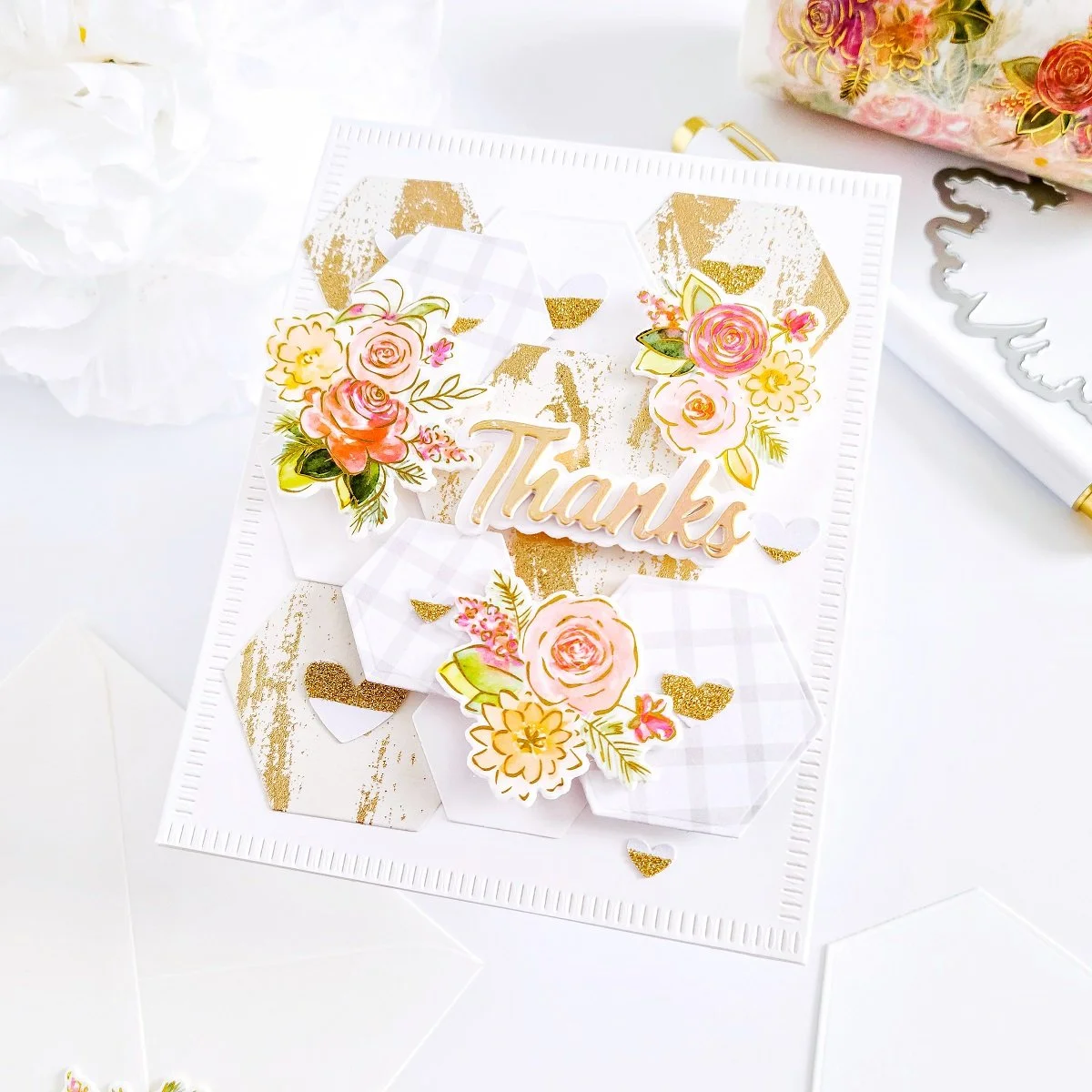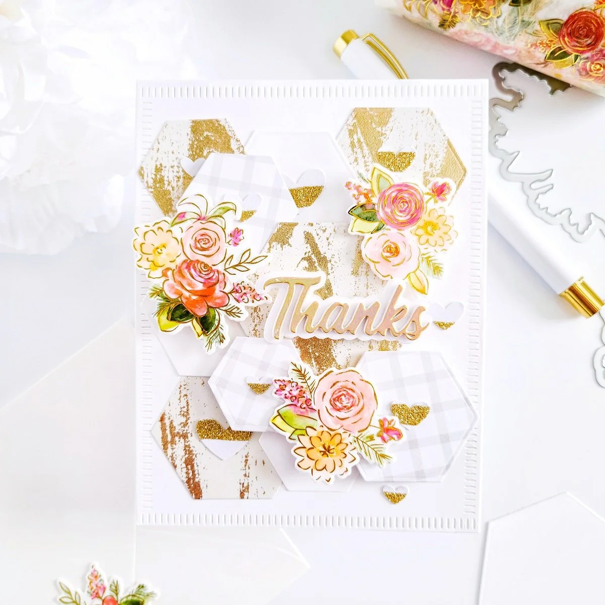 Once, I got the die-cutting hexagon mounted over the card front panel, I quickly went ahead to get mounted with square foam adhesives the small floral clusters as well. Then, once I had that step completed, I went ahead to mount the layered die-cutting Thanks card sentiment over the right side of the card. A Thanks card sentiment, which I’ve had previously die cut and layered over using the die-cutting word created out of white cardstock, translucent vellum and a piece of foil stamping cardstock that I had left from a previous project using one of the dies including in Scripted Greetings Dies.