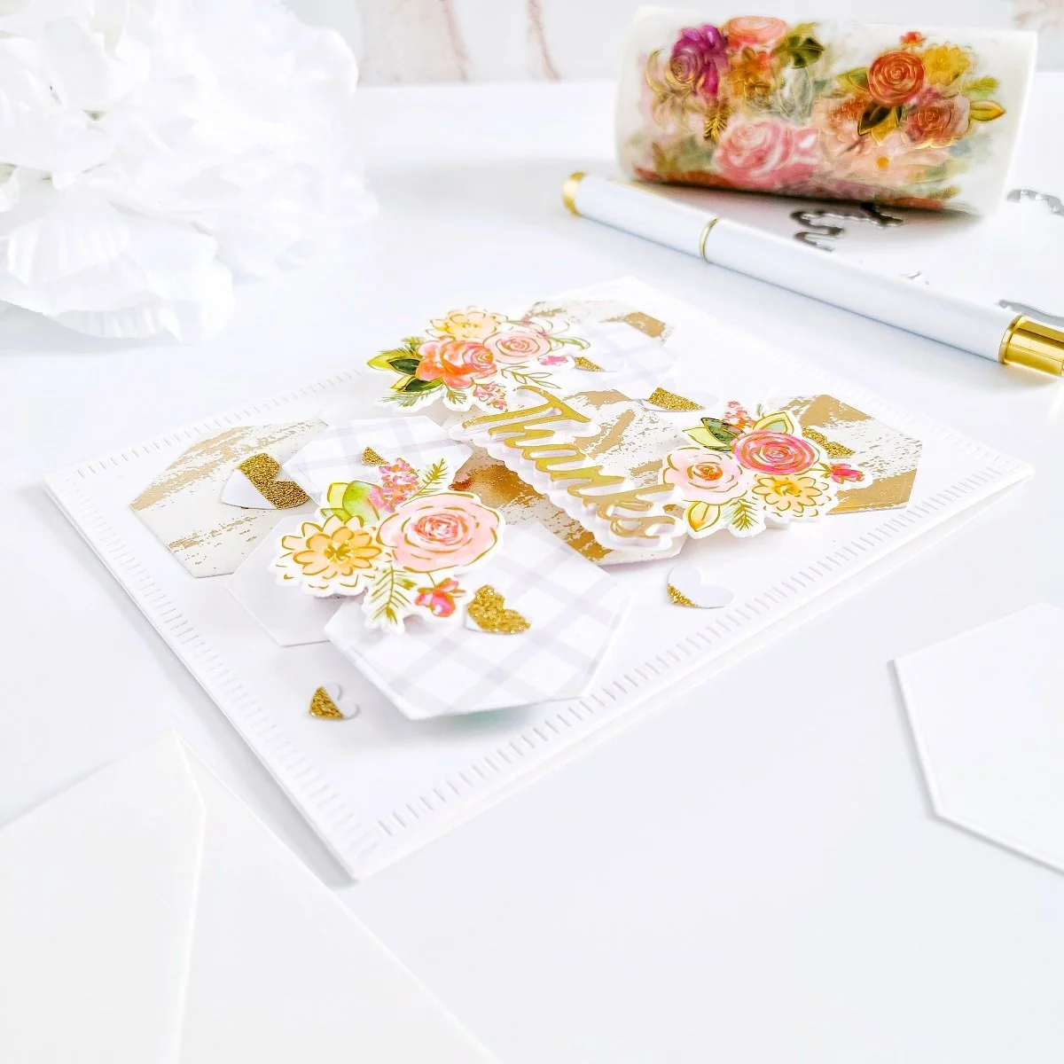 Next, as soon as I had got finished cutting the hexagon shapes out of the different cardstock pieces, I’ve gone ahead to put them off to the side. Meanwhile, I went ahead to create small die-cutting floral clusters using Joyful Bouquet Washi Tape and Joyful Bouquet Stamp Set. This step was definitely the easiest as all I did was to unroll the washi roll, tape it down over a large piece of white cardstock and die-cut the images from the washi its coordinating die in the same way, as I’ve had done it before with all Pinkfresh Studio Washi-tape Rolls.