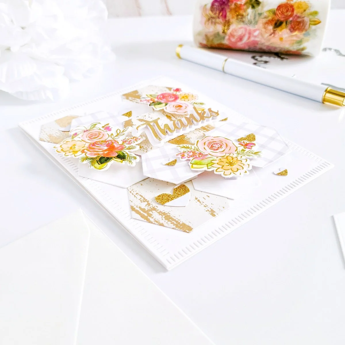 Lastly, to embellish the card, I used a hole puncher from my stash that cut out different sizes of hearts along with a piece of cardstock with gold glittery accents. Therefore, to finish the card off I went ahead to glue down the small hearts over some of the hexagon shapes. And, with that being said friends, I hope that you’ve enjoyed reading the step-by-step for how I’ve made this quick and simple geometric/floral “Thanks” inspiration card using products by Pinkfresh Studio. As always, I appreciate the time that takes you to read my blog posts. Below, you’ll find the supply list for the products used on today’s blog post. And… If, you get inspired by today’s project be sure to tag me on Instagram ➝@cardsandcraftsbyyaz, I’d love to see what you’re creating.