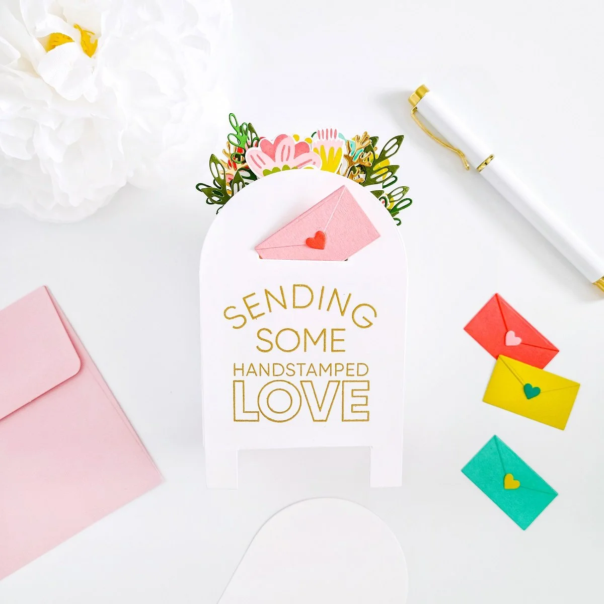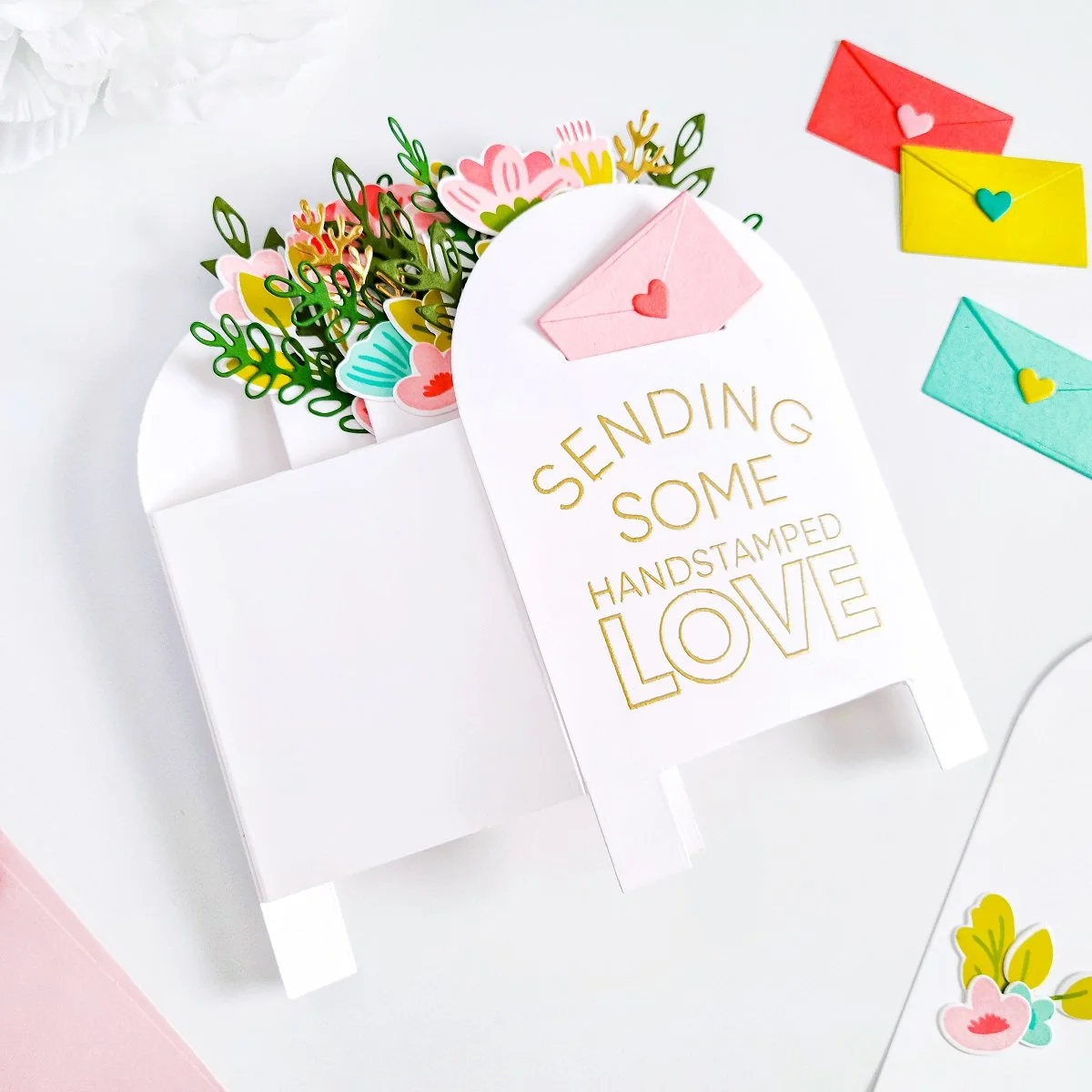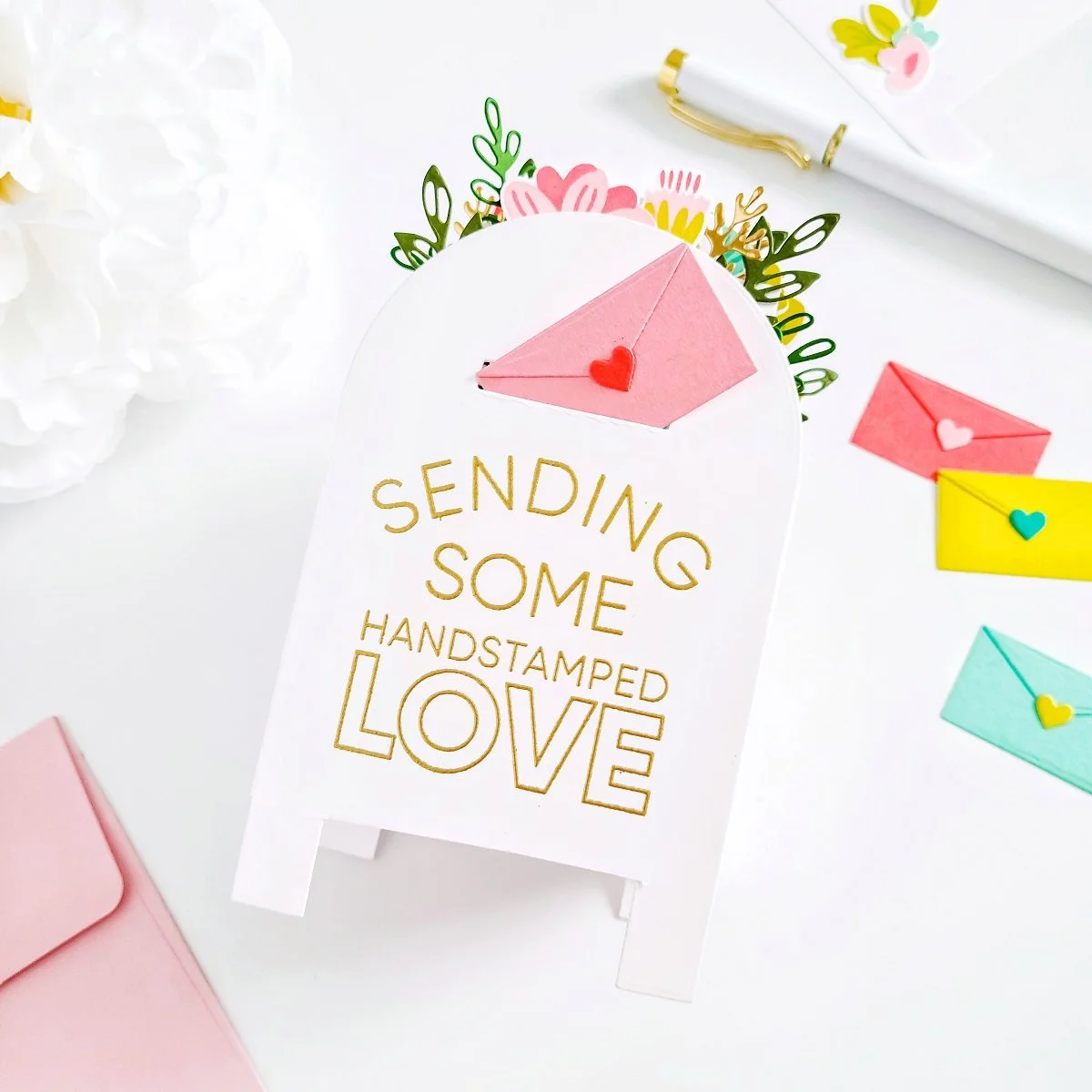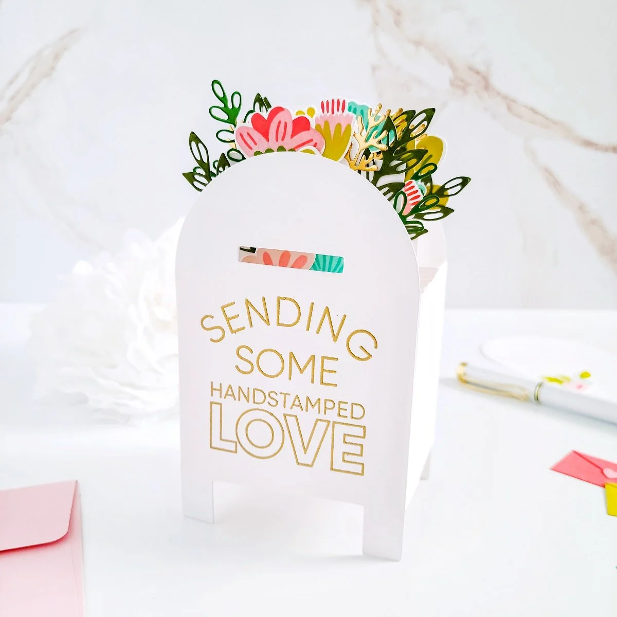 Happy Tuesday, Friends! On today’s blog, I’d like to share with you a fun 3-dimensional “Mailbox” shaped inspiration card made with a colorful floral touch using: Mailbox Gift Holder Die, Mailbox Messages Stamp Set, Love & Flowers Stamp Set, and Love & Flowers Dies by The Stamp Market. So, without further ado let’s jump right into the step-by-step for how I made it ↓