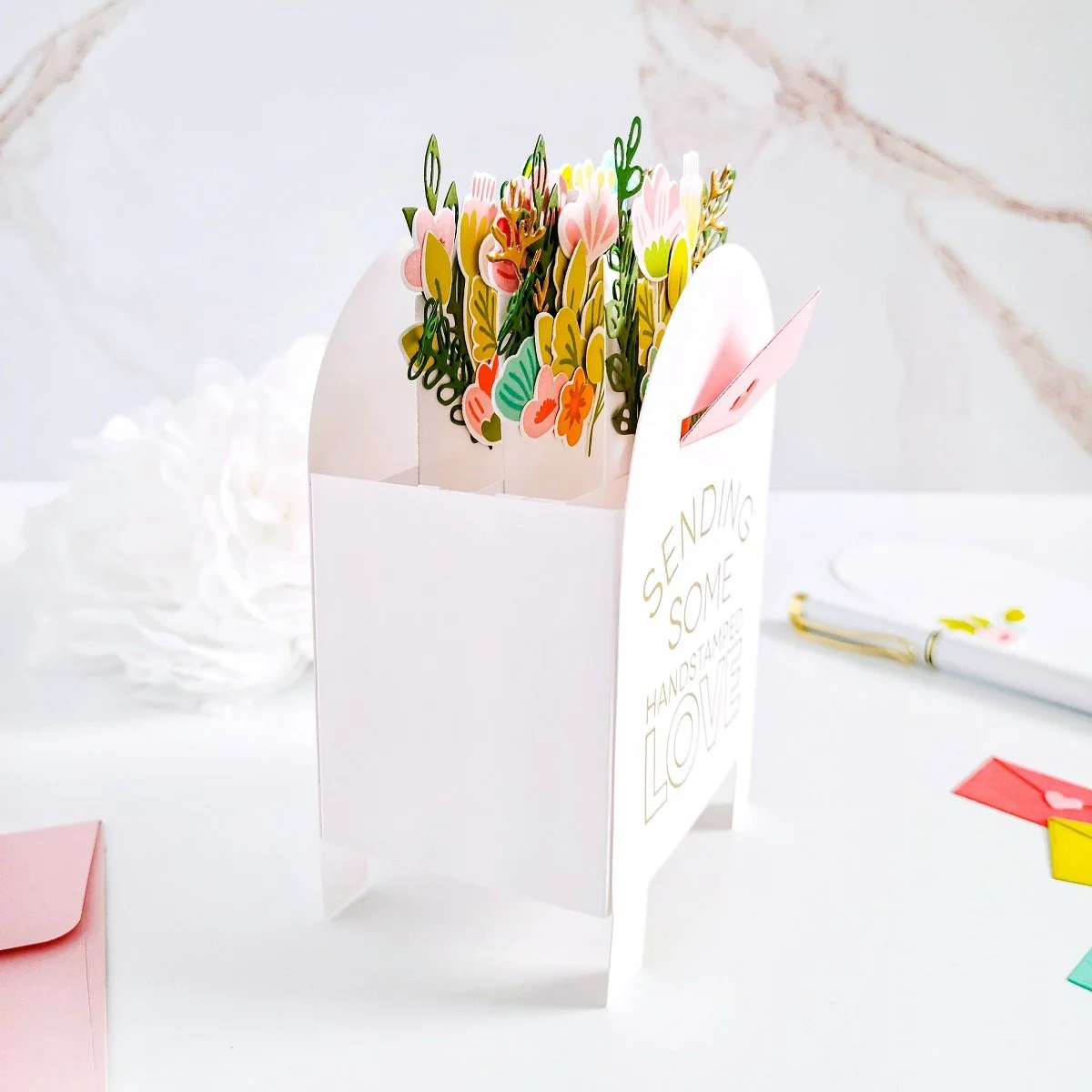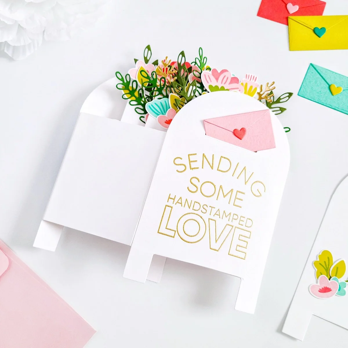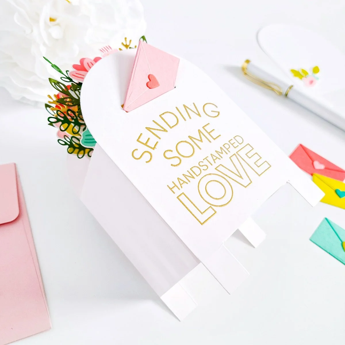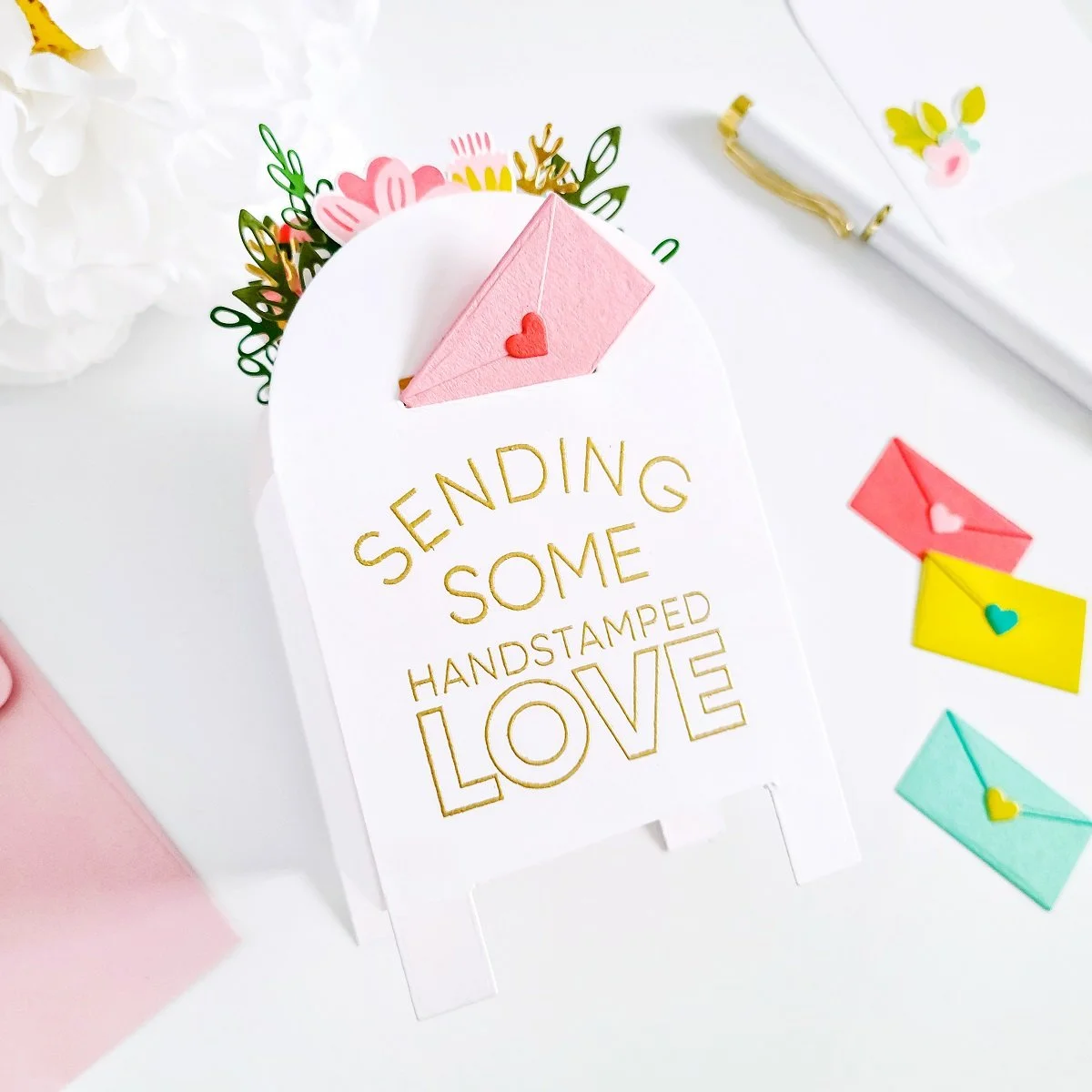 Happy Tuesday, Friends! On today’s blog, I’d like to share with you a fun 3-dimensional “Mailbox” shaped inspiration card made with a colorful floral touch using: Mailbox Gift Holder Die, Mailbox Messages Stamp Set, Love & Flowers Stamp Set, and Love & Flowers Dies by The Stamp Market. So, without further ado let’s jump right into the step-by-step for how I made it ↓