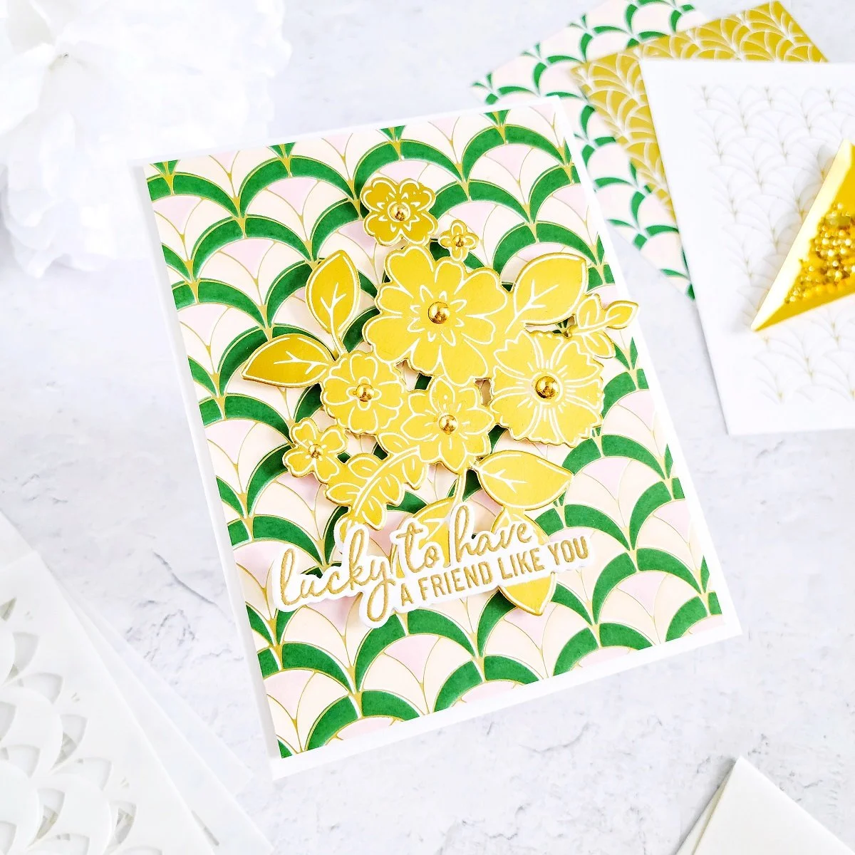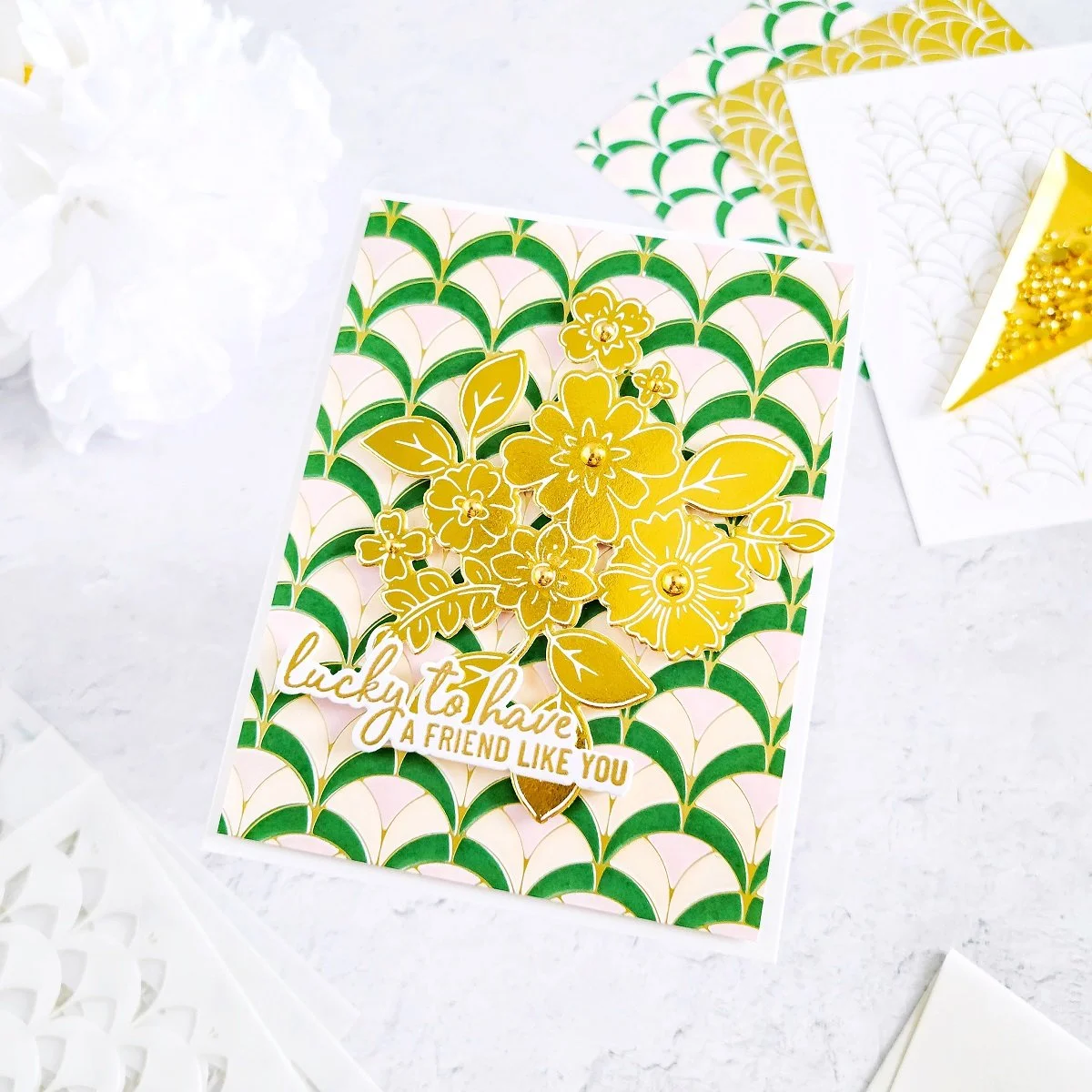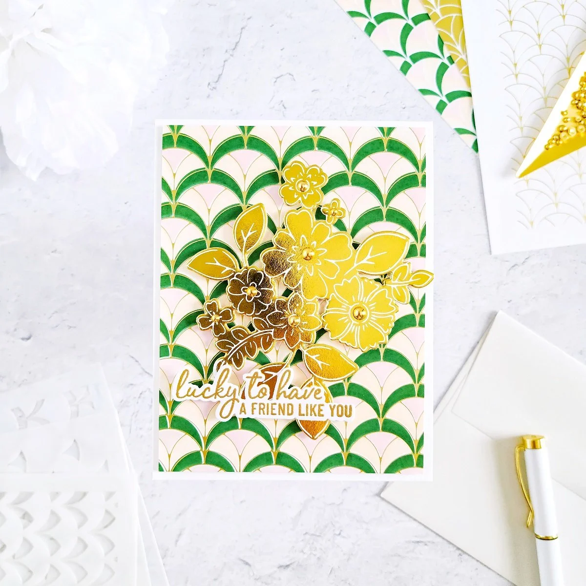 Happy Tuesday, Friends! On today’s blog, I’d like to share with you a friendship inspiration card made with an extra “Glimmering & Floral” look using: Geo Arch Hot Foil and Geo Arch Stencils to create the geometrical background look. Also, Simplest Gestures Hot Foil, Simplest Gestures Die, and Solid Hot Foil Plate to create the reverse hot foil stamping for the floral touch + Heart Smiles Stamp and Heart Smiles Die for the card sentiment. Last but certainly not least, PFS- Inks. to add the subtle pop of color for the background. So, without further ado let’s jump right into the step-by-step for how I made it ↓