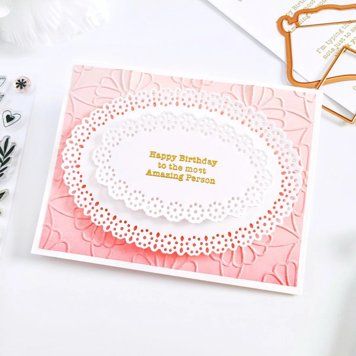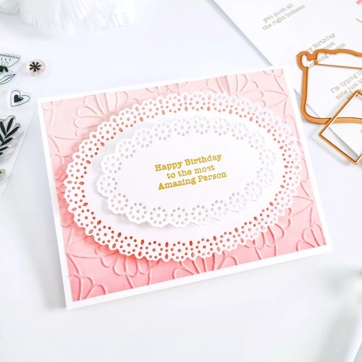 The last example was the simpler of all yet with lots of texture and a detailed look. So, to do it, I went ahead to the other leftover piece from the dry embossing panel and then, I’ve got it ink up with an ink blending brush and Coral-Pink hue. Then, while the inking was setting into the textured card panel, I went ahead to put it off to the side, so I could have gone to cut out the intricate ovals from white cardstock using the dies including in this month’s Small Die of the Month Club. Although, this dies are designed for a hand-stitching they also look great without it. → CLICK HERE if you have not seen how they look with the hand-stitching touch.