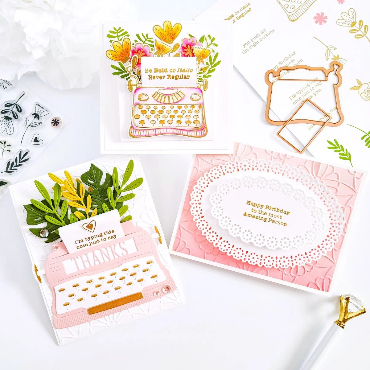 If you follow my blog posts, you might be familiar with the second example, as I previously made a card using this month’s Large Die of the Month Club. However, to change thing a little bit, I went ahead to create a flat typewriter to get it mounted over an A2 size card base. That said, I went ahead to use the dies including in the kit to create the typewriter and the greenery. Also, I used one of the dies including in the kit to add the die-cutting thanks effect to it. Other than that, the assembling was pretty much the same. → CLICK HERE to go to the previous blog post.