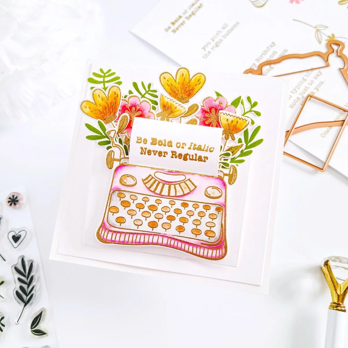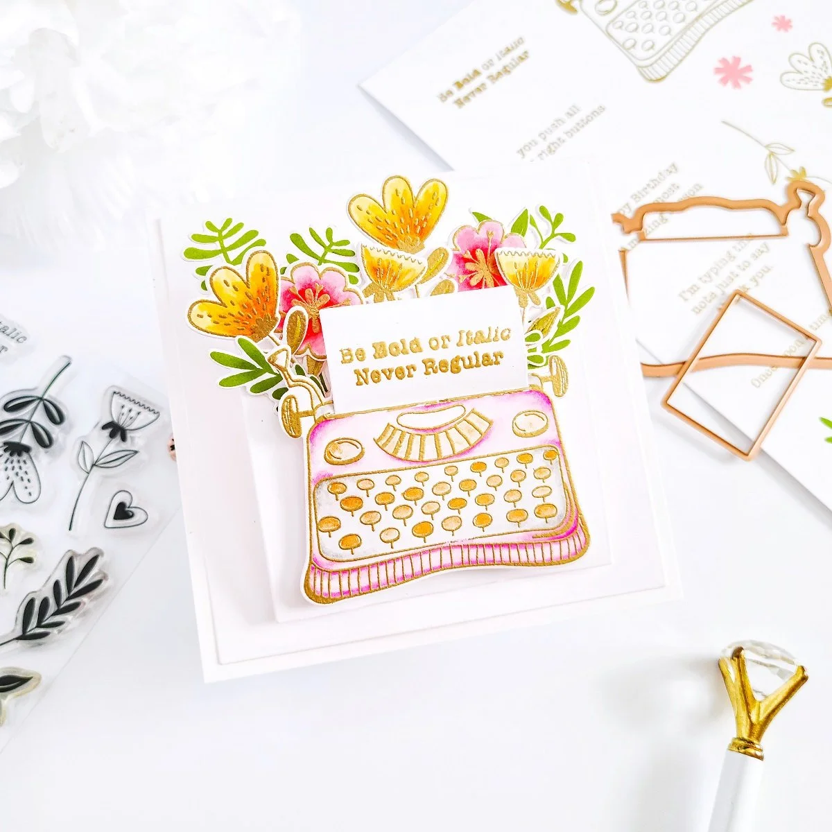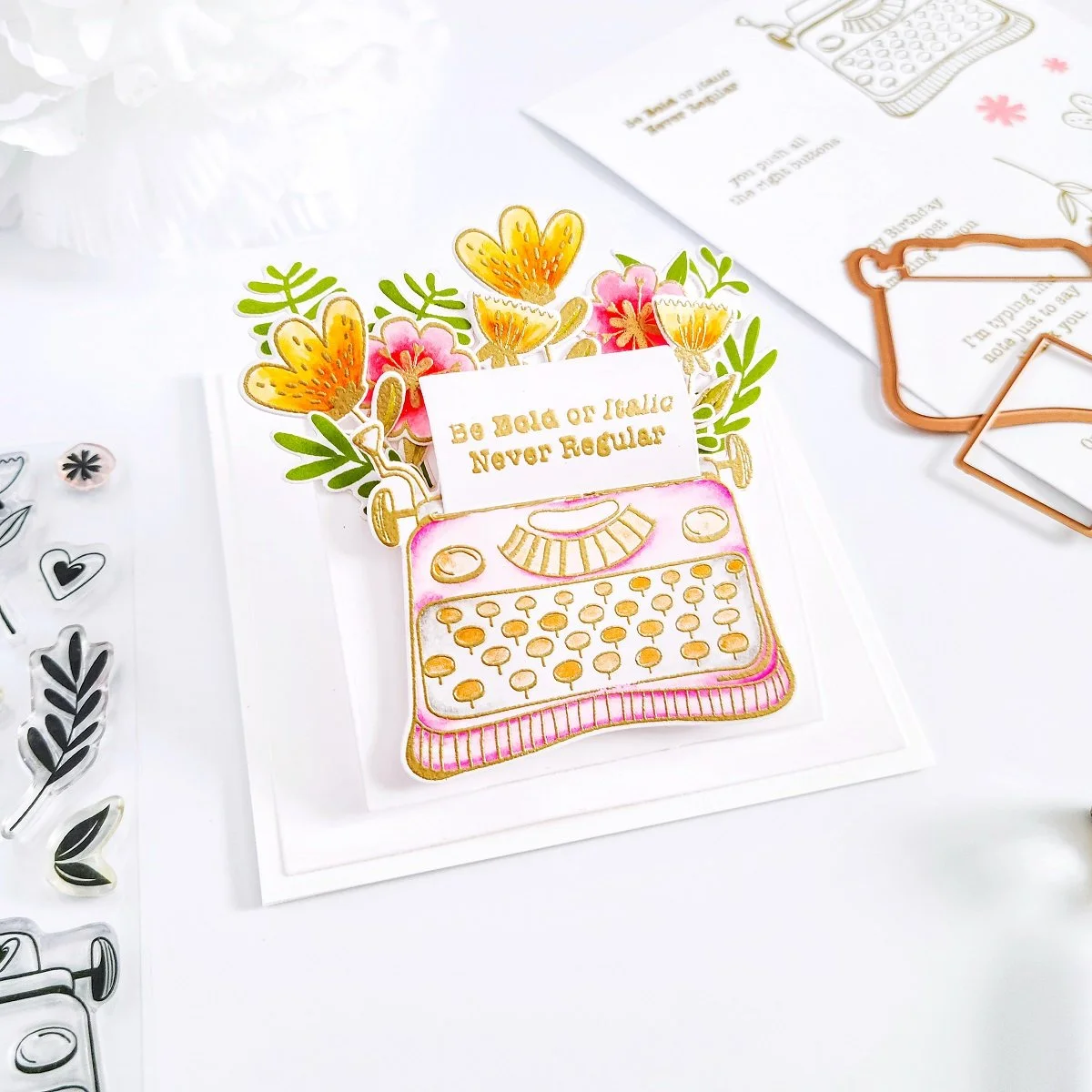 Lastly, for the card assembling, I went ahead to create a square white card base. Then, I used the dies including in Nestabilities Essential Squares Etched Dies to cut out from white cardstock a large and a small white square panel. Next, I went ahead to get the backing of the larger white square panel adhered with double-sided adhesive over the card base and then, I’ve got mounted the typewriter along with the floral images and greenery over the smaller square just as shown in the image above. Also, to add more dimension, I went ahead to create a small pop-up piece and then, I’ve got it adhered to the back of the smaller square panel. Last, but certainly not least, to finish the card off, I went ahead to get the smaller card panel adhered over the card base.