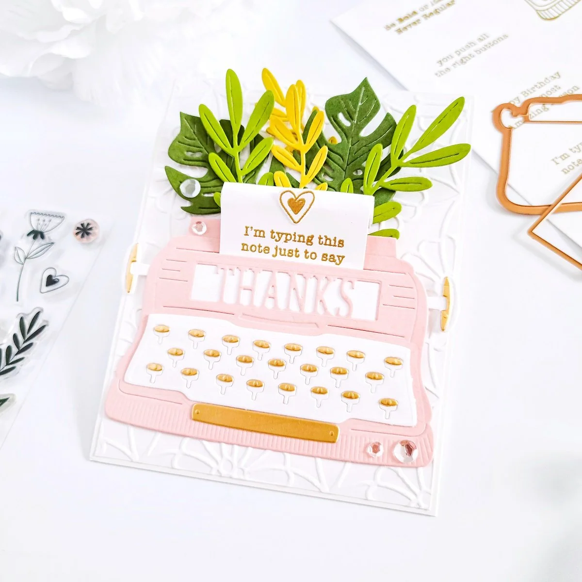 Thus, for the card assembling, I went ahead to add texture to a white card panel using this month’s Embossing Folder Kit of the Month Club. Next, I’ve got trimmed down the edges of it and then, I’ve got the back of it adhered with double-sided adhesive over an A2 size top folding white card base. Lastly, I went ahead to get back of the typewriter mounted over the card and then, I’ve gone ahead to finish the card off by gluing down here and there some Crystal Confetti to add an extra pop of shine.