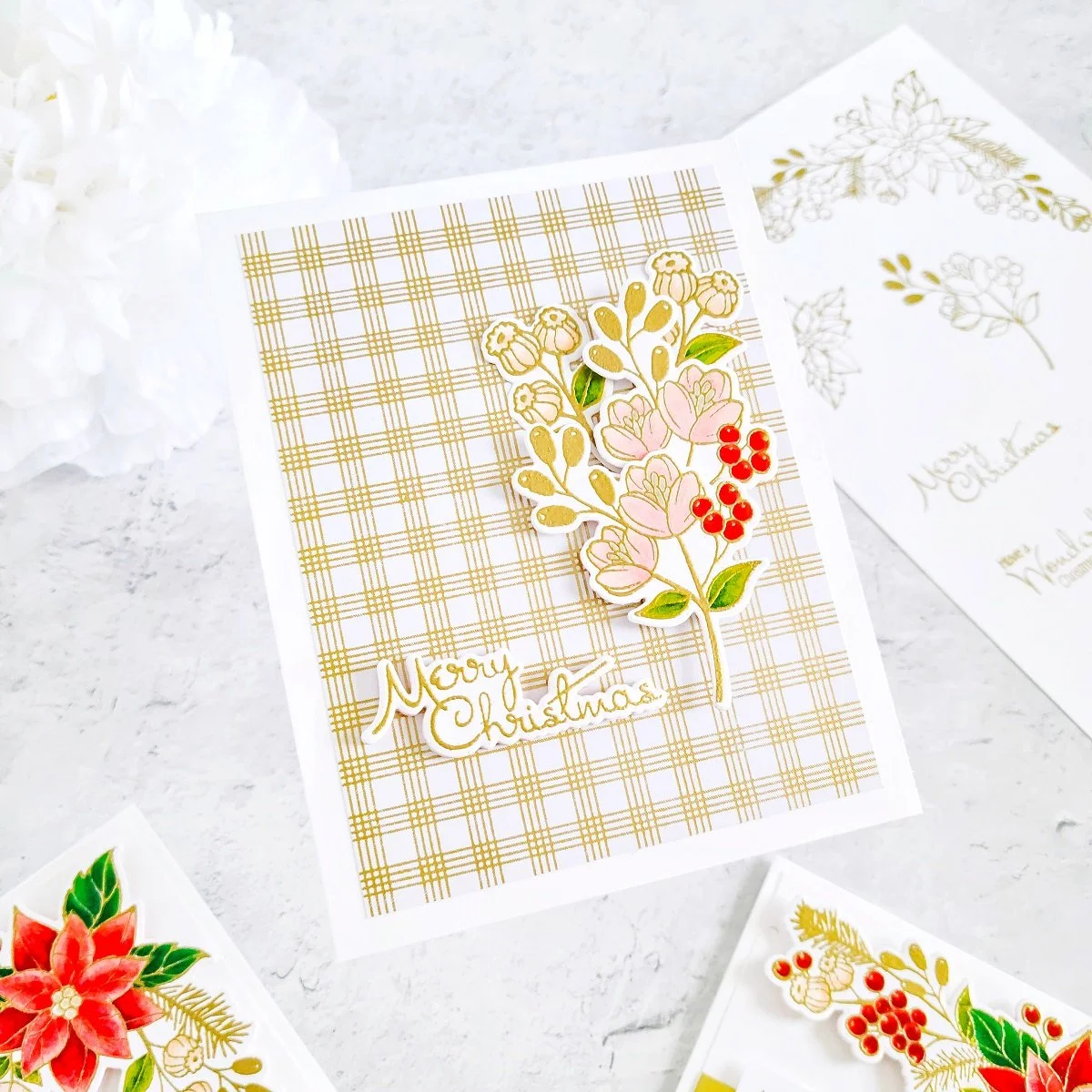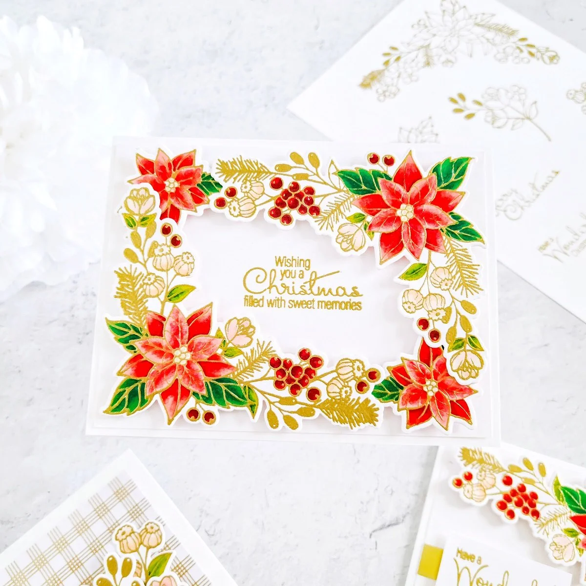 Next, after getting each images colored in, I went ahead to use each coordinating die included in the club along with Platinum 6 Die Cutting and Embossing Machine to cut out each image from the cardstock piece. And then, right after that I had gotten the die-cutting process completed, I moved on to get the card assembling started. Thus, I went ahead to trim down a card panel smaller than the card base and then, I got one of the card sentiments included in the stamp set stamped and gold heat emboss in the center of it. Then, after getting that step completed, I went ahead to get its backing adhered with double-sided adhesive to an A2 size side folding white card base in a landscaping form. Lastly, I proceeded to get the large poinsettia cluster mounted with craft foam adhesives in the lower left and upper right corners of the front card panel. And finally, to add a full poinsettia frame effect to the front card panel, I proceeded to mount the single poinsettia image to the upper left and lower right corners on the front card panel to finish off that way the first example.