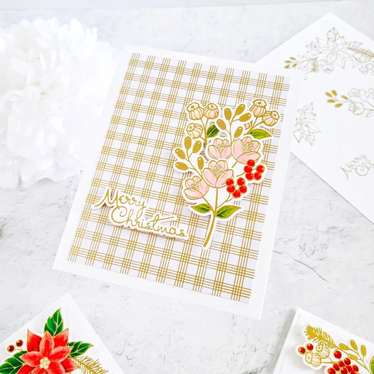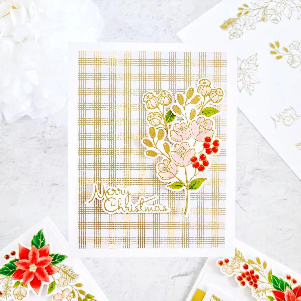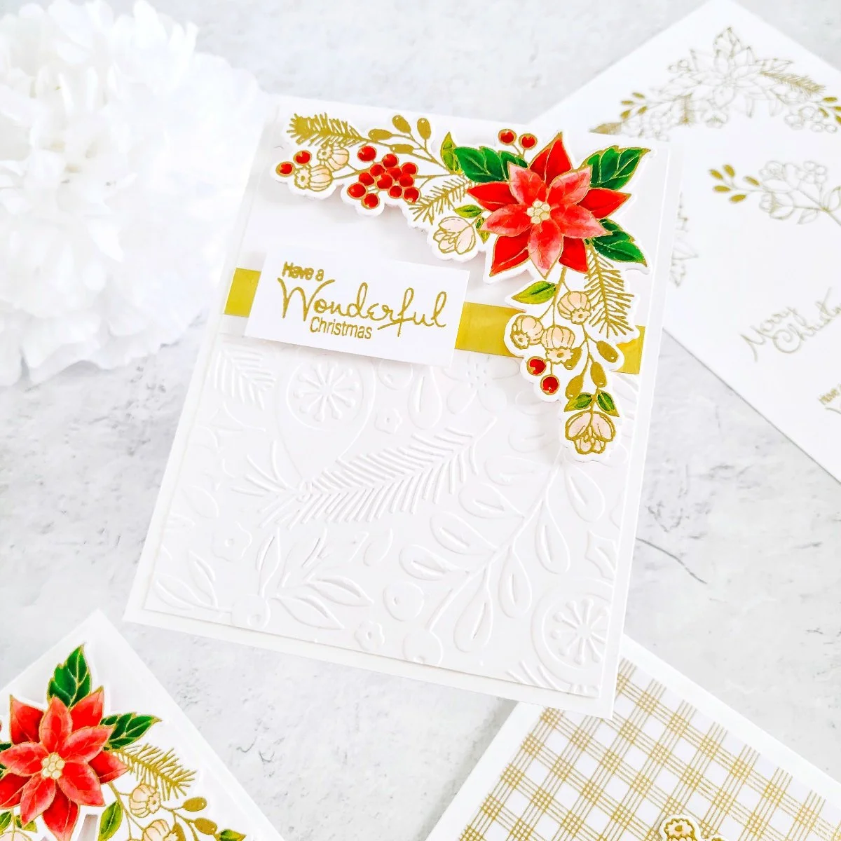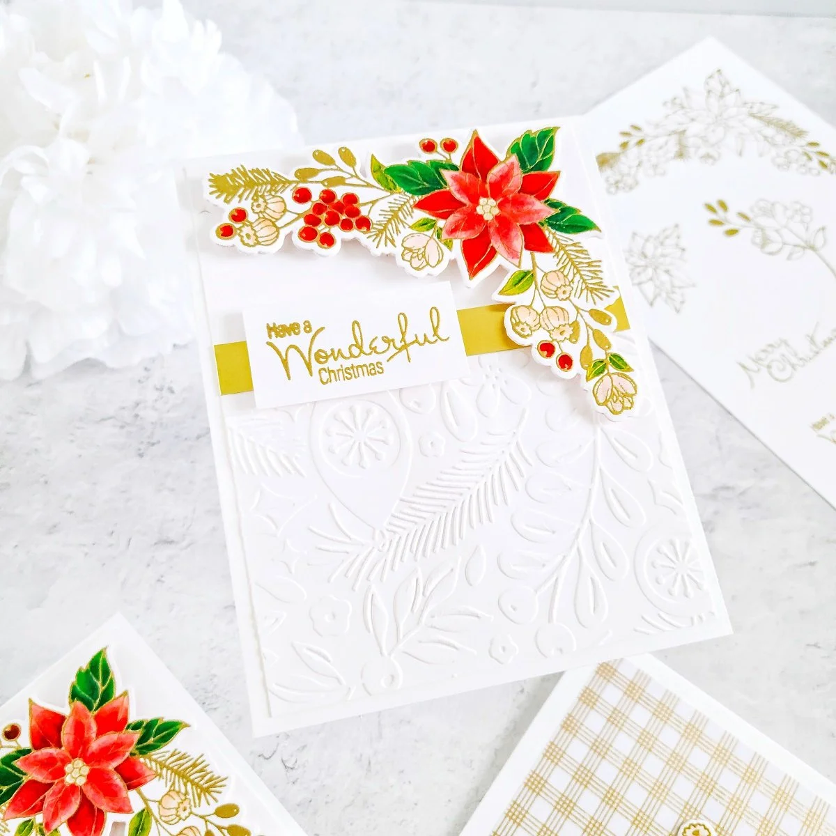 Consequently, after getting the partial dry embossing effect over the card panel, I went ahead to trim down one 1/4 of an inch from each side using the paper trimmer and then, I got the backing of it adhered with double-sided adhesive to an A2 size top folding white card base. Lastly, to cover up the joint from the partial dry embossing effect, I went ahead to trim down a smaller piece of gold cardstock and then, I got it adhered to the front card pane. Then, to finish the card off, I got mounted the large poinsettia cluster on the right upper corner and last but certainly not least, I got the card sentiment mounted with craft foam adhesive to add dimension over the gold cardstock piece just like, you can see it in the image above.