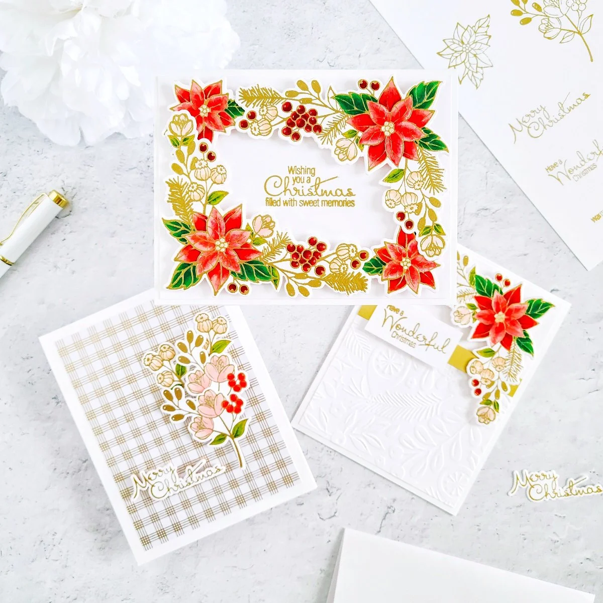 Happy Tuesday, Friends! On today’s blog, I’d like to share with you an inspiration set of holiday cards with a “Poinsettia” look featuring: "Wonderful Christmas" OCT-2022 Clear Stamp & Die of the Month Club. Along with this month’s clear stamp & die of the month club, I used Embossing Folder of the Month Club and one patterned paper sheet from the paper pad included in this month’s Card Kit of the Month Club all clubs by Spellbinders. So, without further ado let’s jump right into the step-by-step for how I made them ↓