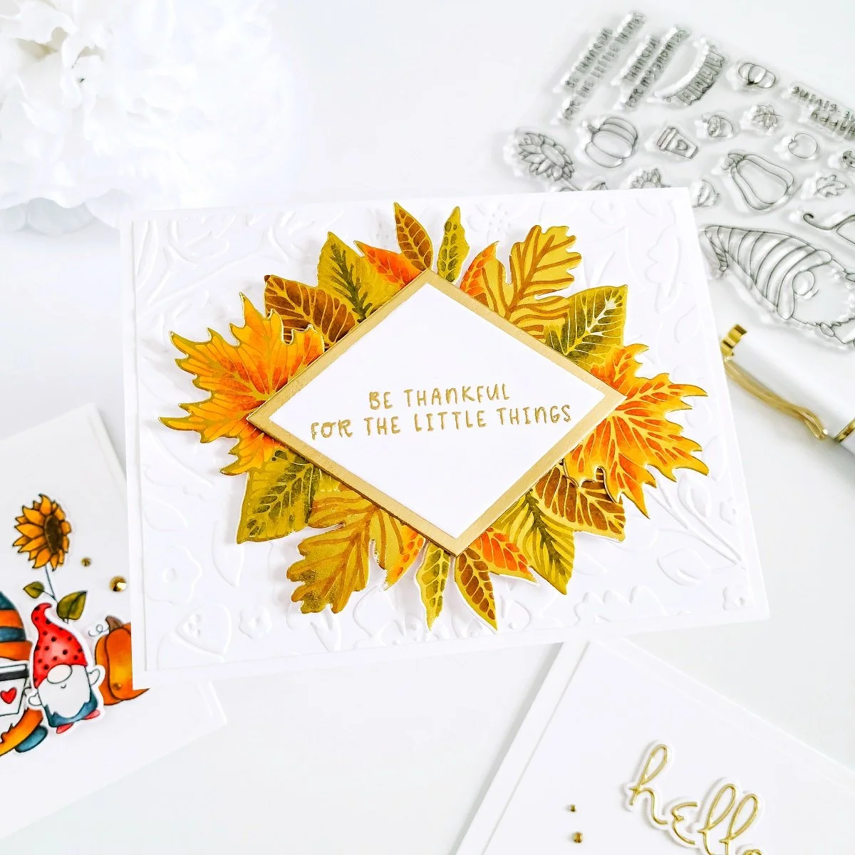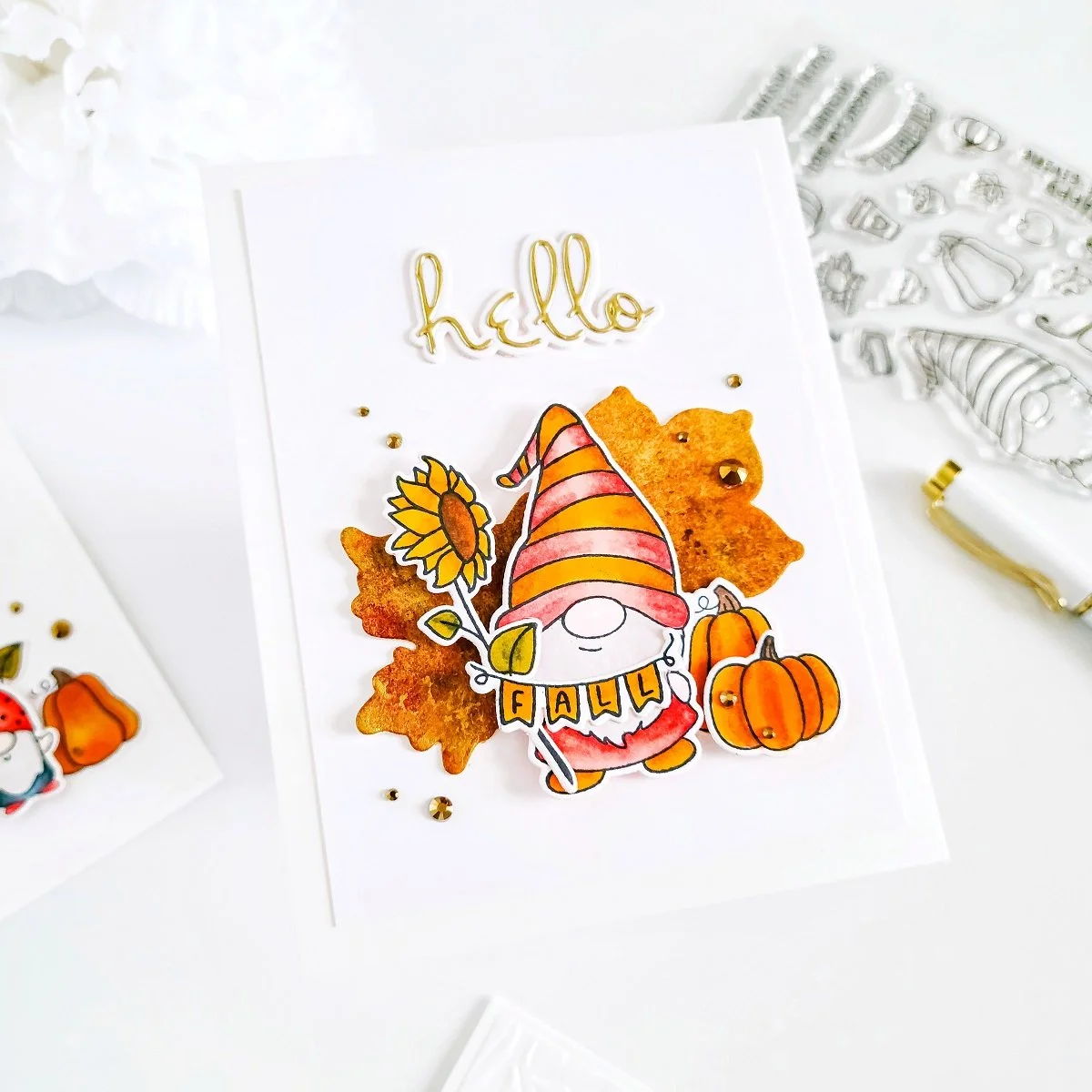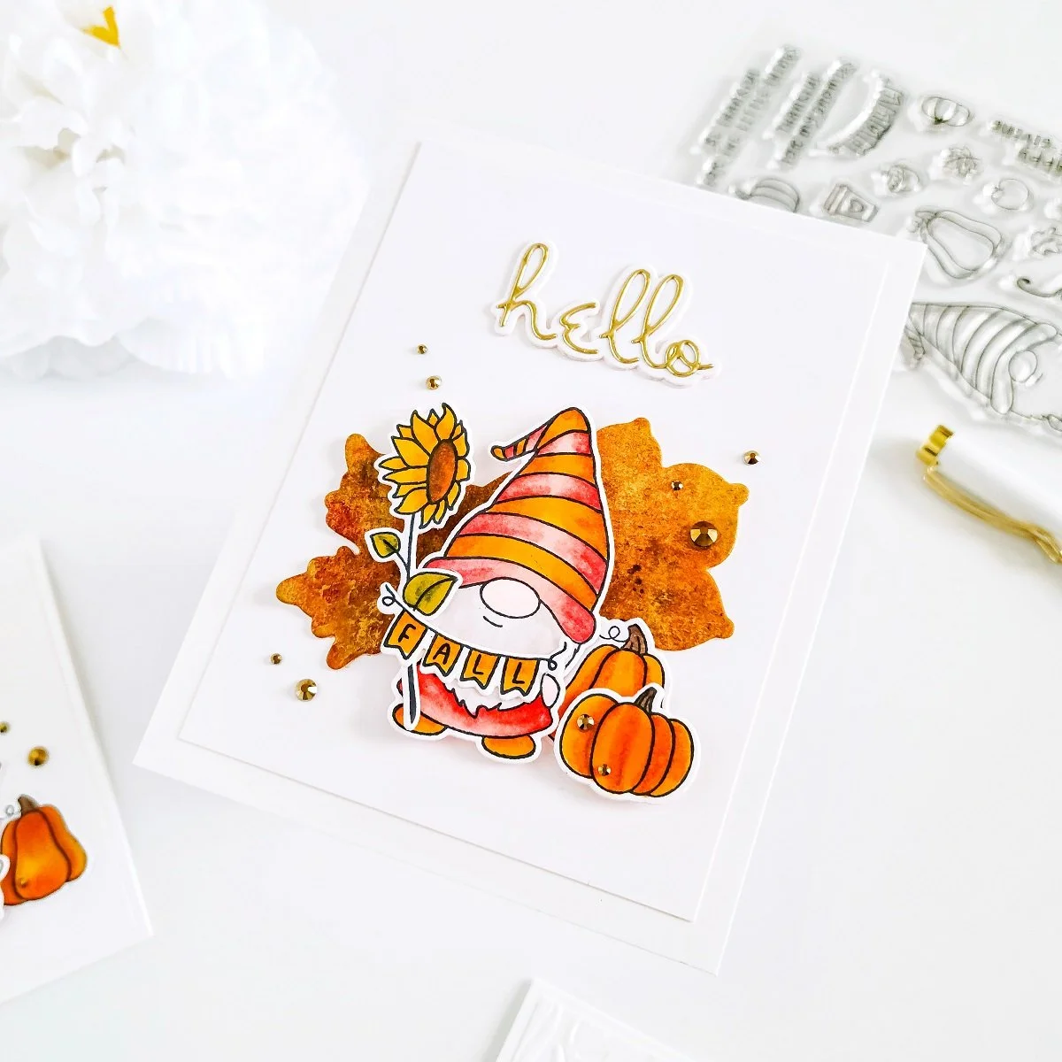 Next, I went ahead to trim off 1/2 of an inch from an A2 size white card panel and then, I got the backing of it adhered with double-sided adhesive to an A2 size top folding white card base. Then, for the card focal point, along with the stamped and die-cutting images, I used as well, some of the solid fall leaves that I cut out from a water-colored piece using the outlined dies included in this month’s Small Die of the Month Club. Then, to complete the card sentiment, I also used, the Hello sentiment included in the small die of the month club and, once I had the layered sentiment cut out from white and gold cardstock, I added to this card as well, some of the gems that I used in the previous example to add it an extra touch of shine.
