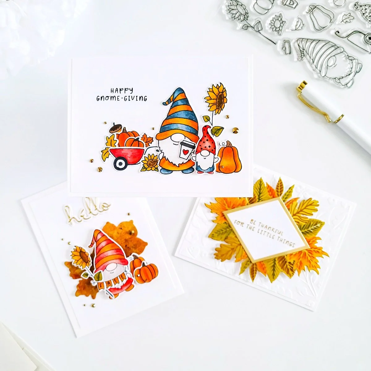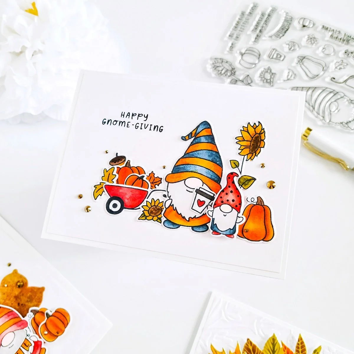 For the second example, I made another clean and simple design with another Gnomie Fall look. So, to make this card, I went ahead to use some of the stamp images from the same stamp set and then, I used their coordinating dies to cut them out from the cardstock.