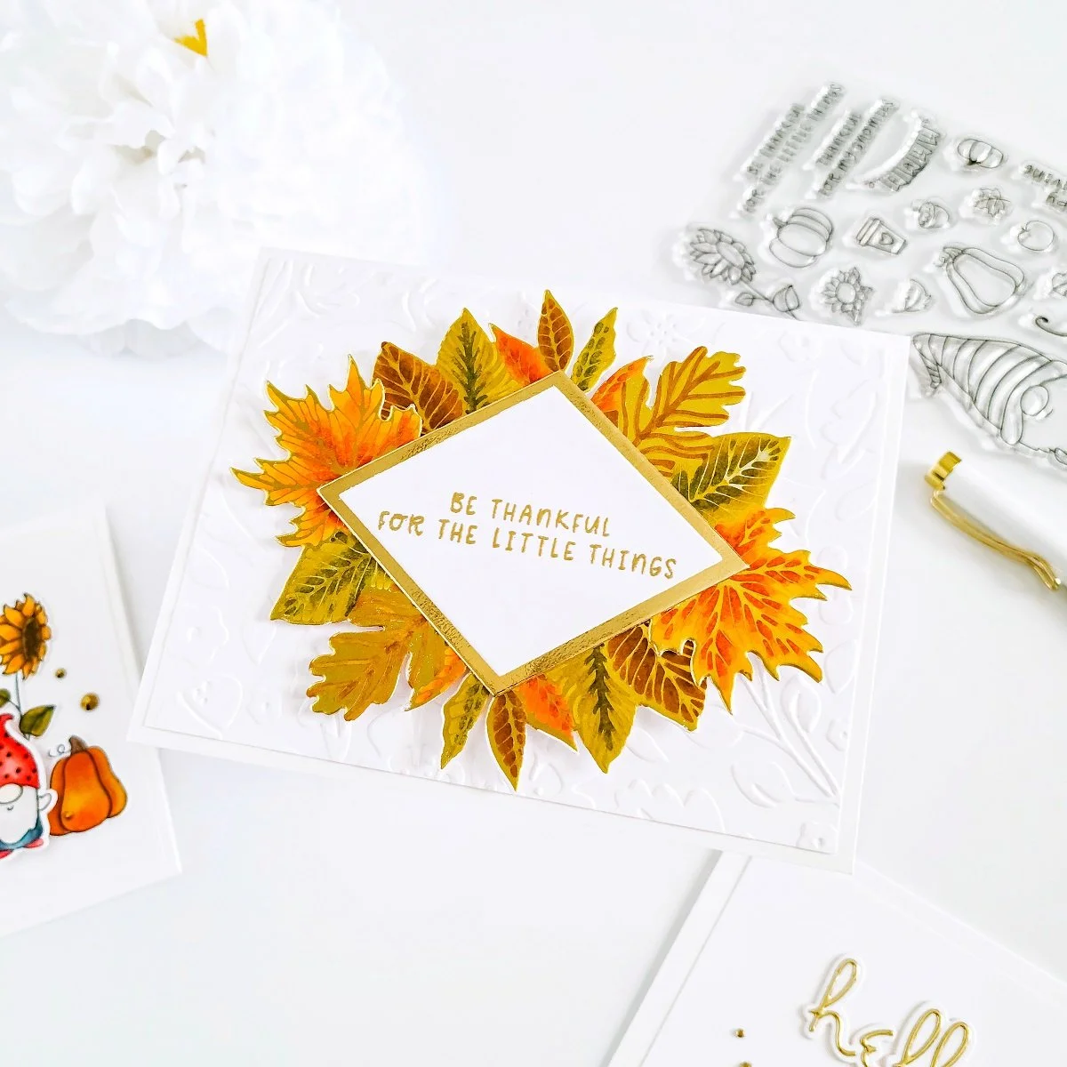 Moving on, to keep going with the Fall look design for this handmade card set, I used this month’s Glimmer Hot Foil of the Month Club along with Glimmer Hot Foil System and Glimmer Hot Foil Roll - Gold to create the Fall frame. Also, I used this month’s Embossing Folder Kit of the Month Club to add texture to an A2 size white card panel. Having that said, after getting all steps completed for the layout pieces, I went ahead to trim down 1/4 of an inch from the textured white card panel to create the white border. Once, I had gotten the textured card panel adhered to the card, I proceeded to get the card assembling over the front card panel in the way that you are seeing it in the image above. And, finally to finish it off, I decided to skip the gems to let the shine from the hot foil stamping stand out.