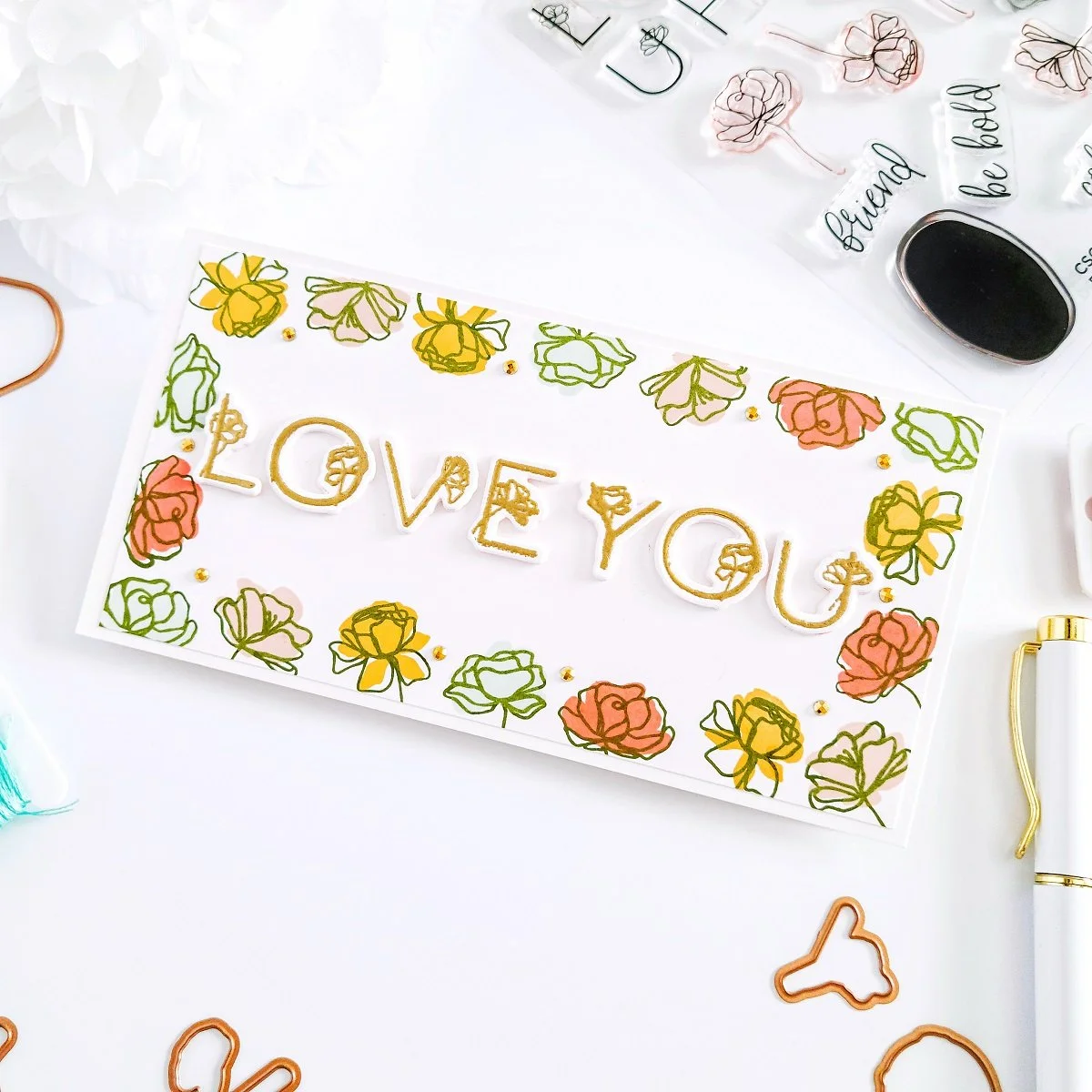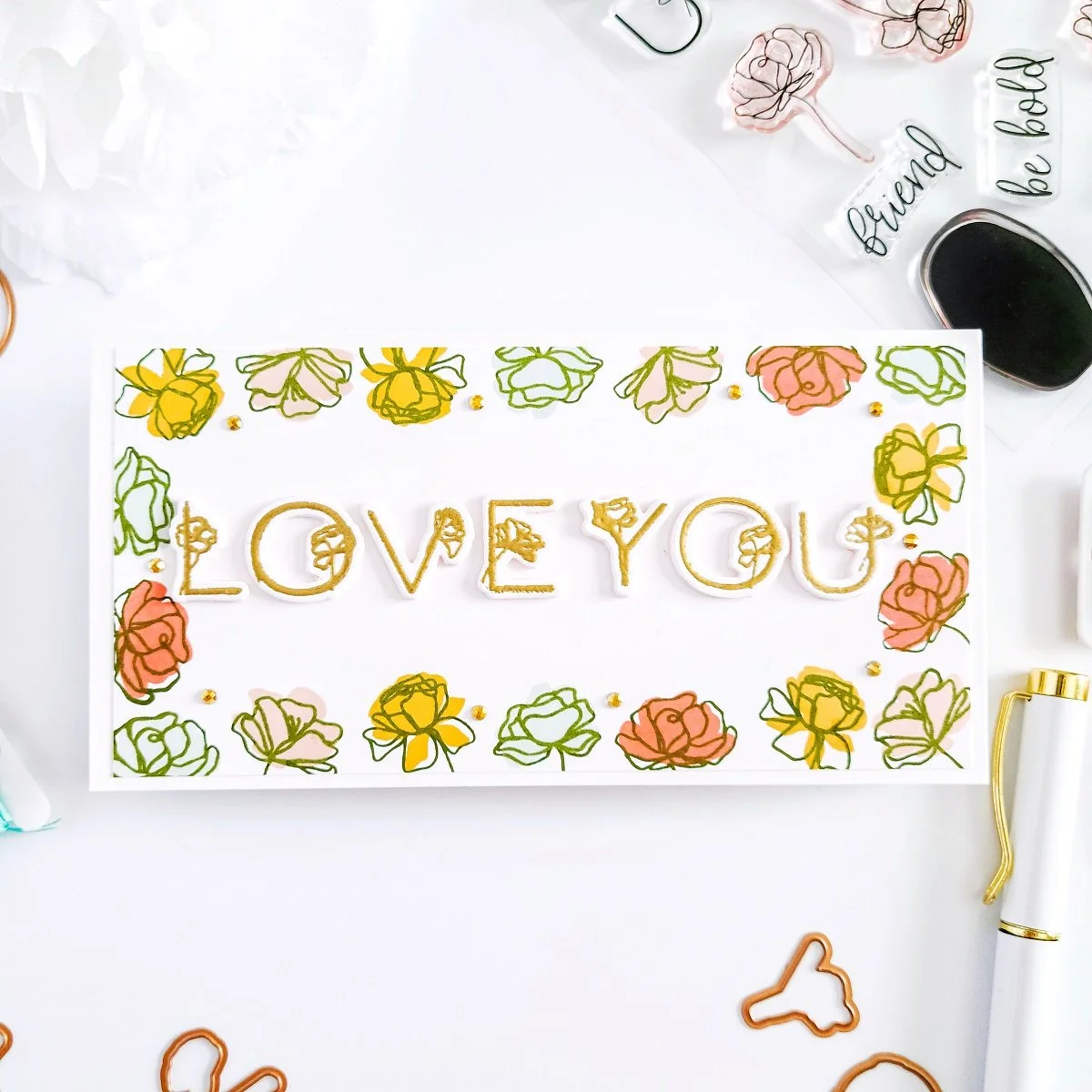 Therefore, for the first example, I used the Clear Stamp & Die of the Month Club. So, to make this mini slimline card, I started off by placing a small mini slimline card panel inside my MISTI Stamping Tool and then, I proceeded to line up the outlined floral stamp images including in the stamp set to start the stamping over the panel. The stamp set includes four outline stamp images, so I went ahead to stamp each stamp image around the perimeter of the card panel until I had gotten created a floral frame over it.