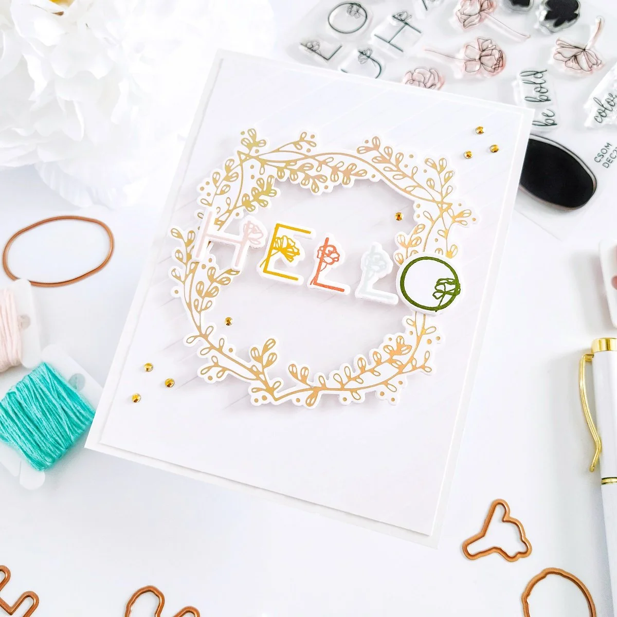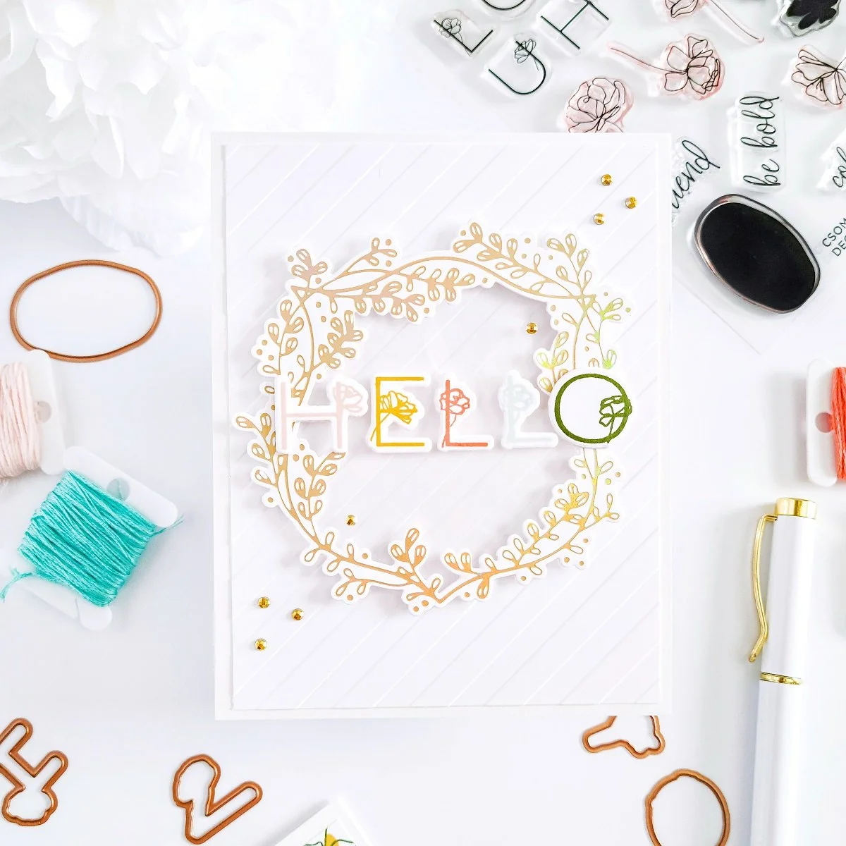 For the card assembling, I went ahead to adhered down a slightly smaller textured white card panel over an A2 size top folding white card base, and then I went ahead to get a foiled wreath mounted over the card with square foam dimensional to raise its dimension. A foiled wreath which, I’ve had created using this month’s Glimmer Hot Foil Kit Of The Month Club along with a large piece of Glimmer Hot Foil Roll: Aura and of course, the Glimmer Hot Foil System Platform for the hot foil stamping process. Lastly, to finish the card off, I went ahead to get the letters mounted over the card creating a Hello card sentiment. Finally, I went ahead to glue down here and there some of the tiny gold jewels to pop even more shine to the card.