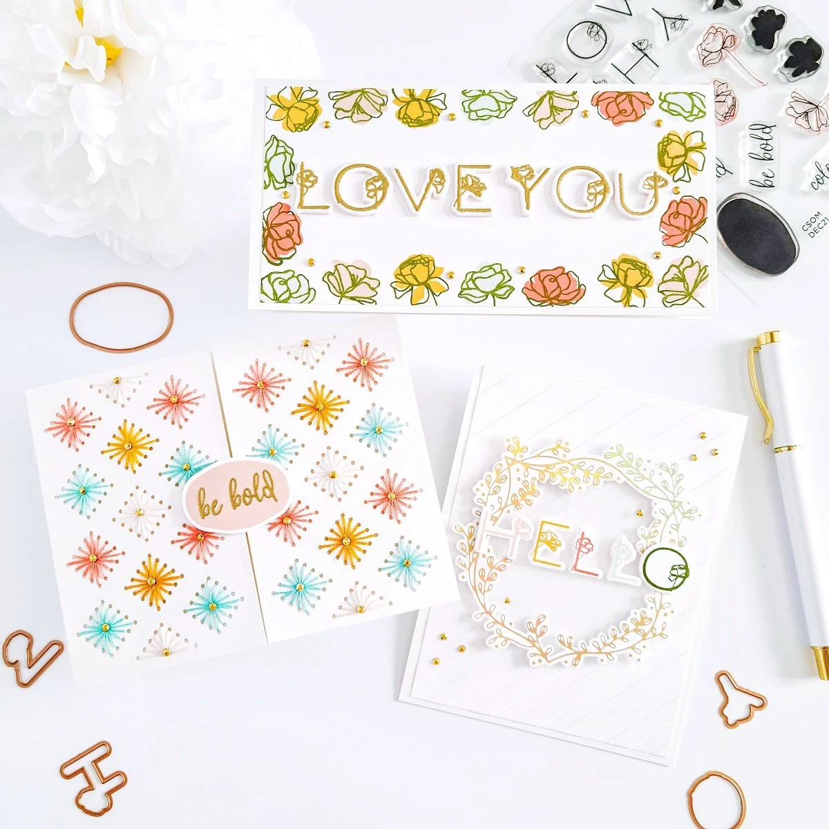 Happy Monday, Friends! On today’s blog, I’d like to share with you a very delicate set of “Floral & Hand Stitched” inspiration cards made using “Colors Outside the Lines” DEC-2021 Clear Stamp of the Month Club Kit by Spellbinders which now comes as pack with its coordinating die set → Clear Stamp & Die of the Month Club Kit. Besides that, to make this set of cards, I paired this month’s Glimmer Hot Foil Kit Of The Month Club and Large Die of the Month Club Kit. So, without further ado let’s jump right into the step by step on how I made them ↓