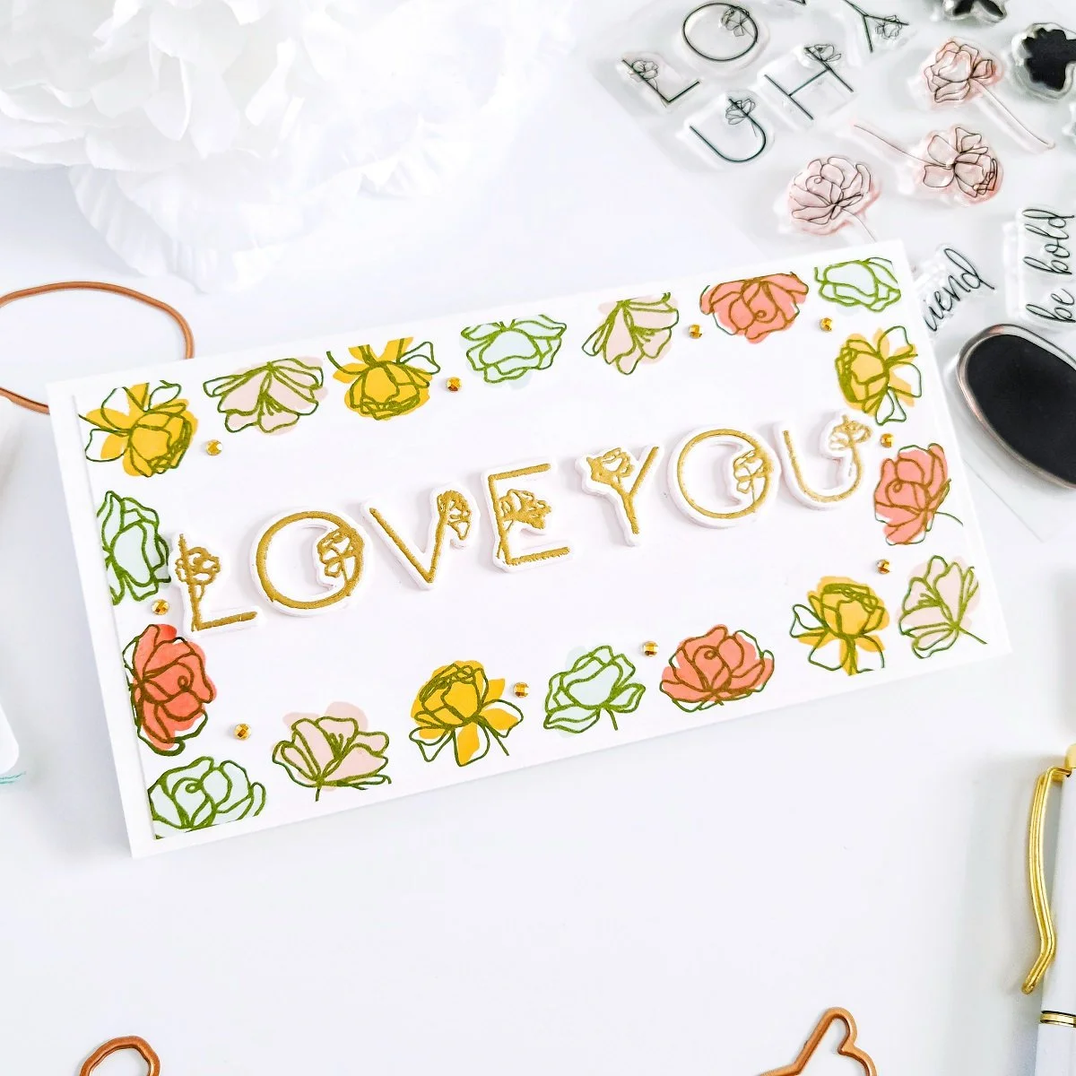 The stamp image also has a very dainty set of letters that creates three words, so I went ahead to get them stamped with embossing ink over a large piece of white cardstock, and then I got them heat embossing using: Antique Gold Crisp Embossing Powder. Thus, right after that I had finished stamping and heat embossing them, I went ahead to use their coordinating dies to cut the letters out from the cardstock. So, to cut them out from the cardstock, I used my Platinum 6 Die Cutting and Embossing Machine. Lastly, I also cut out extra letters from plain white to make the Love You card sentiment a little sturdy and dimensional. Having that said, after I had finished off layering the letters, I went ahead to get them glue down over the card, and the to finish the card off, I went ahead to glue down here and there some tiny gold jewels to add an extra pop of shine to the card.