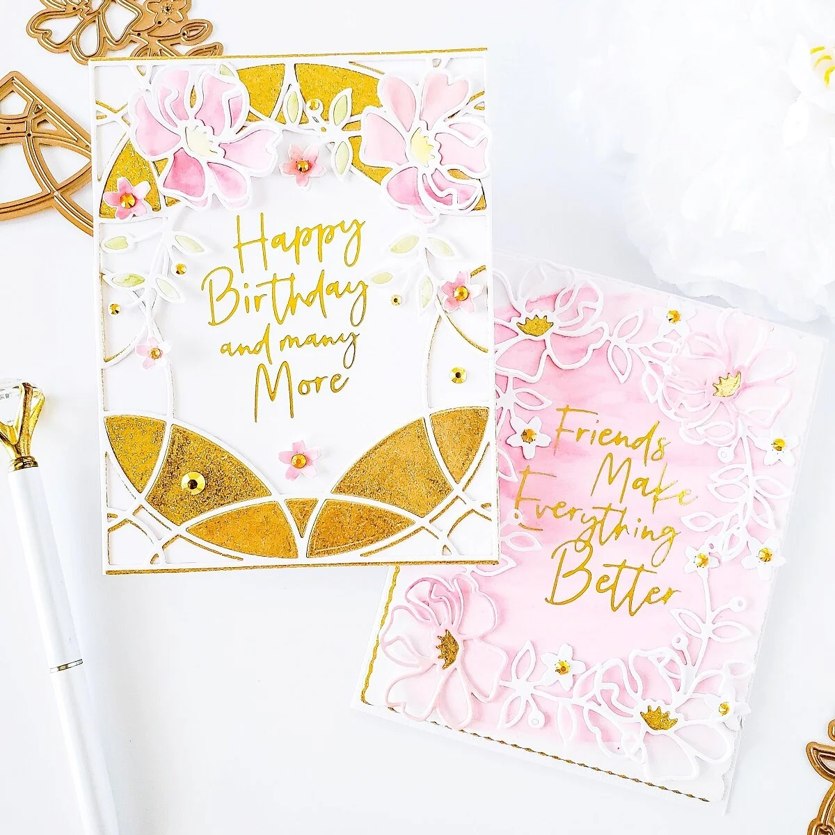 For the second card, instead of using the frame, I only used the floral corners however, I lined up the second-to-last die from the Elegant Twisted Etched Rectangle Die Set over a large piece of glitter cardstock and I ran them through the die-cutting machine. This step was just to add a little extra detail to the edge of the frame.