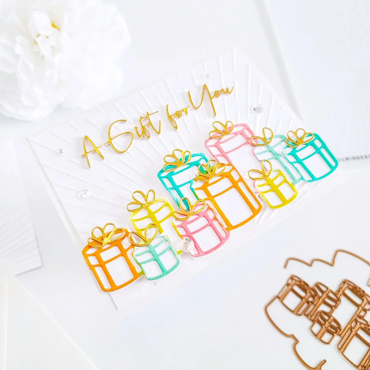 Having that being said, as soon as, I had finished adding those pop of colors to each gift, I went ahead to line up the insert die over the inked die-cutting piece and then, I went ahead to run them through the die cut machine. By doing this way, you can see that I got left only the outer detailed die-cutting piece. Thus, to create the final gifts border look, I went to use the detailed die-cutting piece as if each white gift were wrapped up with colored ribbon for a clean and airy look design. So, for the white gifts, I went ahead to glue down the outer detailed and inked up die-cutting piece over one of the white solid pieces. Then, to make it sturdier, I went ahead to layer it over the last solid die-cutting piece. Once, I had those steps completed, I proceeded to cut out the gift bows out of Gold Foil Cardstock and then, I went ahead to glue down each of them over each gift to add a gold accent to them.