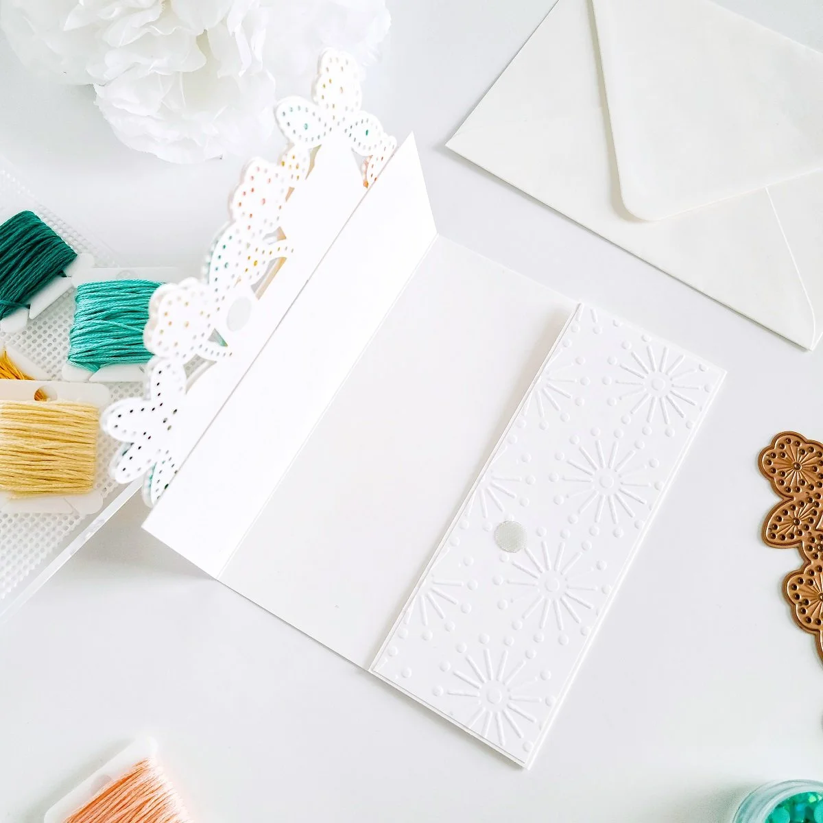 Moving on, I went ahead to create the gate-fold card base and then, I added texture to its sides. So, to do that, I used this month’s “Faux Stitch” Embossing Folder of the Month Club to compliment the faux stitching look. Thus, right after that I had added the textured pieces to each side of the gate-fold card base, I proceeded to glued down half part of the hand-stitched die-cutting piece to the left opening then, to keep it closed I used Self Adhesive Dots.