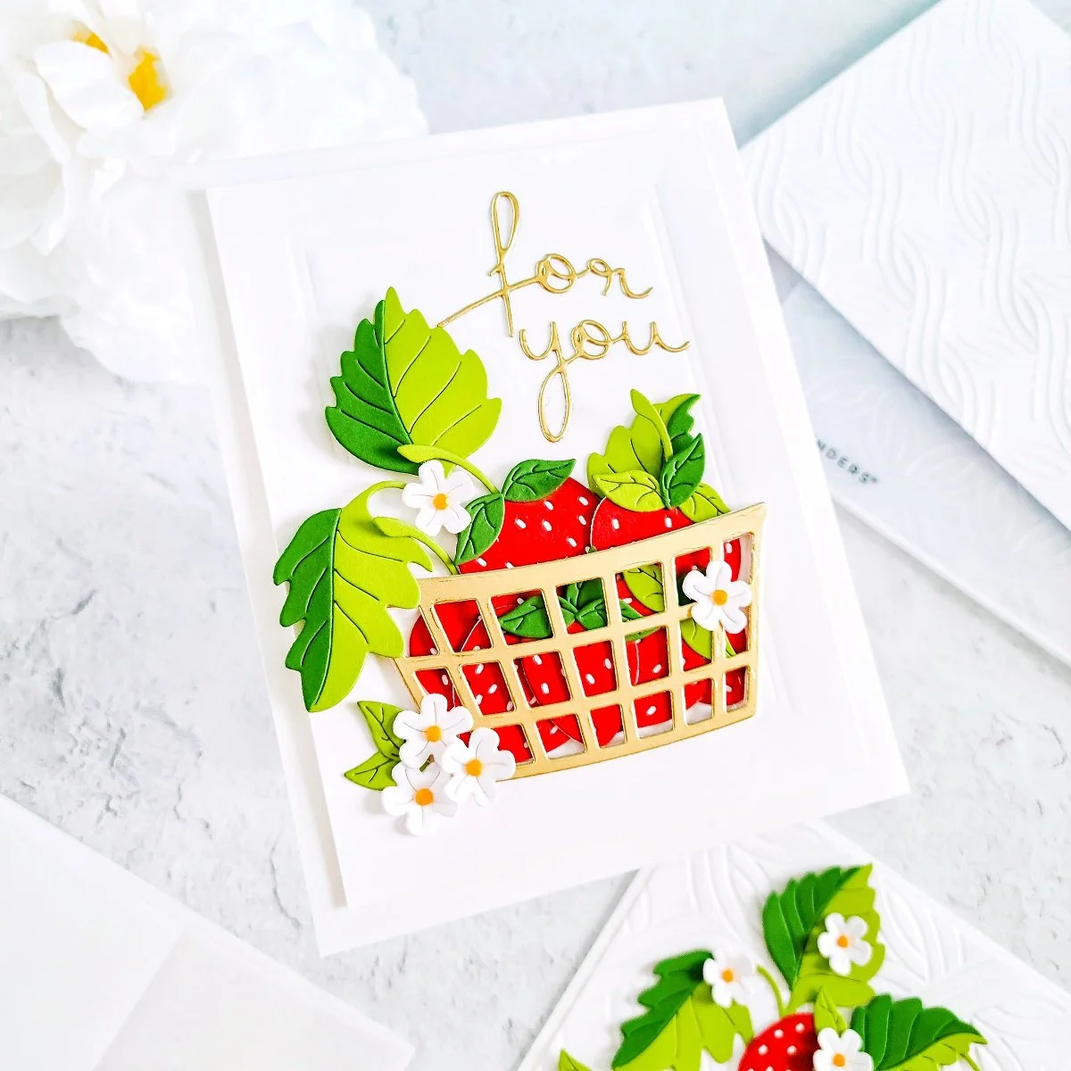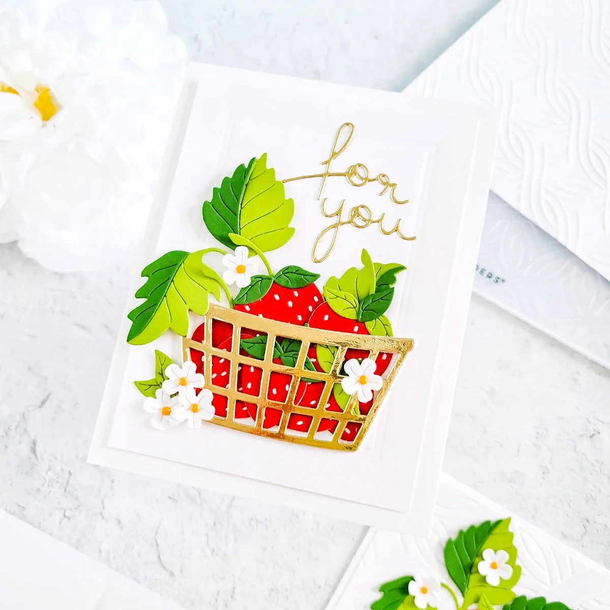 Thus, for the card layout, I went ahead to add a subtle texture to a small white card panel using one of the glimmer plates included in Essential Duo Lines Glimmer Rectangles Glimmer Hot Foil Plate and by following the embossing instructions from the die cut machine. So, once I had finished adding the texture to it, I proceeded to get the backing of it mounted to an A2 size top folding white card base. Next, used my Precision Tip Scissors to cut out the center pieces from the white baskets and them, I got them layered under the gold die-cutting basket adding that way a little dimension but just to the frame. Moving on, after getting that step done, I went ahead to place some strawberries inside the basket and then, I got the basket gluing down to the card. Lastly, I proceeded to get it embellished by adding some small flowers and to get the card finish off, I added some tiny Yellow jewels and the For You die-cutting sentiment. As for the sentiment, I used the top layer from one of the dies included in this month’s Small Die of the Month Club.