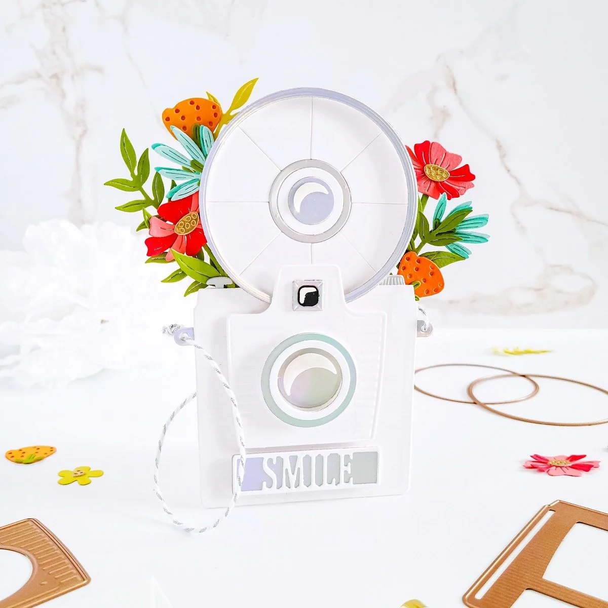 Therefore, this month’s Large Die of the Month Club Kit includes twenty-eight dies that create this cute and fun camera along with its floral touches. Thus, I went ahead to line up the dies that cut out the camera body over a large piece of white cardstock and then, I proceeded to run them through my Platinum 6 Die Cutting and Embossing Machine.
