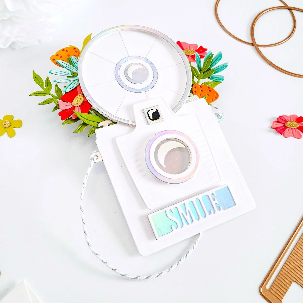 Once, I had that done, I went ahead to line up the rest of the dies to cut out some of the parts for the built-in flash from white cardstock and some of them from the same holographic cardstock that I used for the frame. In the same way, I went ahead to cut out some of the parts for the lens from white cardstock and some from the holographic cardstock. Also, to keep going with the white and holographic die-cutting process, I went ahead to line up over a large piece of holographic cardstock the dies that cut out the dial mode dial and shutter buttons along with the solid die that cuts out the sentiments and the die that cuts out the handles for the camera. And, last but not least, I went ahead to use one of the dies to create the die-cutting smile sentiment.