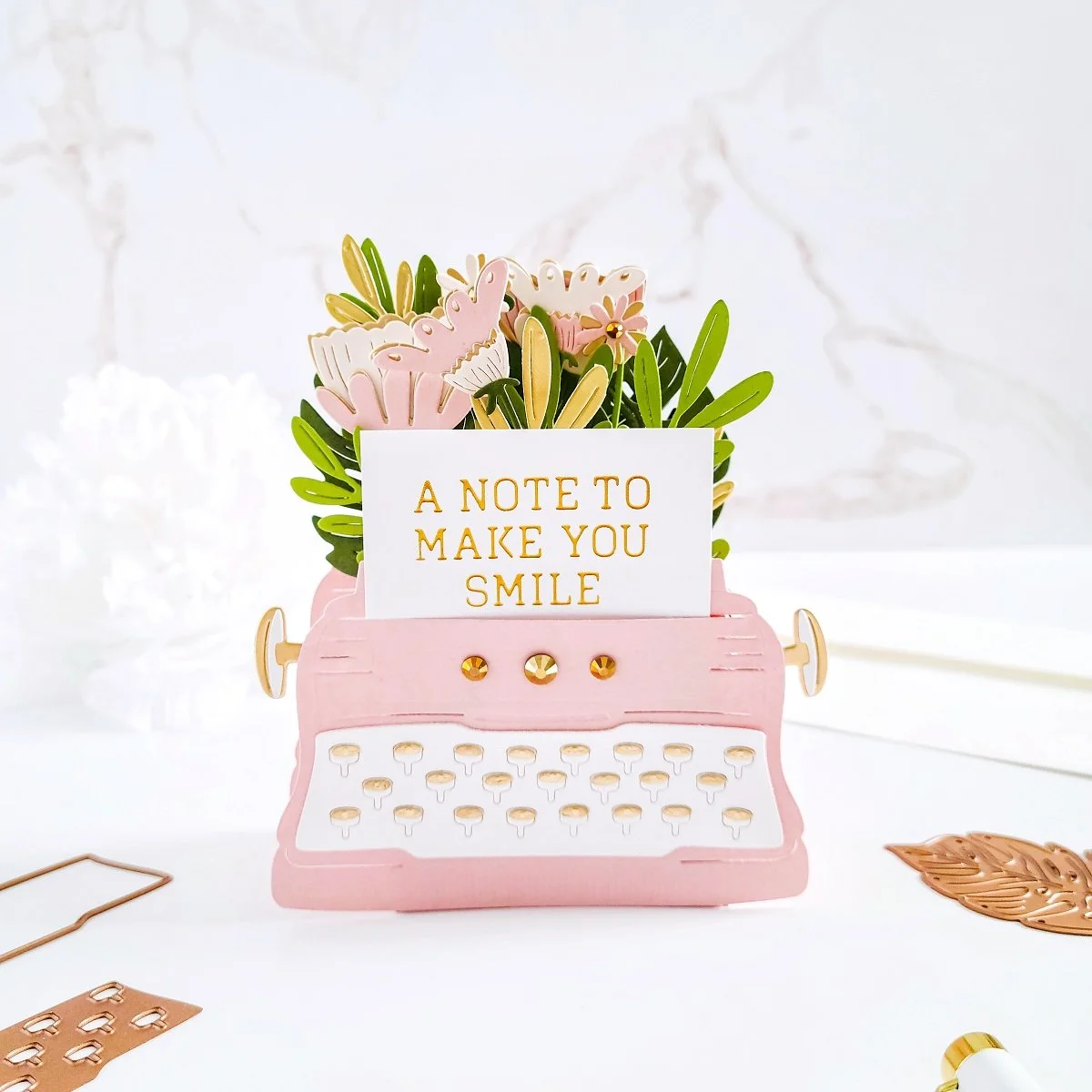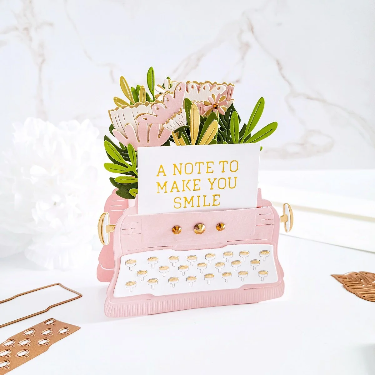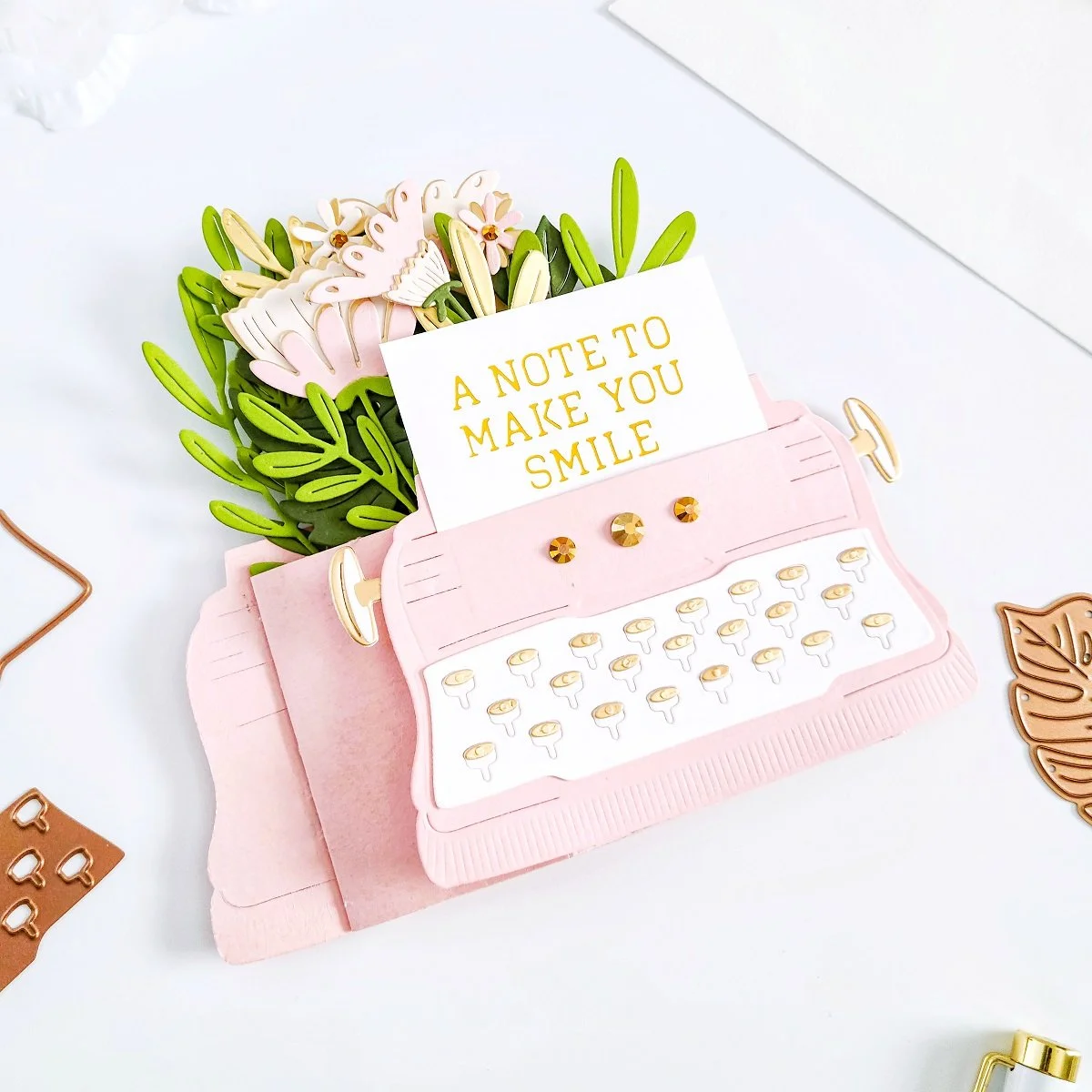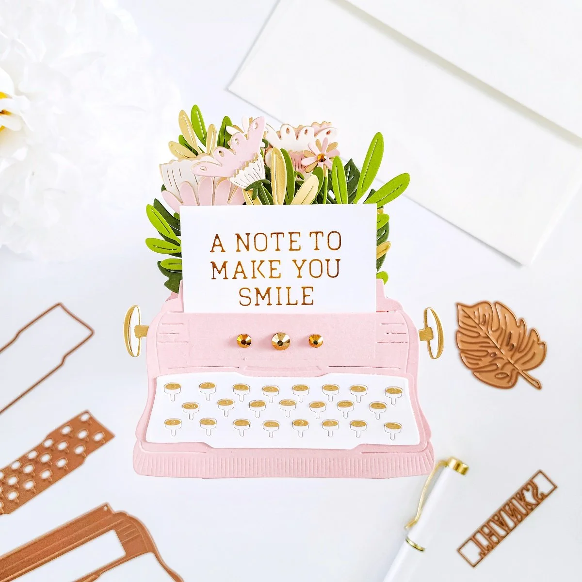 Once, I had the interactive and pop-up effect assembled to it, I went ahead to put the typewriter off to the side, so I could get the die-cutting for the flowers and leaves done using the dies including in the kit. To keep it simple, I used light and dark pink hues for the flowers along with gold cardstock to add a gold accent to them. Then, I used light and dark green hues along with gold cardstock to add gold accents to the greenery as well.
