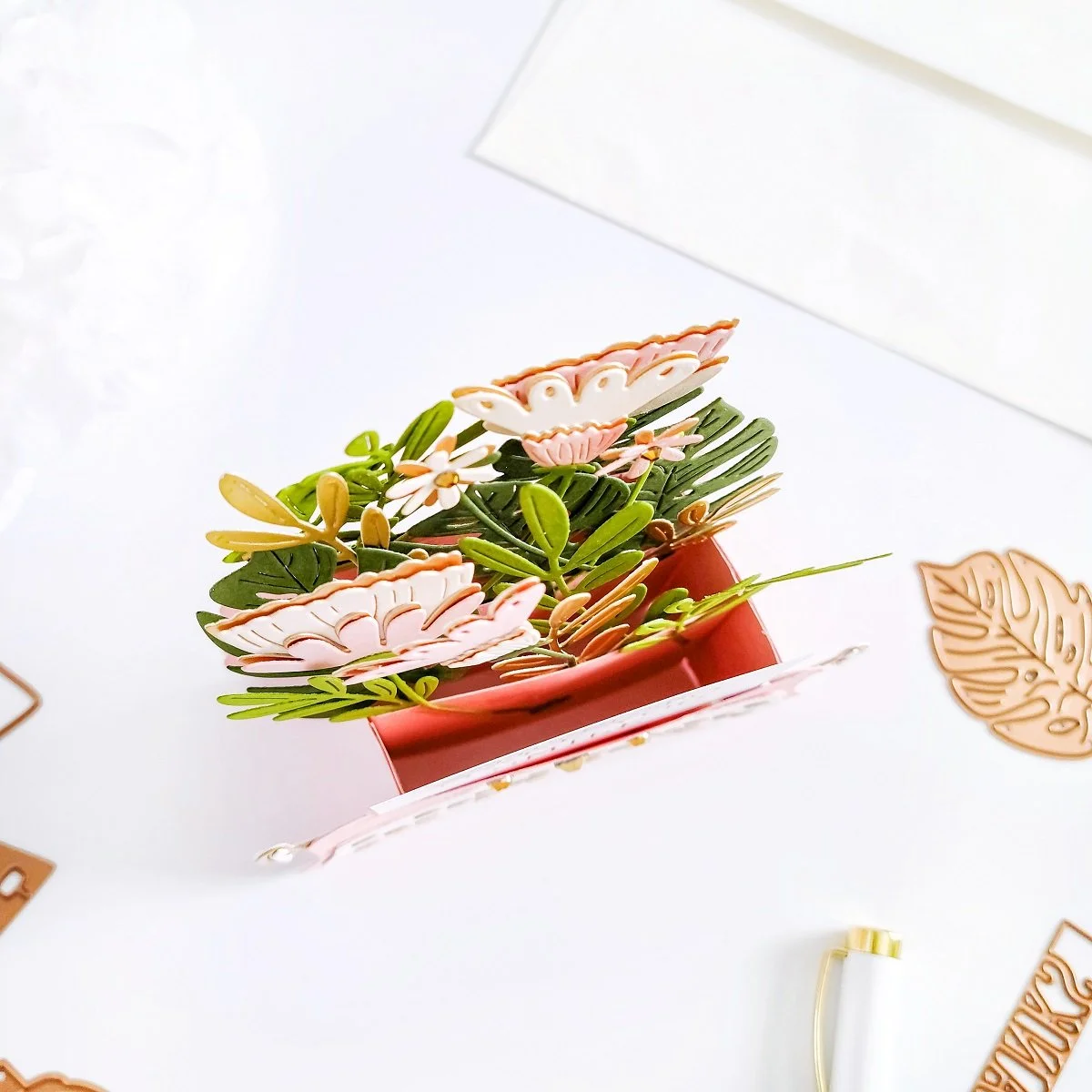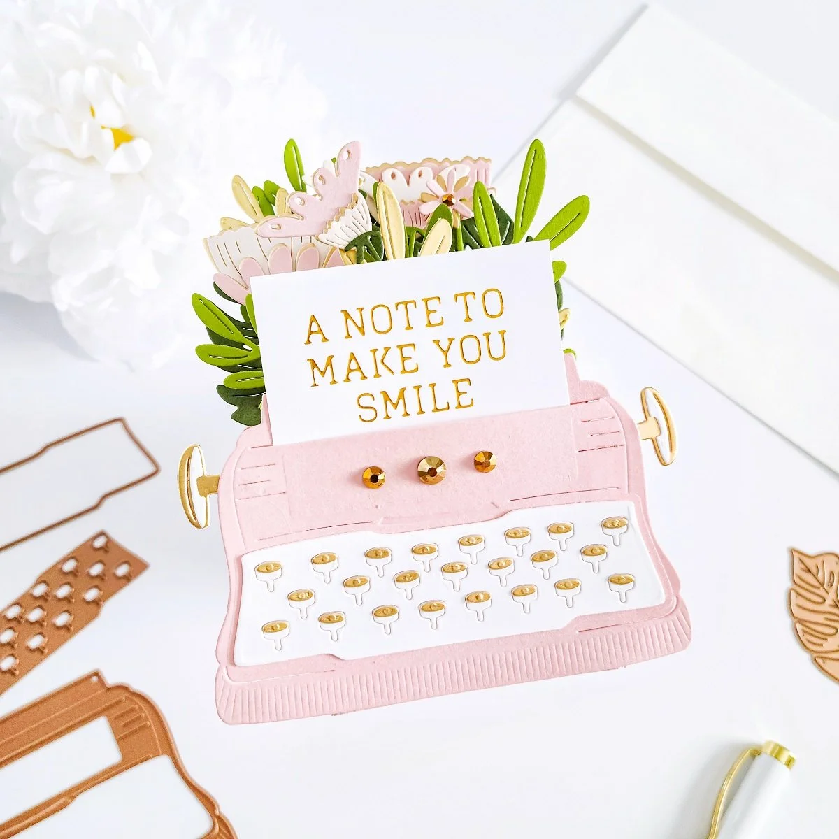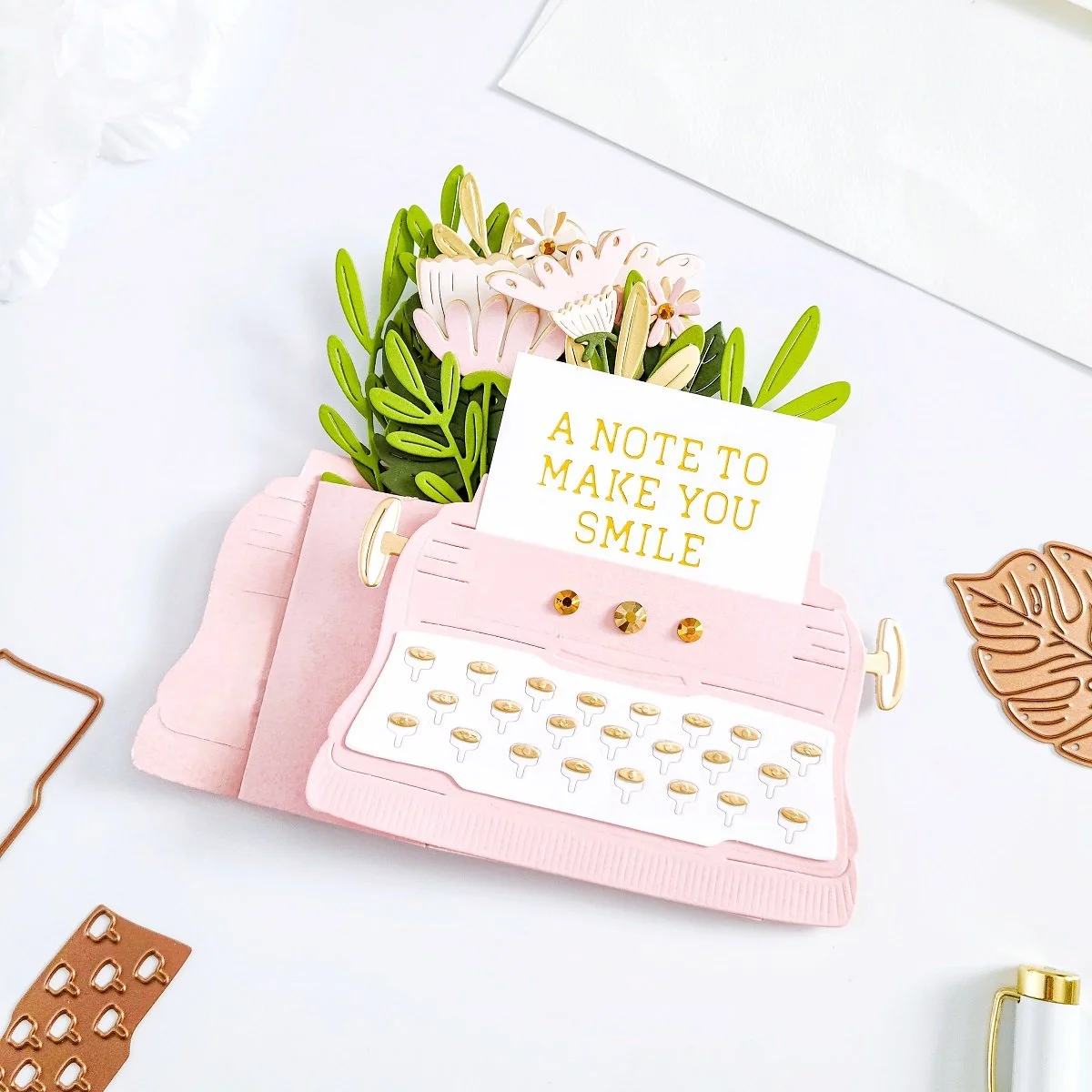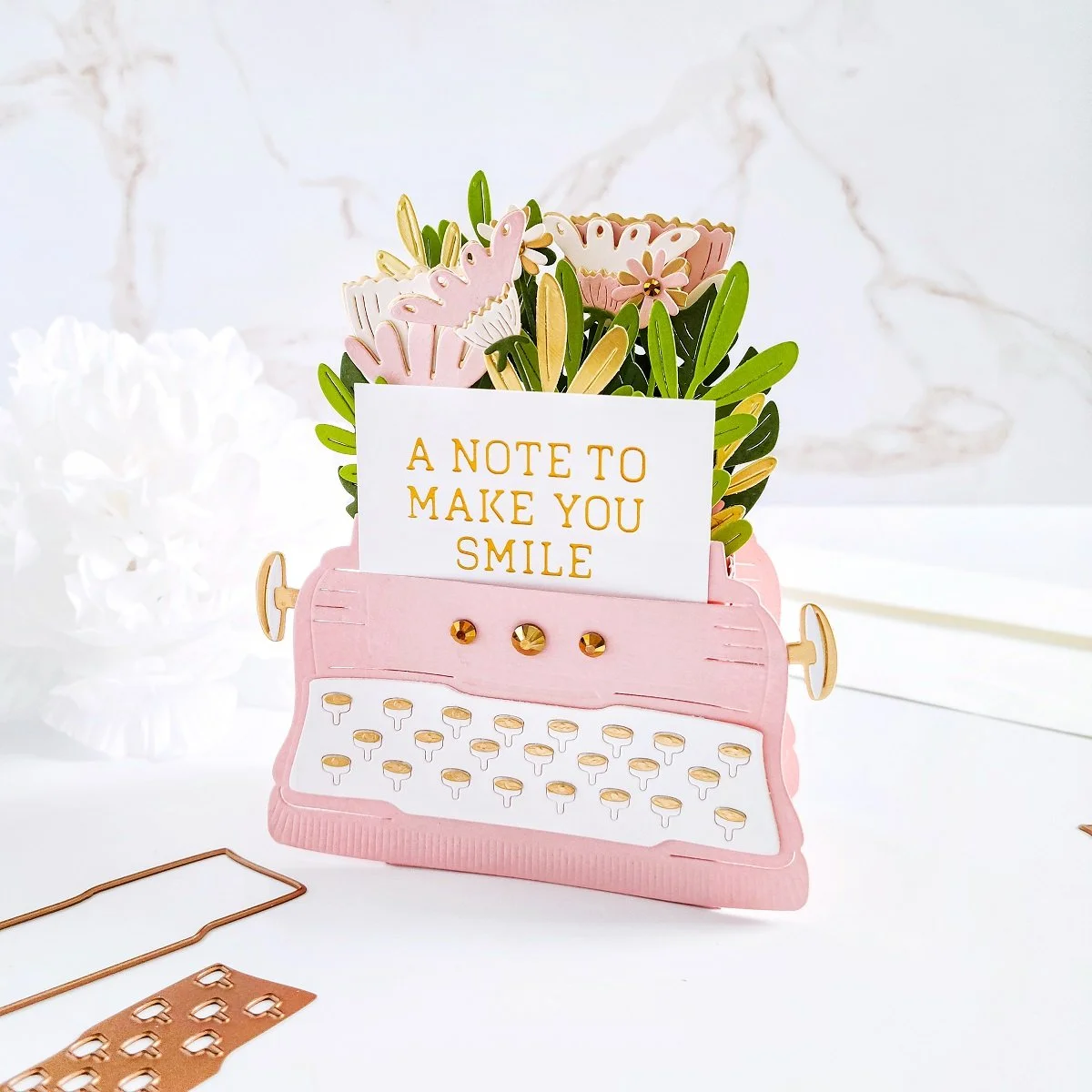 Once, I had the interactive and pop-up effect assembled to it, I went ahead to put the typewriter off to the side, so I could get the die-cutting for the flowers and leaves done using the dies including in the kit. To keep it simple, I used light and dark pink hues for the flowers along with gold cardstock to add a gold accent to them. Then, I used light and dark green hues along with gold cardstock to add gold accents to the greenery as well.
